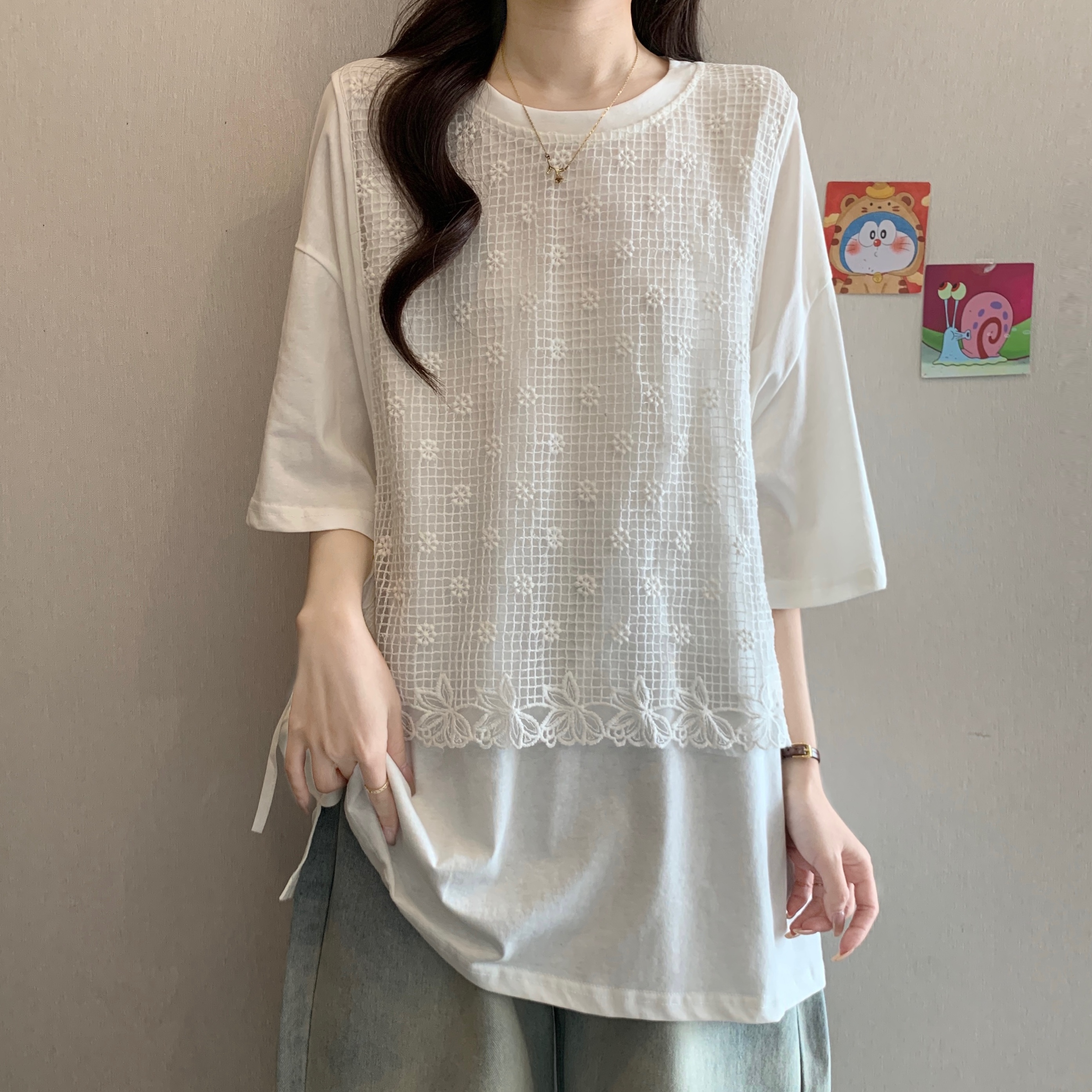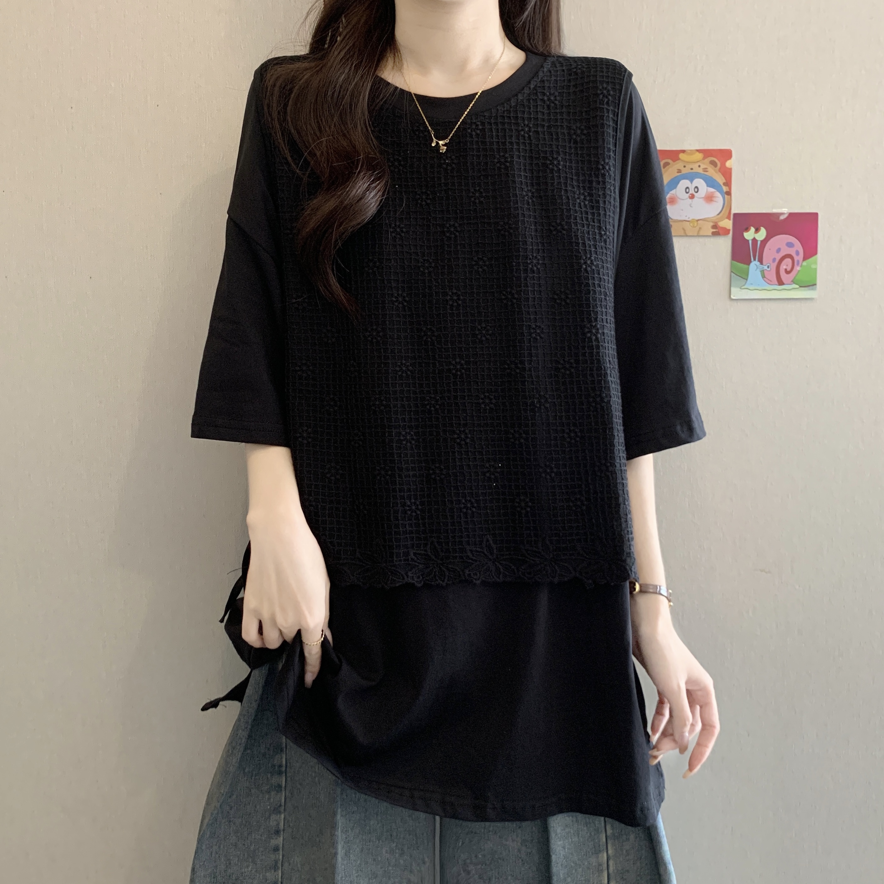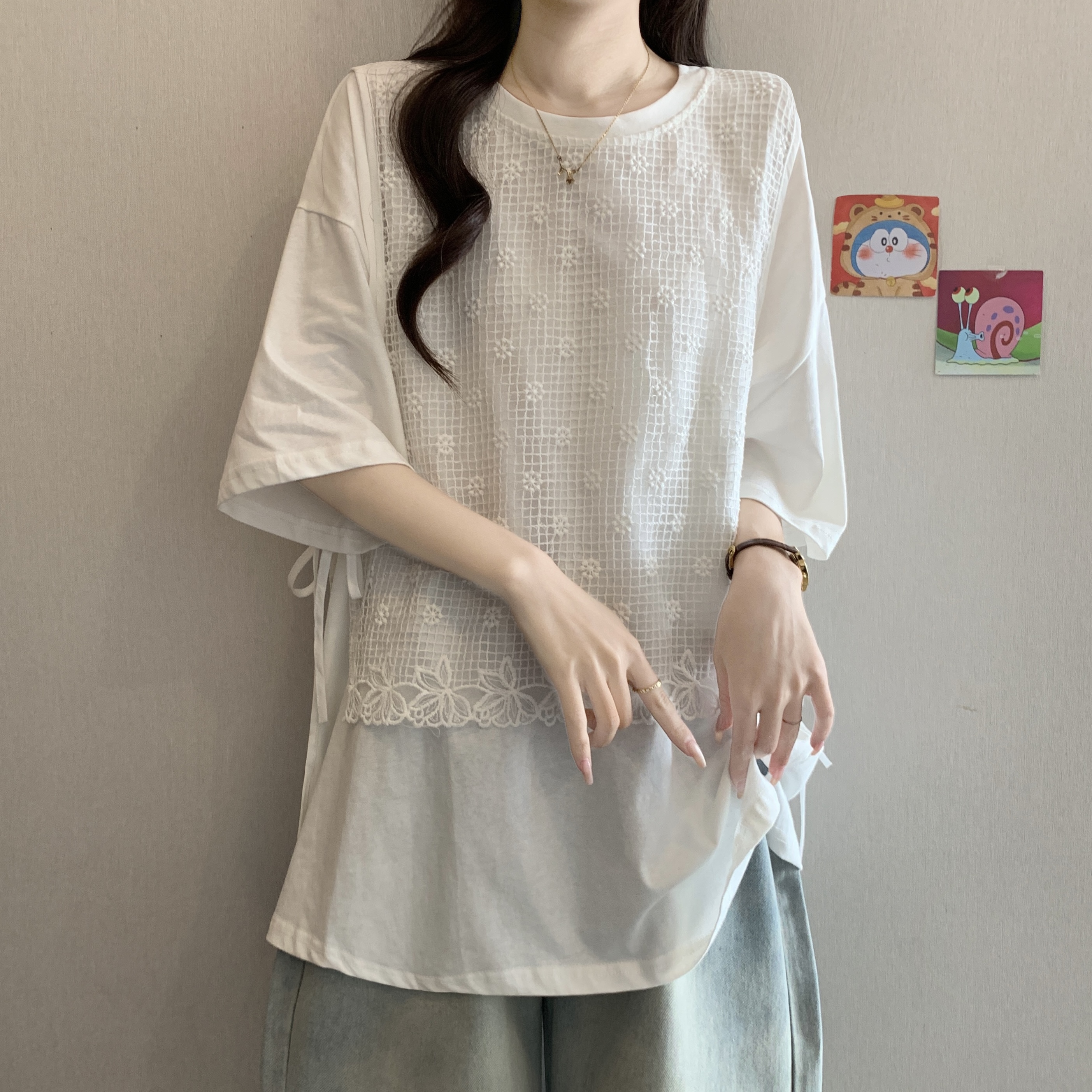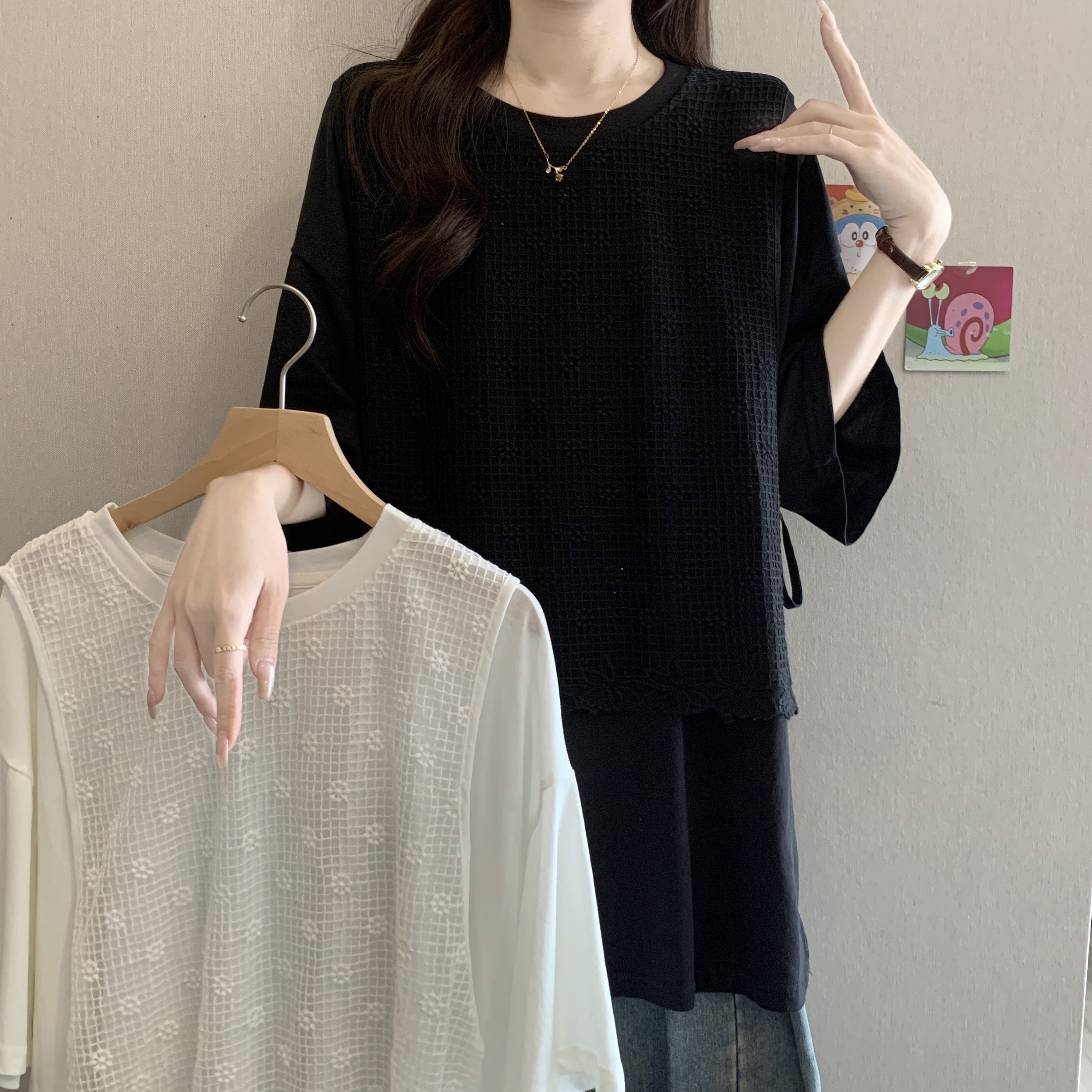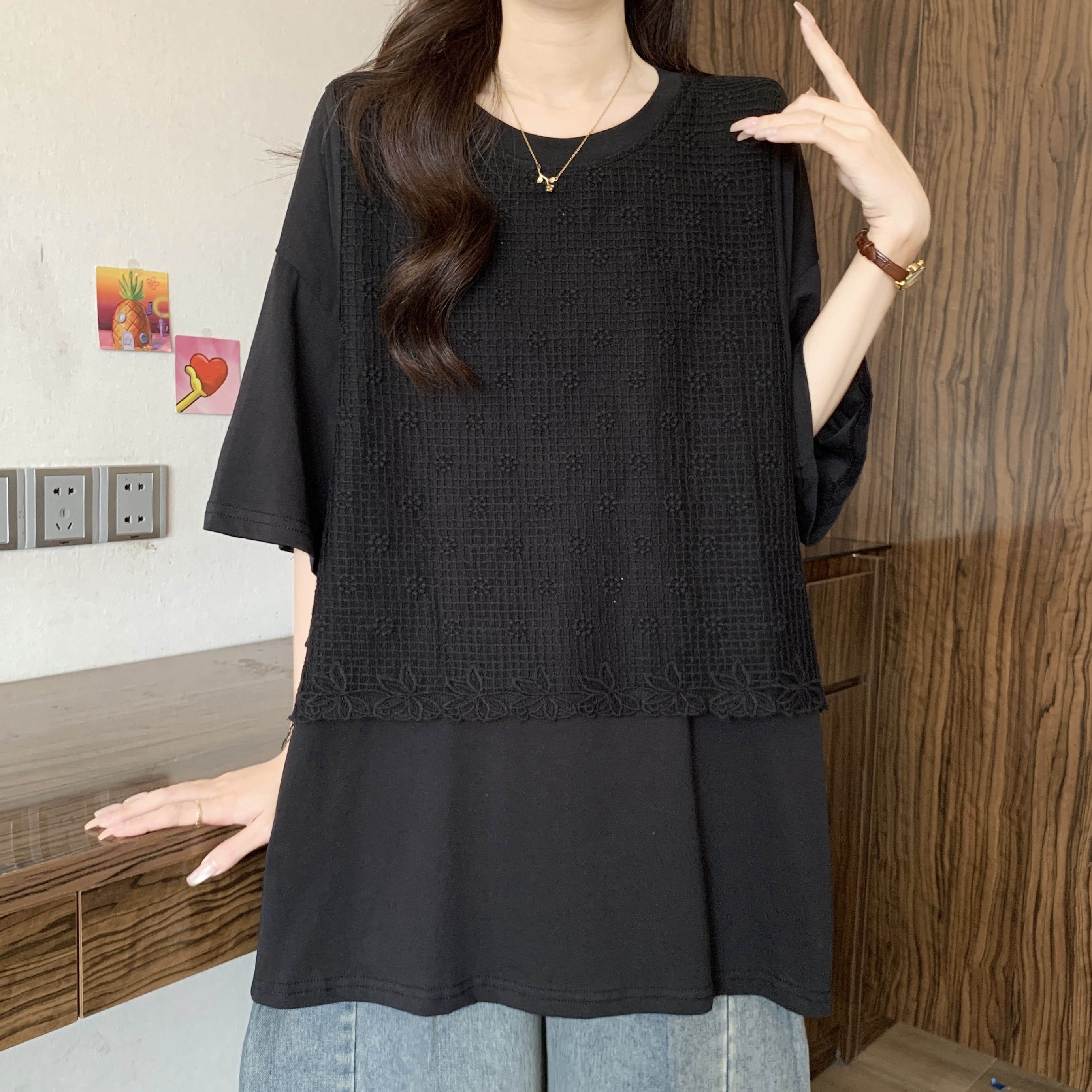실사 빅 사이즈 새로운 디자인 센스 지방 mm 캐주얼 루즈핏 레이스 패치워크 페이크 레이어드 다용도 슬림해 보이는 맨위 여성
