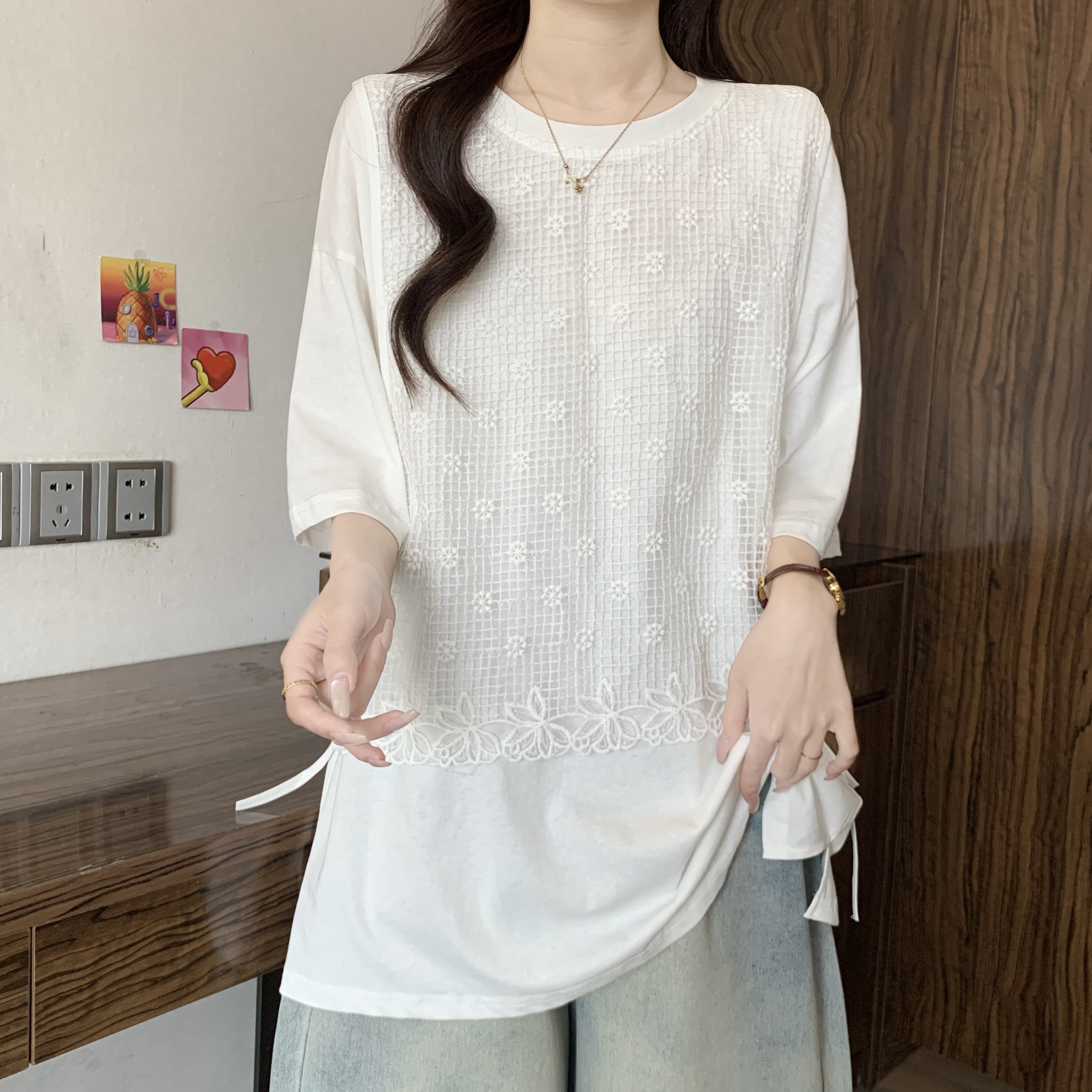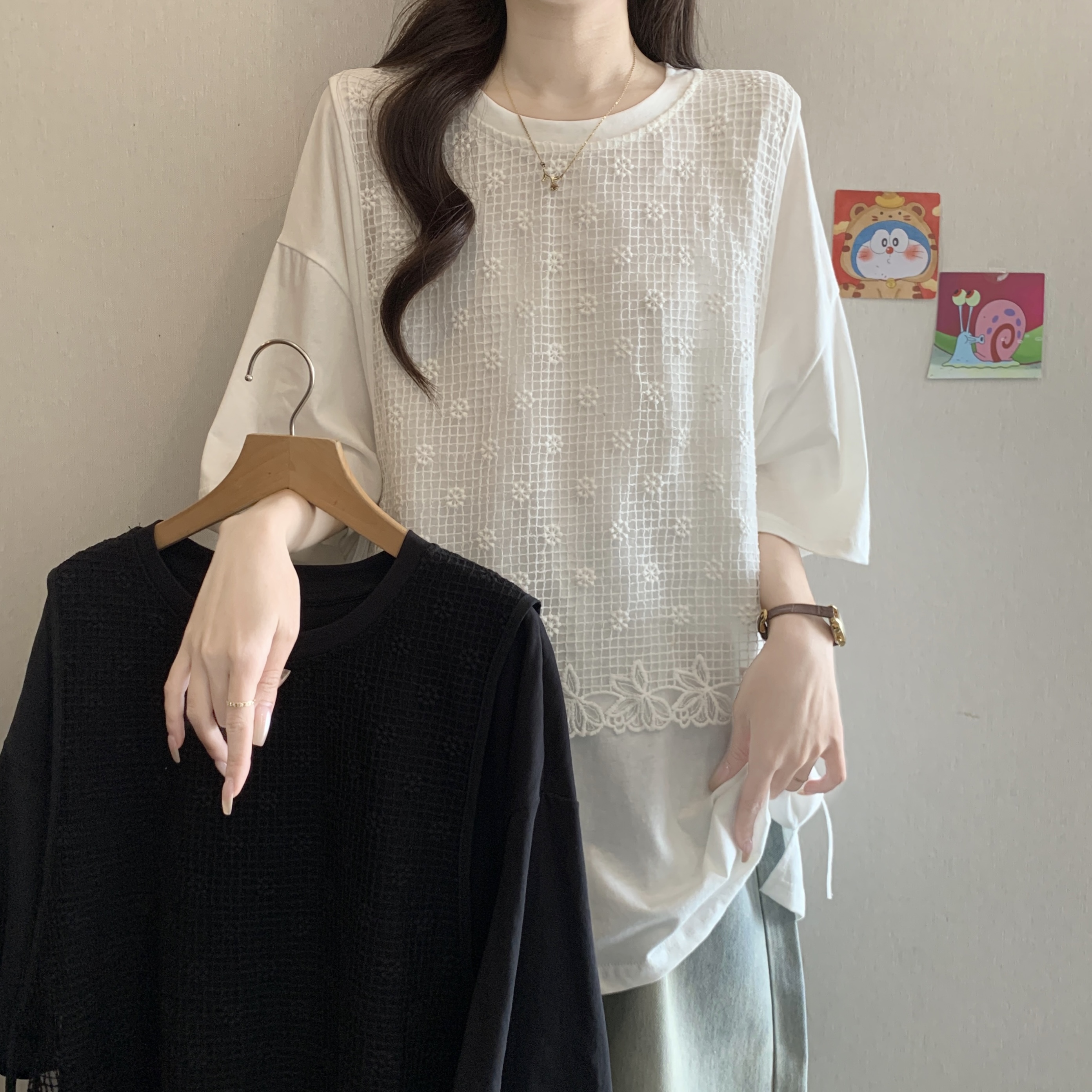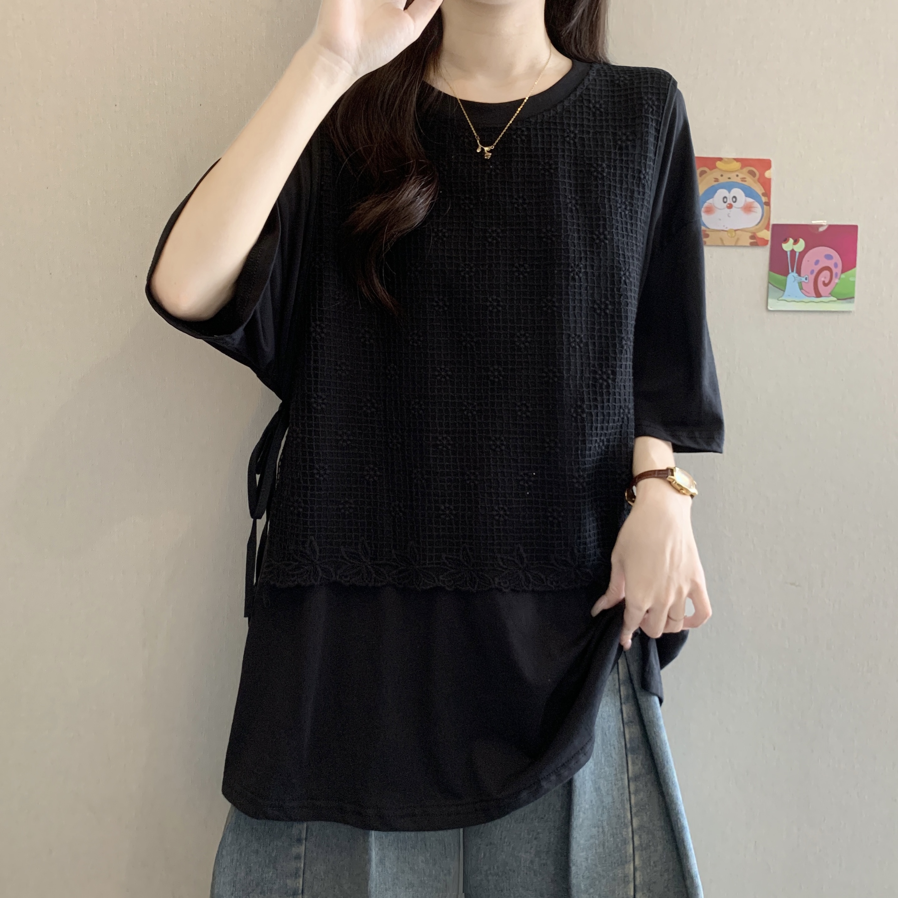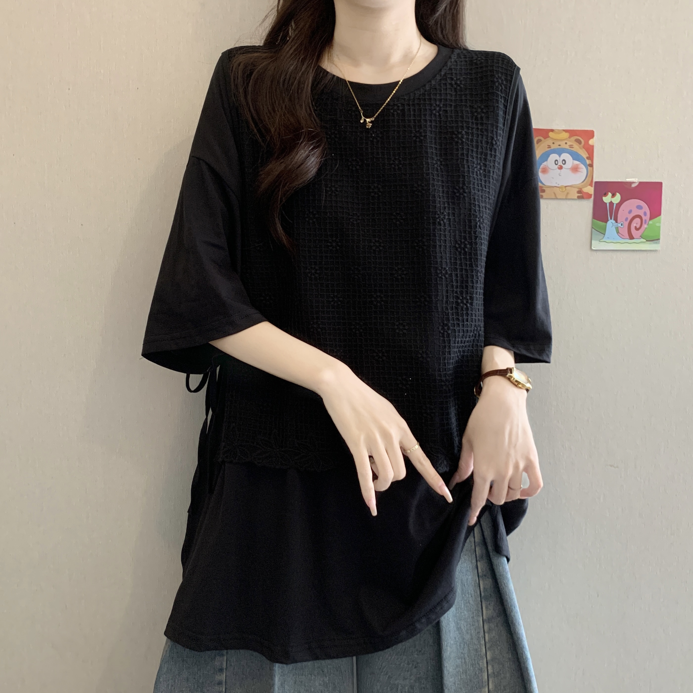 실사 빅 사이즈 새로운 디자인 센스 지방 mm 레이스 밑단 불규칙 패치워크 맨위 슬림해 보이는 다용도 티셔츠 여성