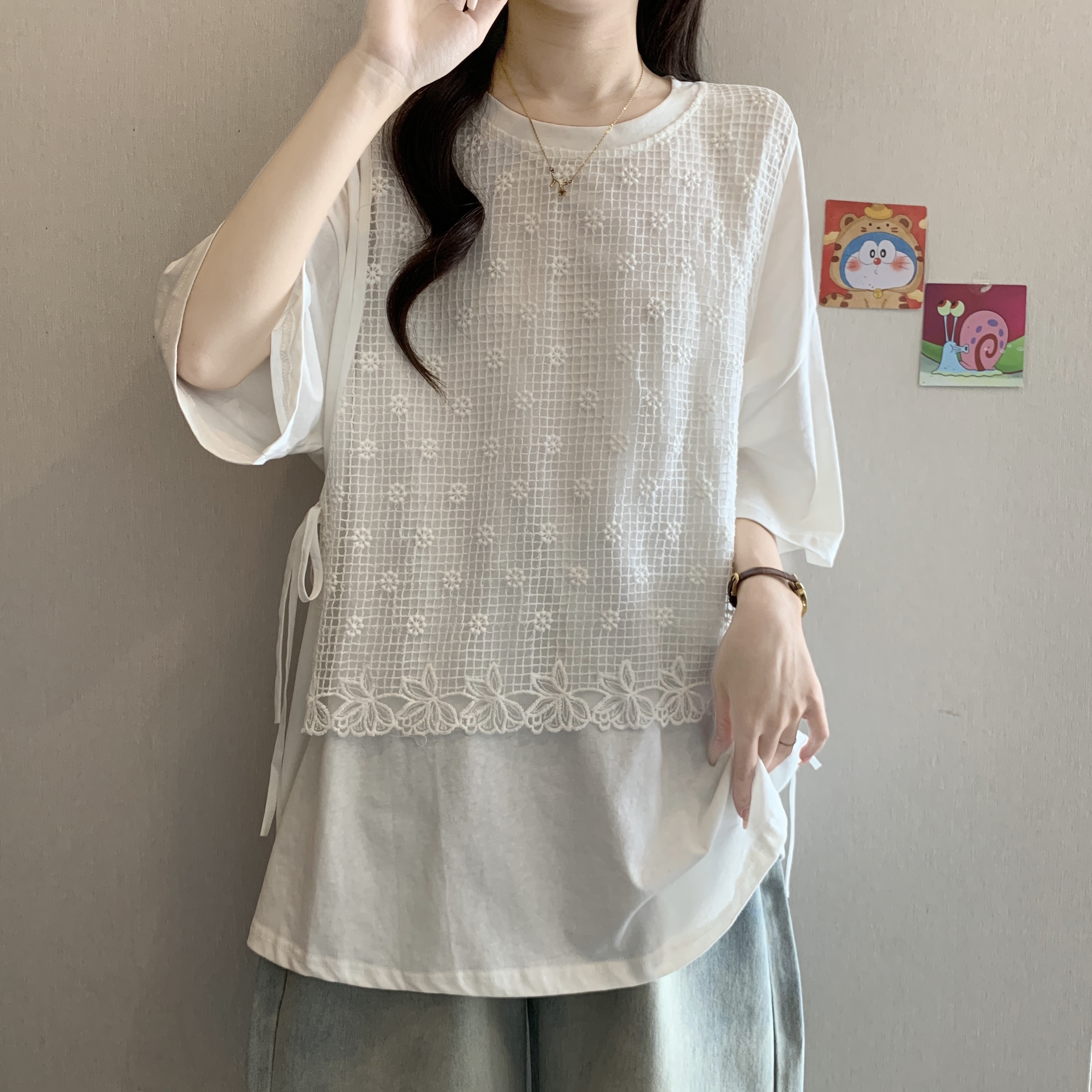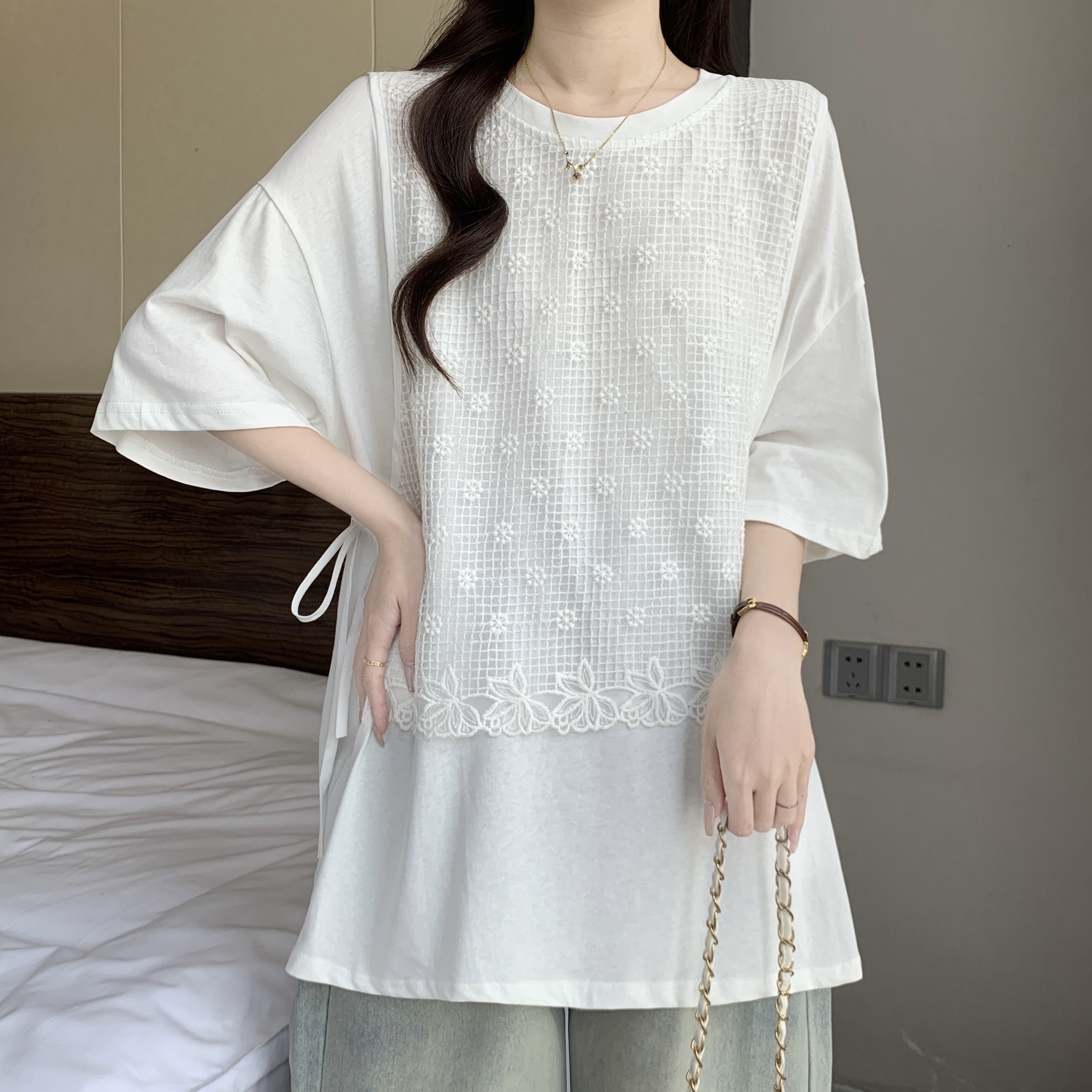 실사 빅 사이즈 새로운 디자인 센스 지방 mm 레이스 레이스 긍정적 인 어깨 의류 슬림해 보이는 다용도 티셔츠 여성 여름