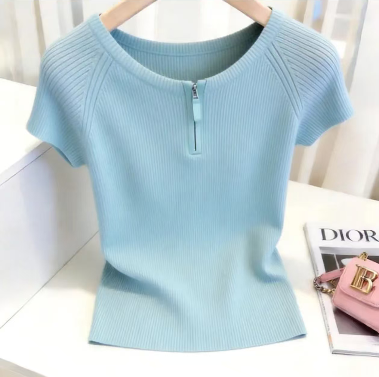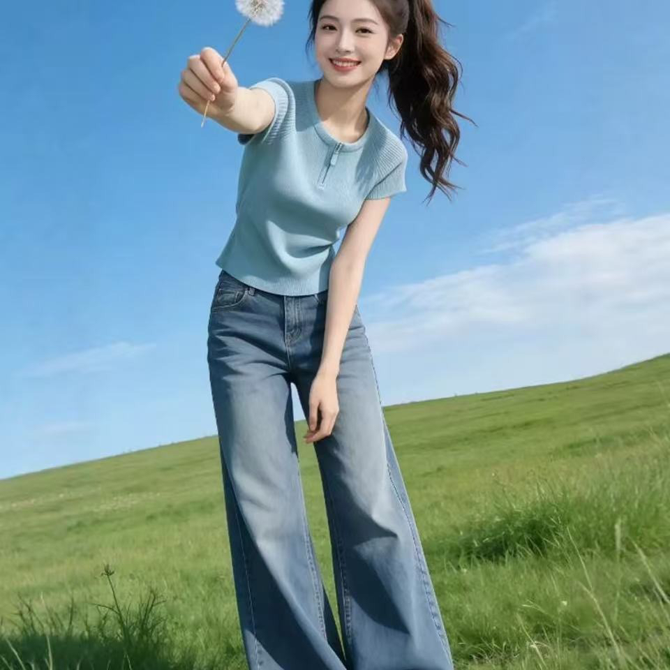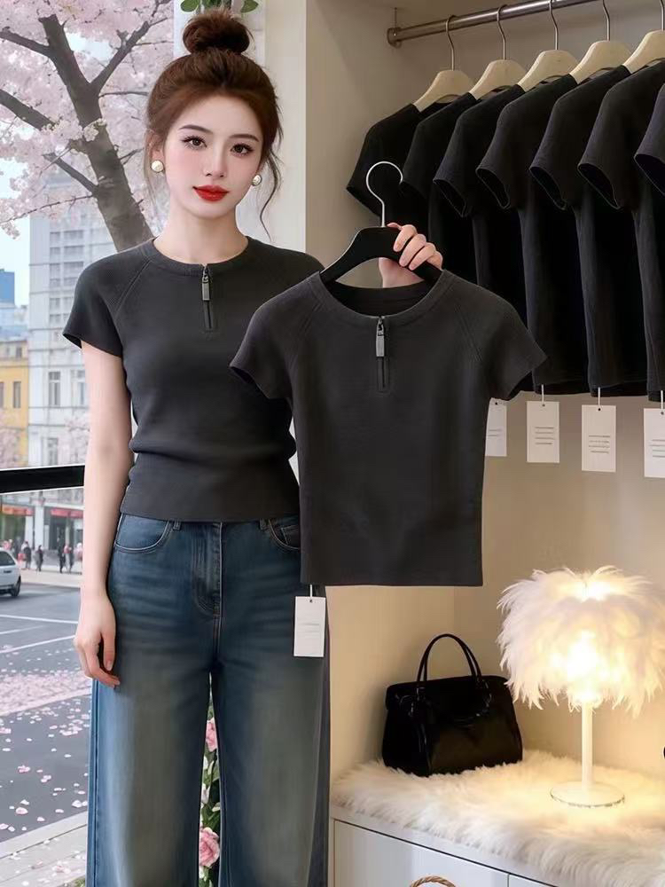 하늘색 라운드 넥 하프 지퍼 꼬집기 허리 반팔 티셔츠 여성 2026 여름 캐주얼 다용도 자이언트 잘 생긴 아름다운 맨위