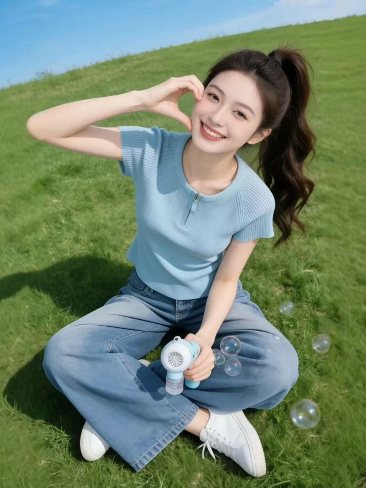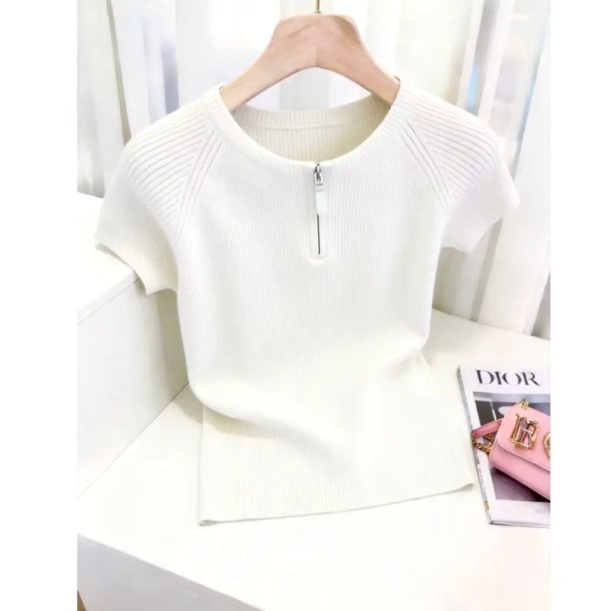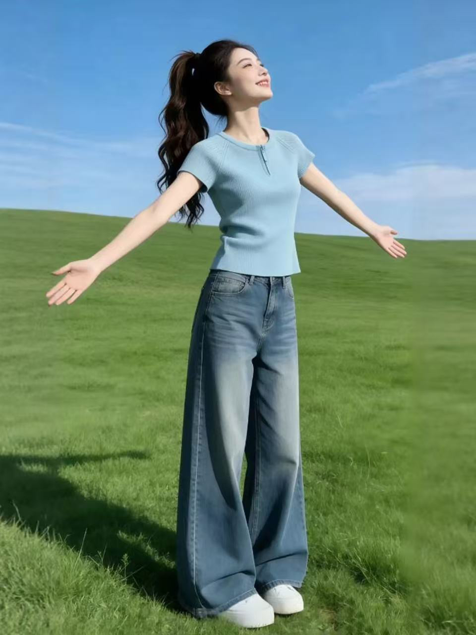 하늘색 라운드 넥 하프 지퍼 꼬집기 허리 반팔 티셔츠 여성 2026 여름 캐주얼 다용도 자이언트 잘 생긴 아름다운 맨위