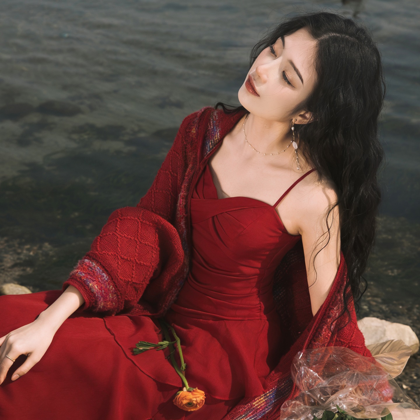 언어 그리스어 실사 빨간색 슬립 드레스 코디 재킷 투피스 세트 세트