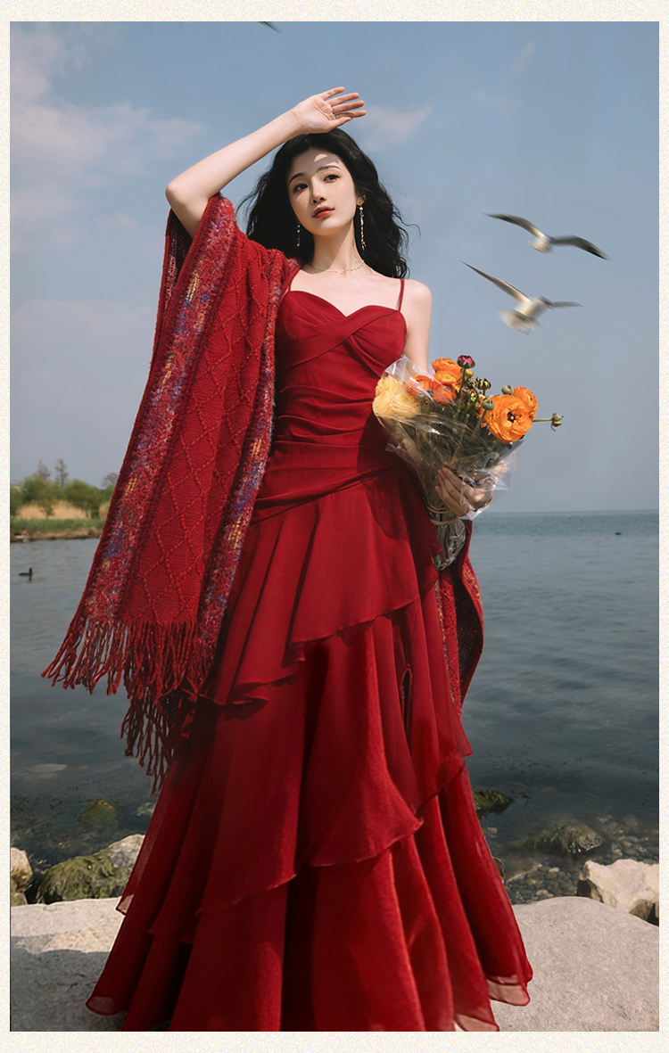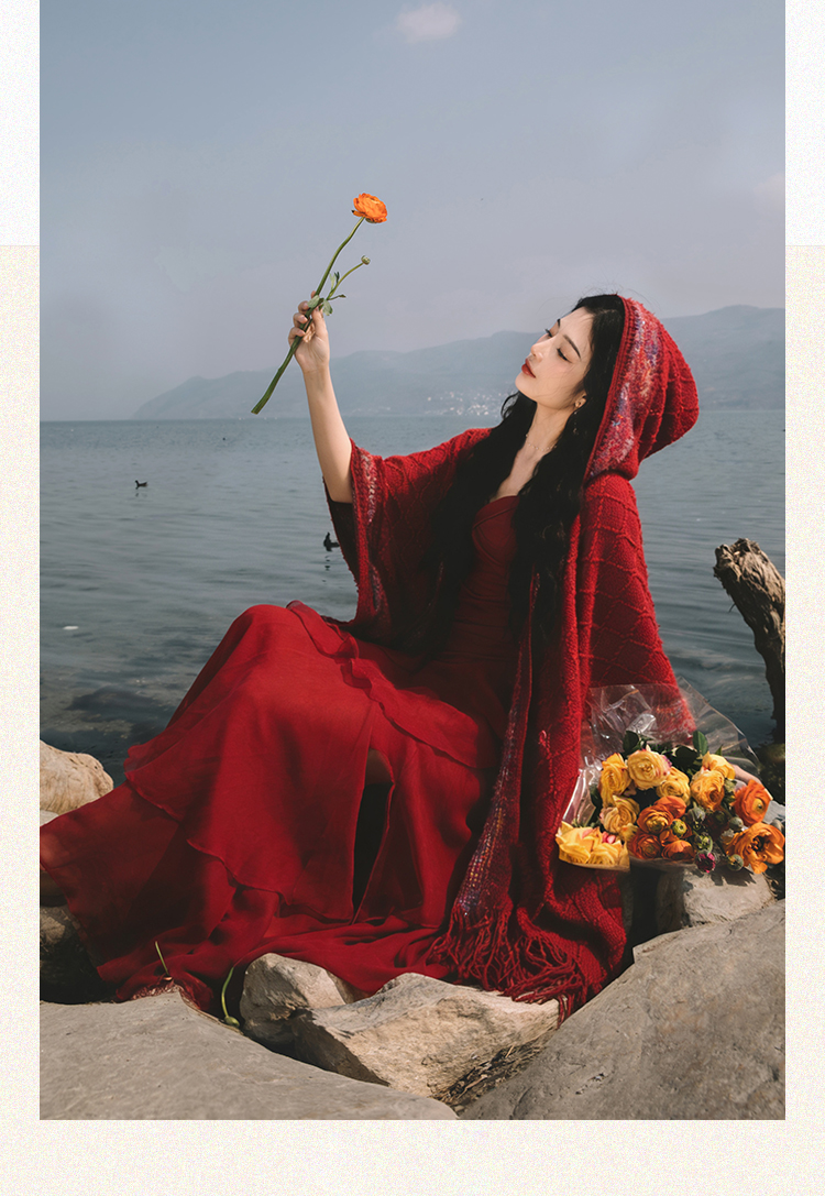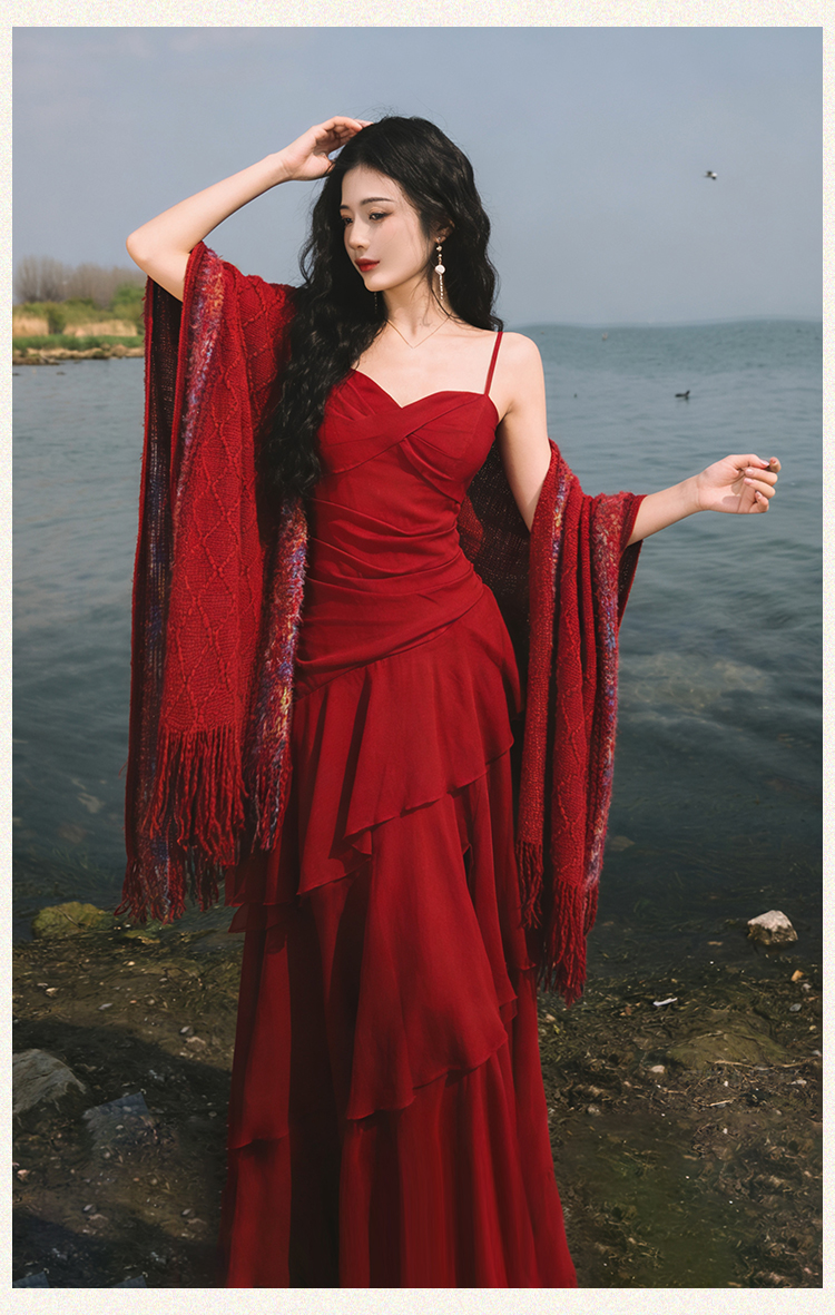 언어 그리스어 진짜 사진 찍기 새로운 빨간색 불규칙 케이크 트임 슬립 드레스 코디 후드 숄 투피스 세트 휴가 치마