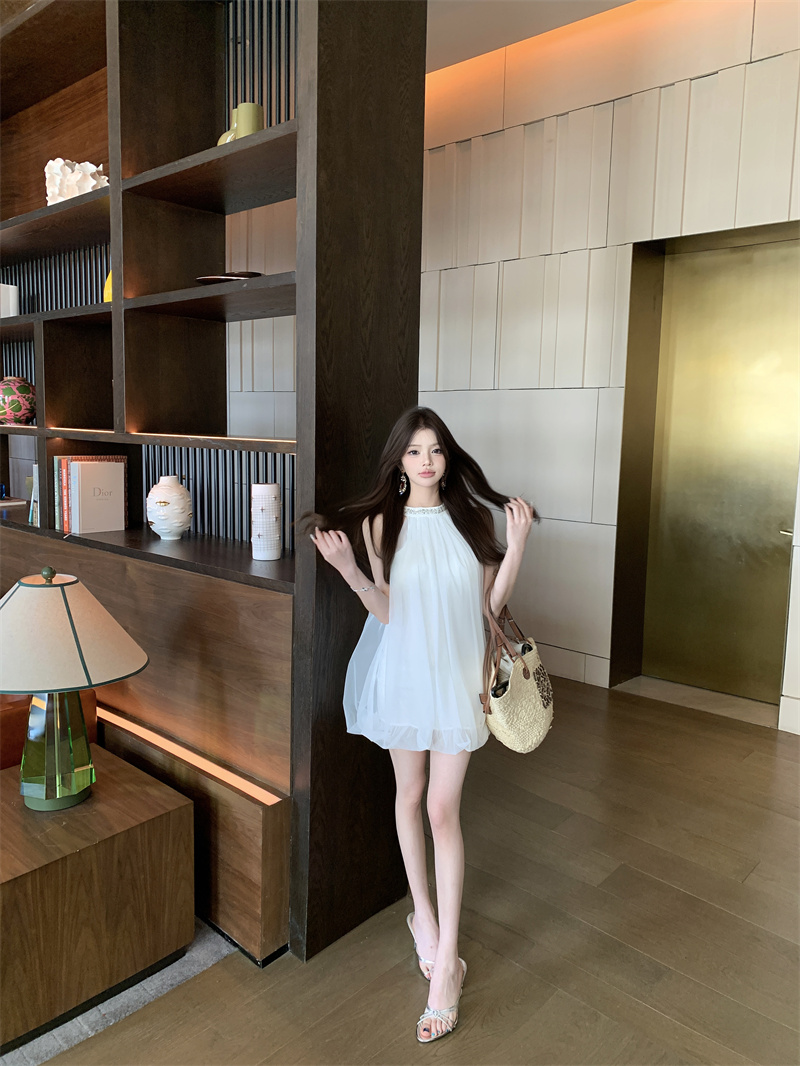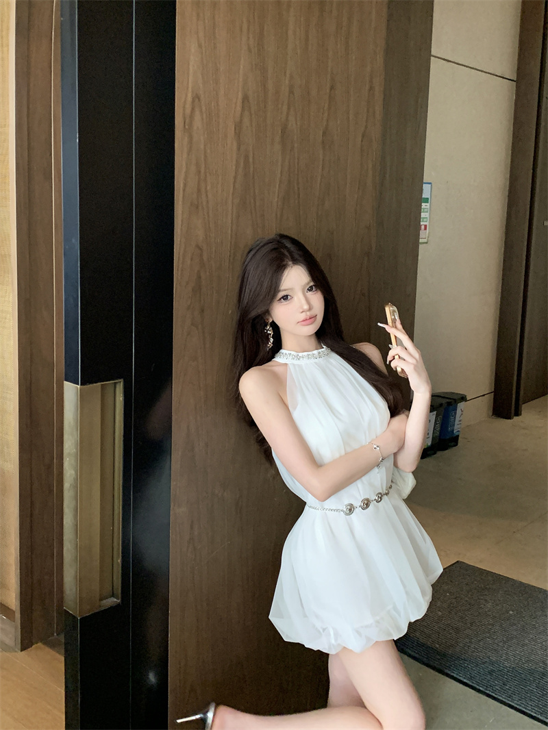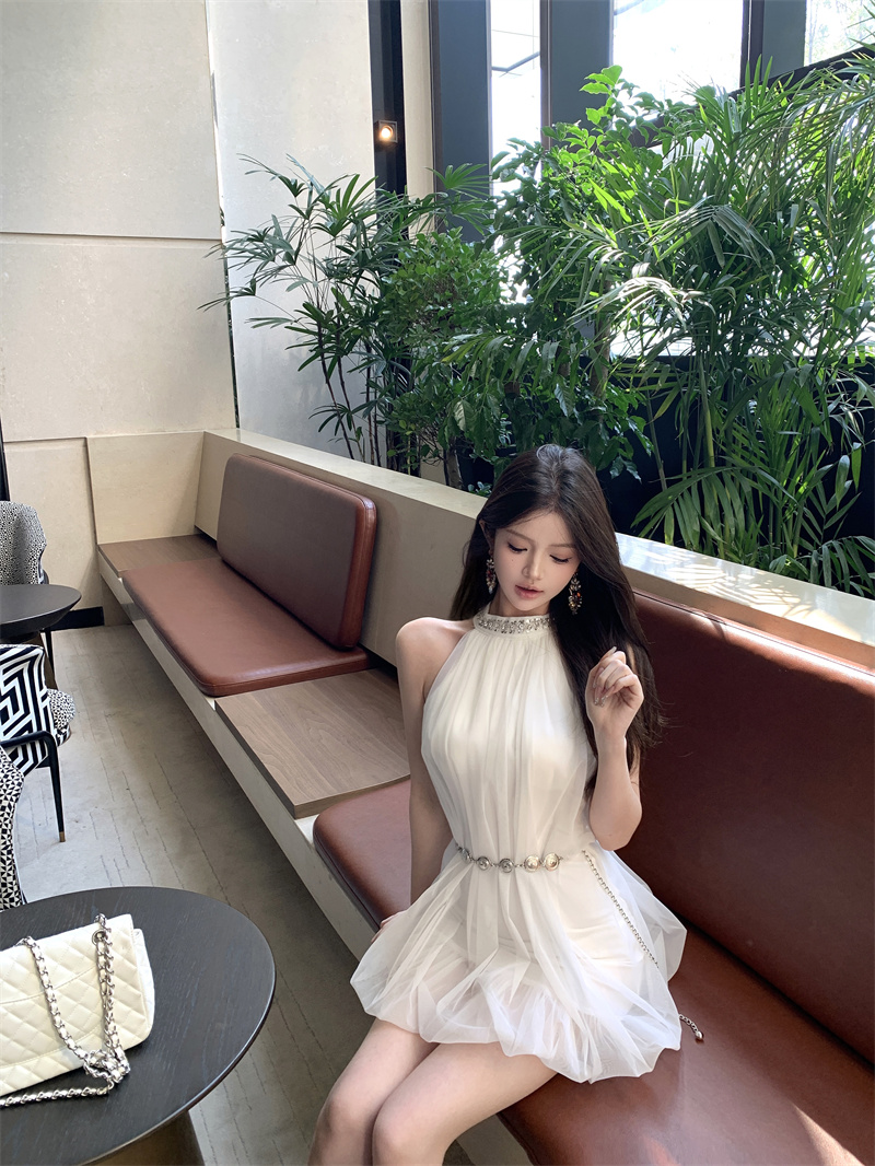 실사 브 룩 스 유명 무거운 작업 분위기 센스 다이아몬드 세팅 행침 목 슬립 망사 민소매 쇼트 스타일 드레스