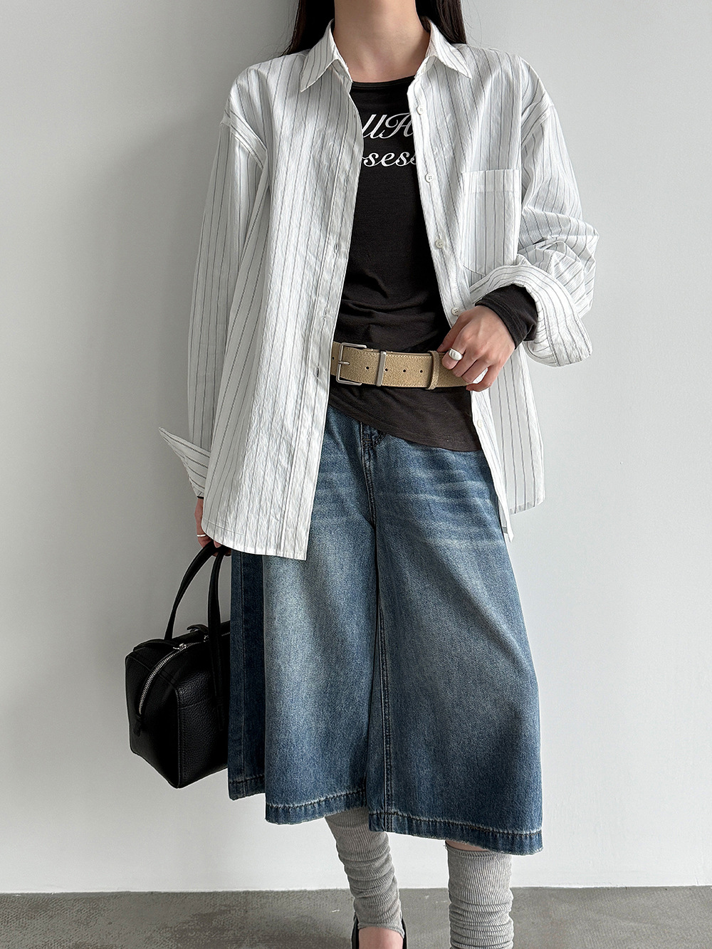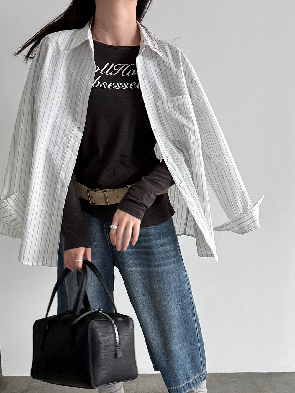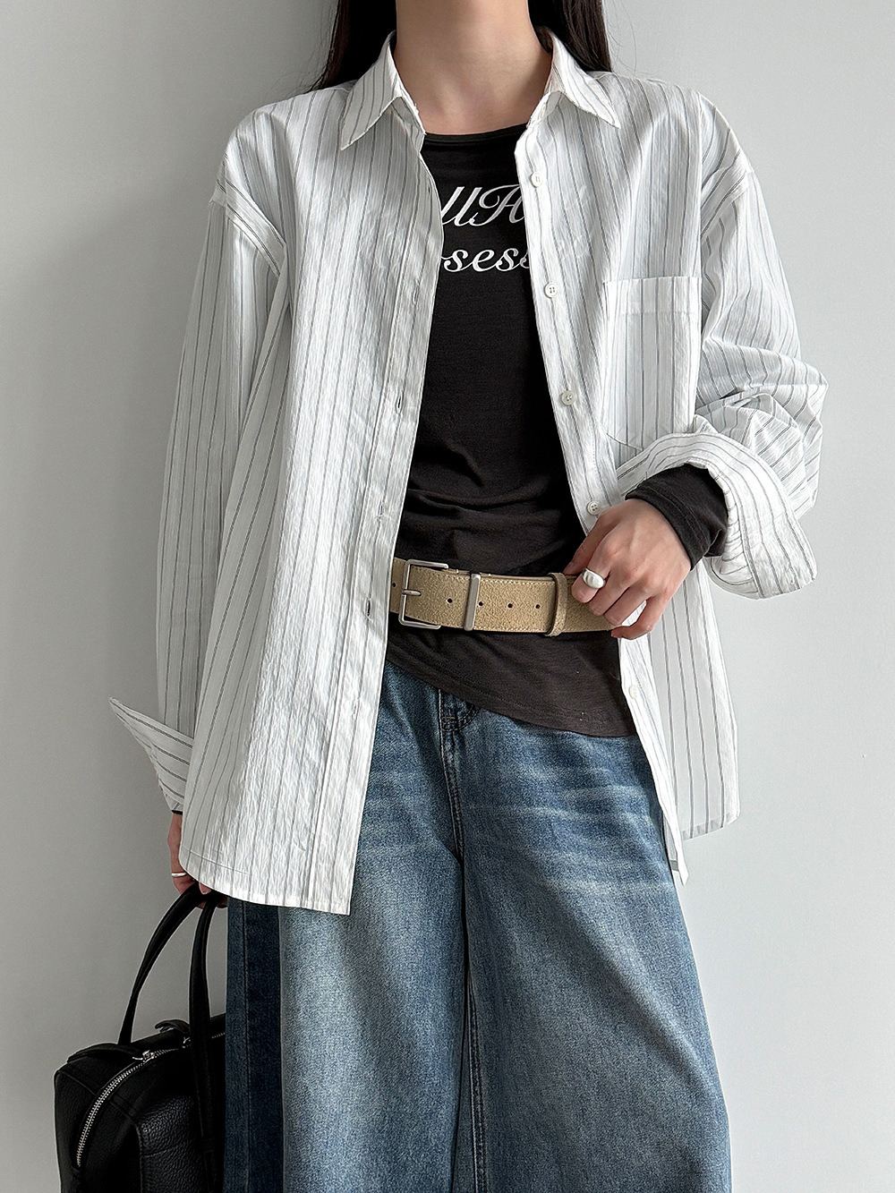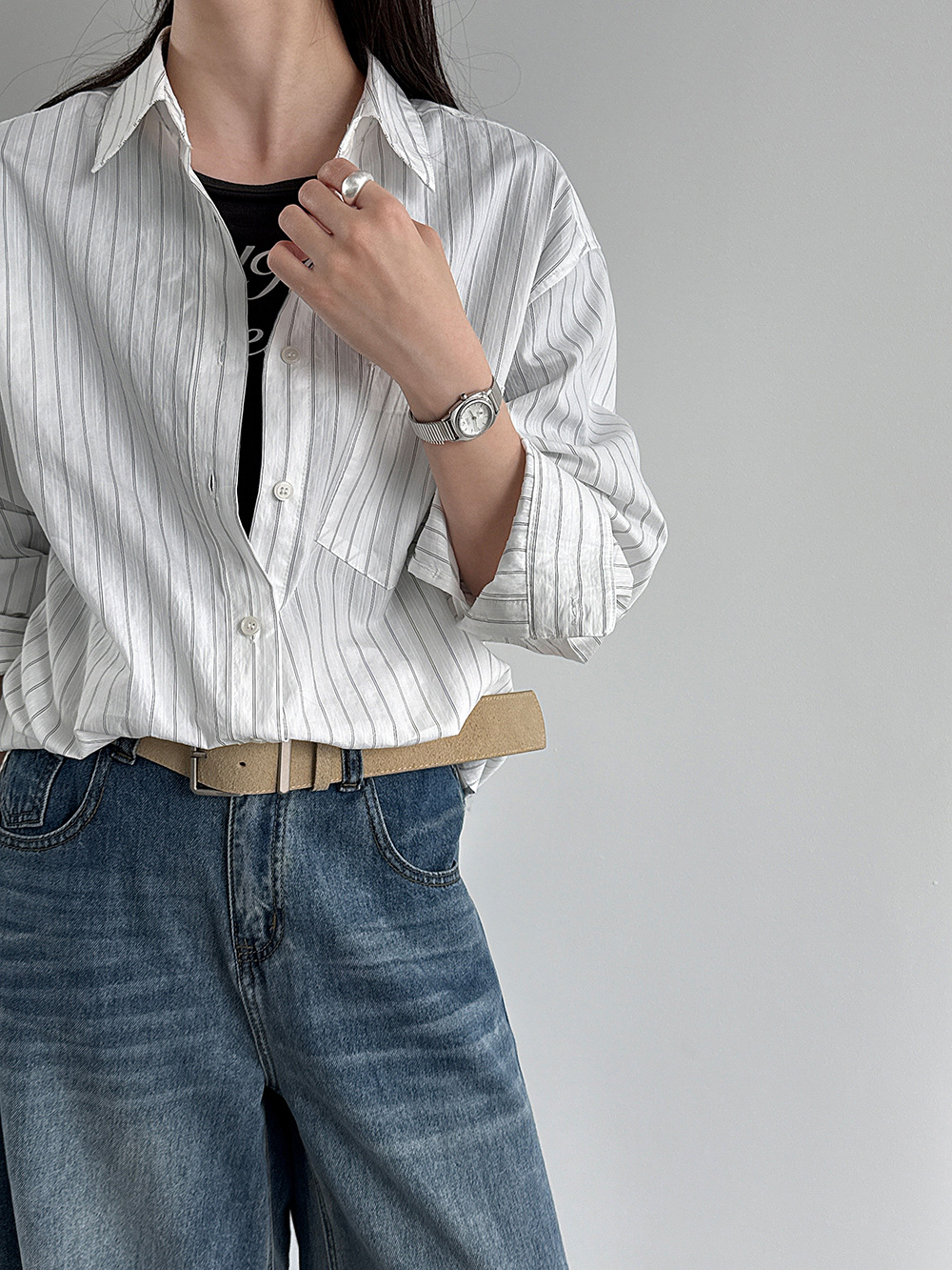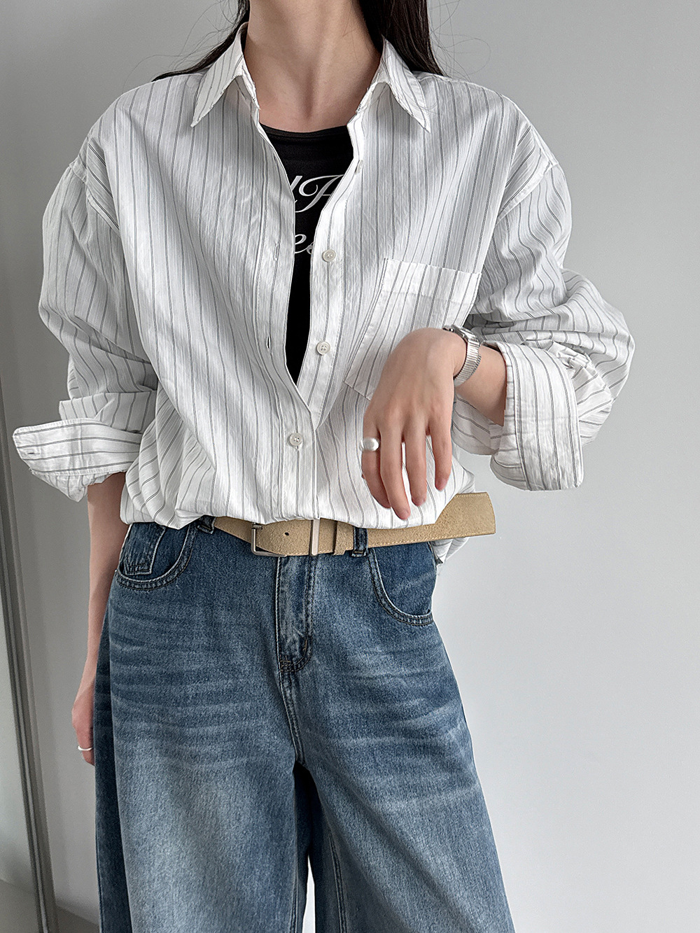 미니멀리즘 다용도 긍정적 인 어깨 이중층 볼륨 측면 라운드 넥 티셔츠 26 봄 새로운 단추 디자인 센스 긴팔