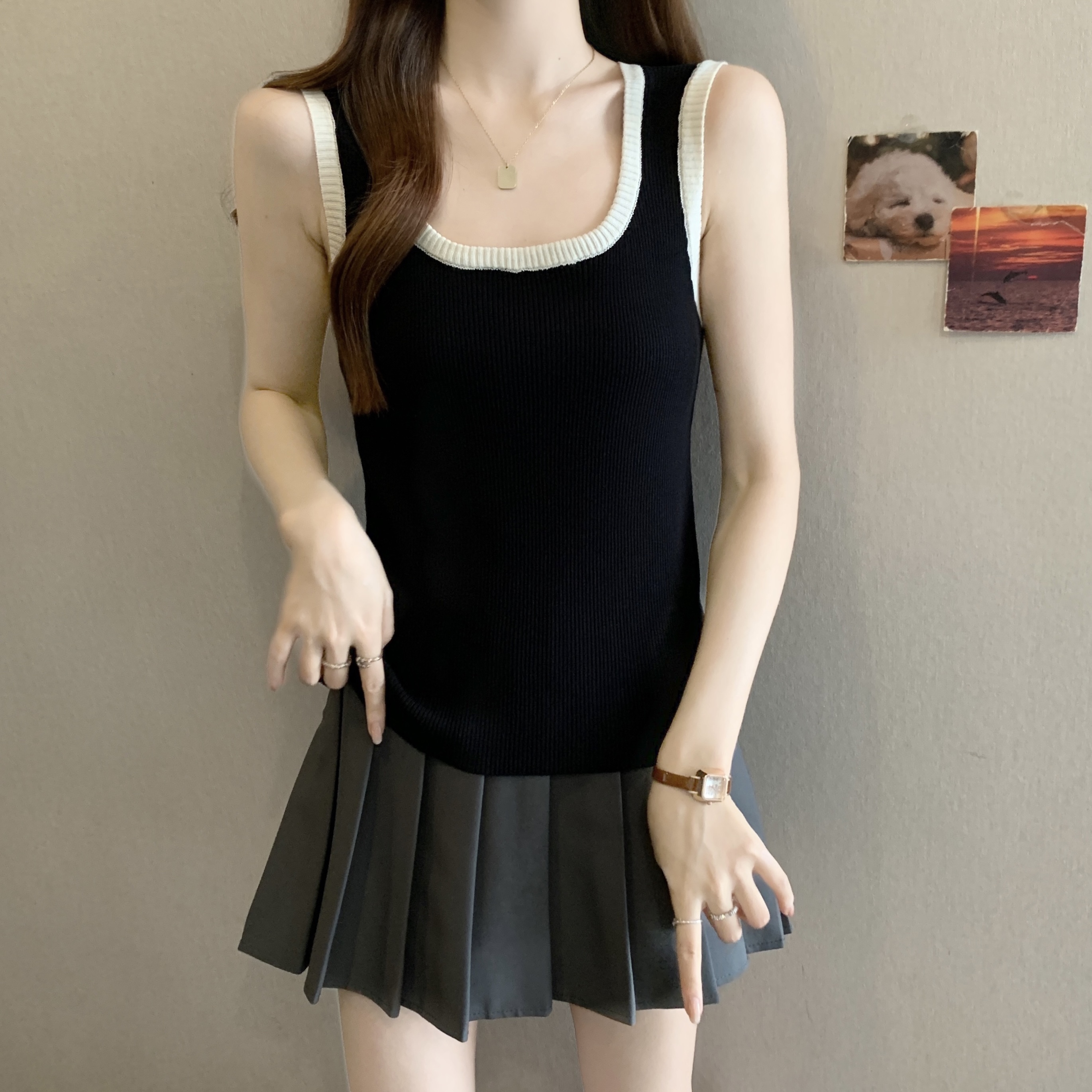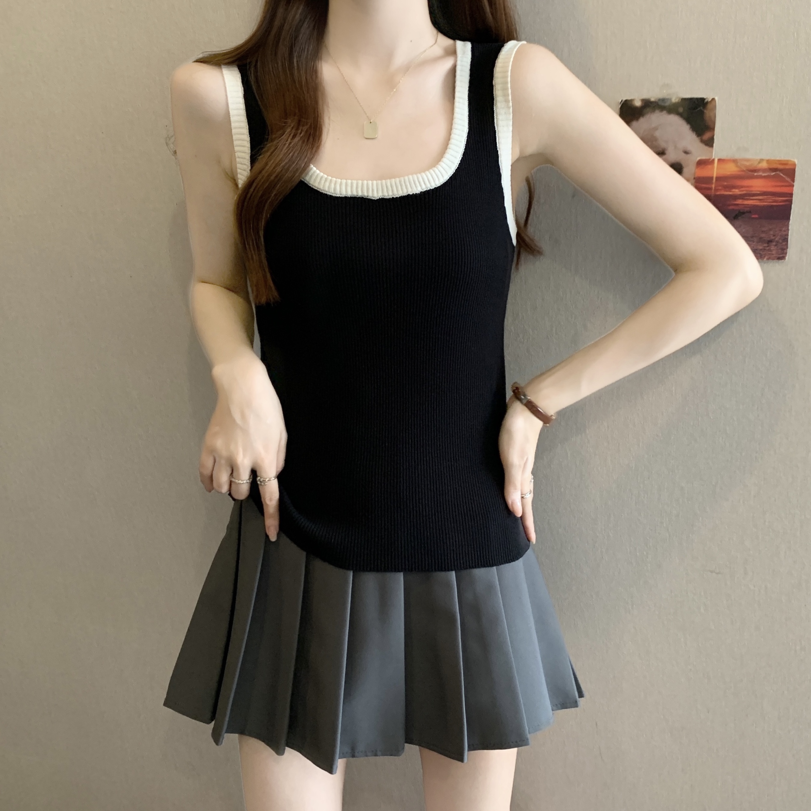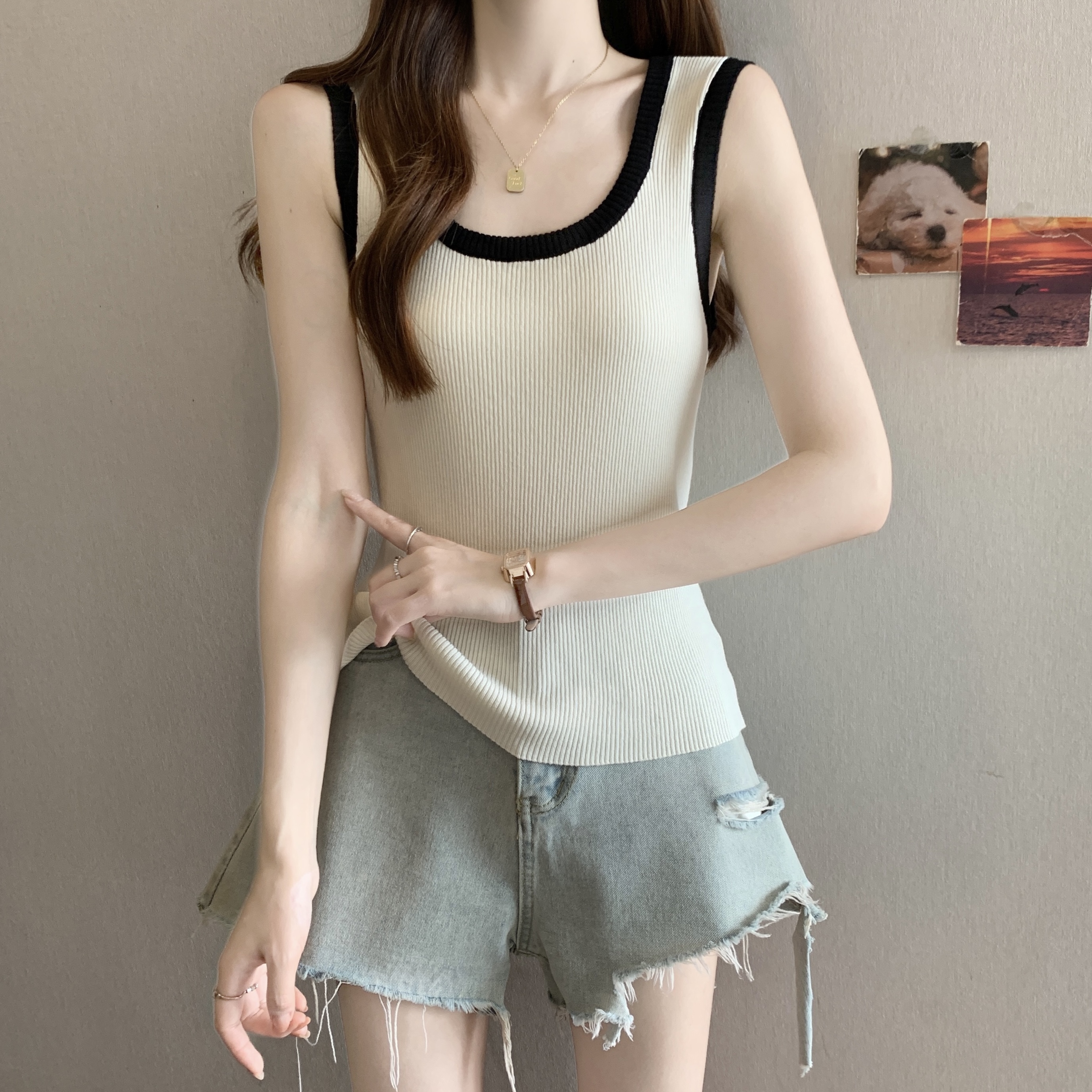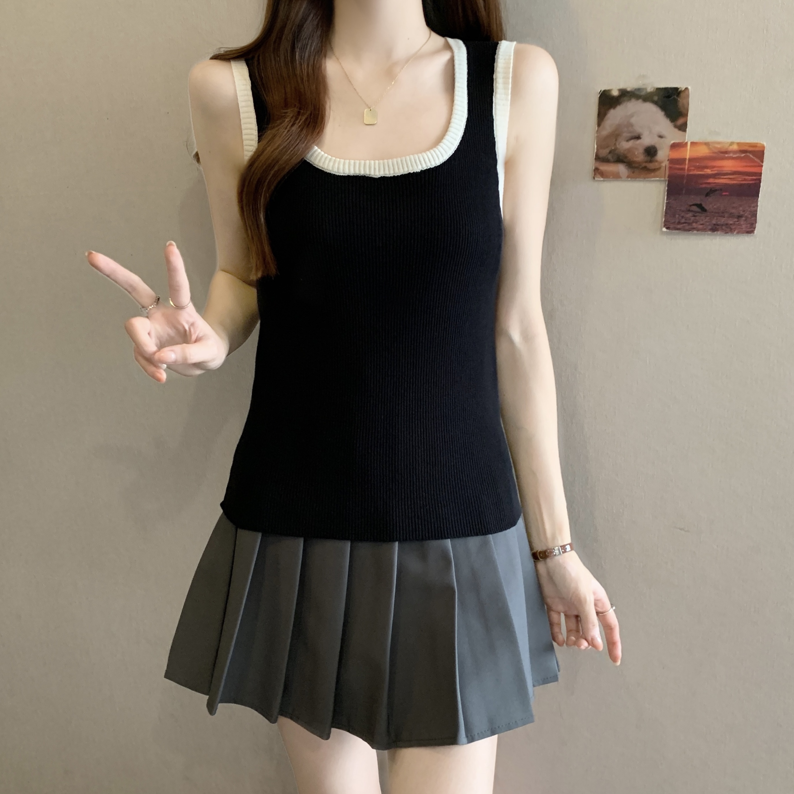 실사 빅 사이즈 지방 mm 새로운 디자인 센스 달콤한 스타일 미니멀리즘 노출 방지 조끼 슬립 슬림해 보이는 표지 고기 맨위