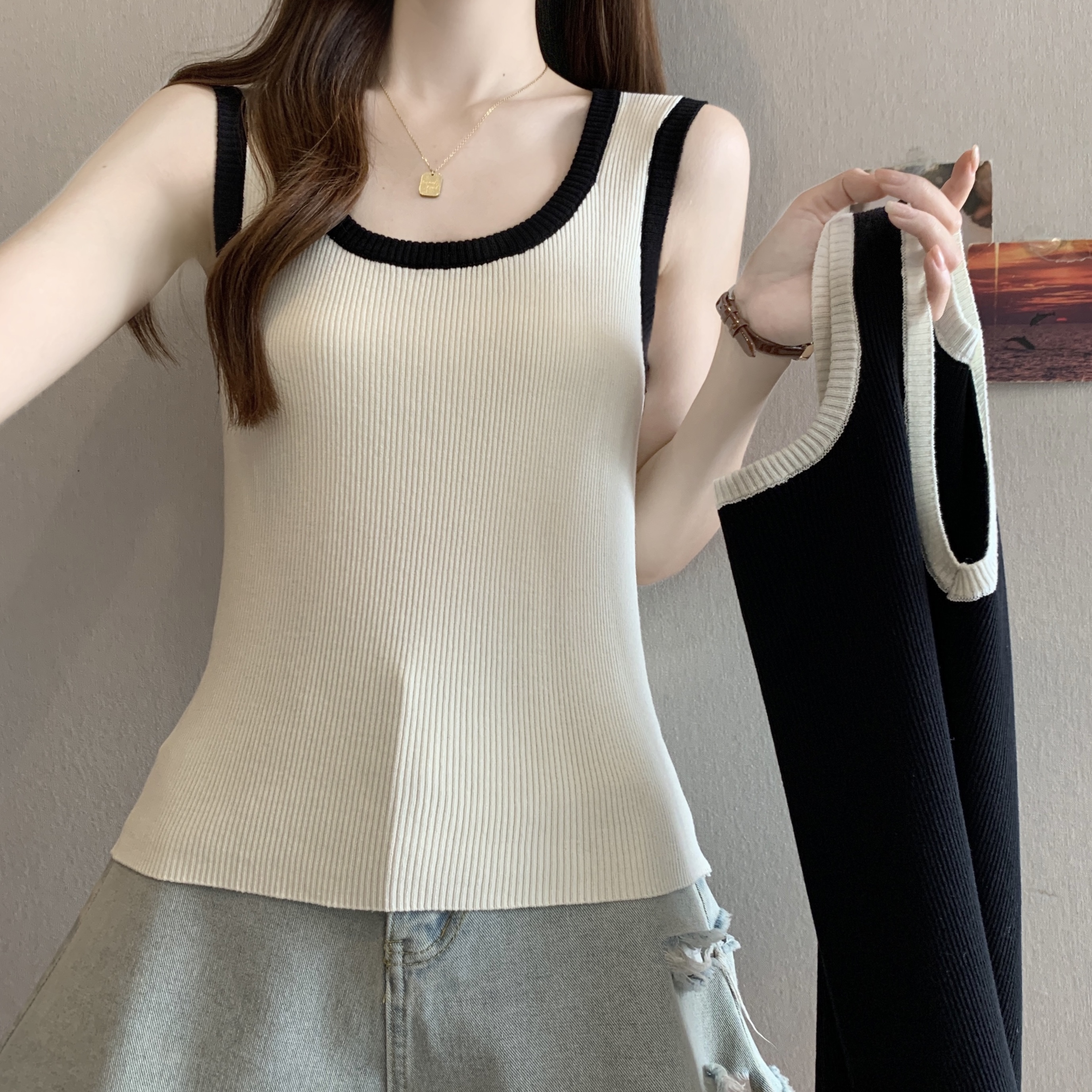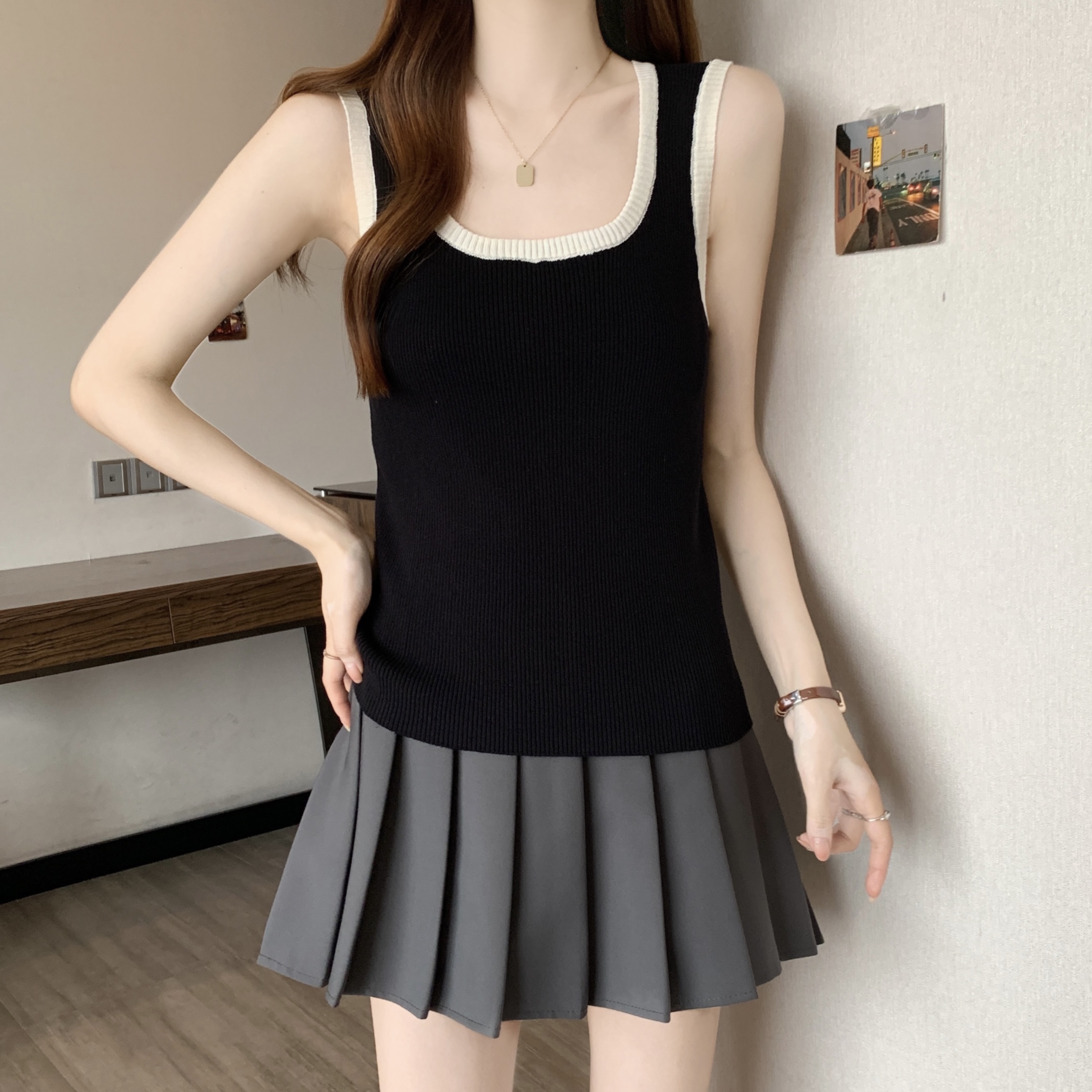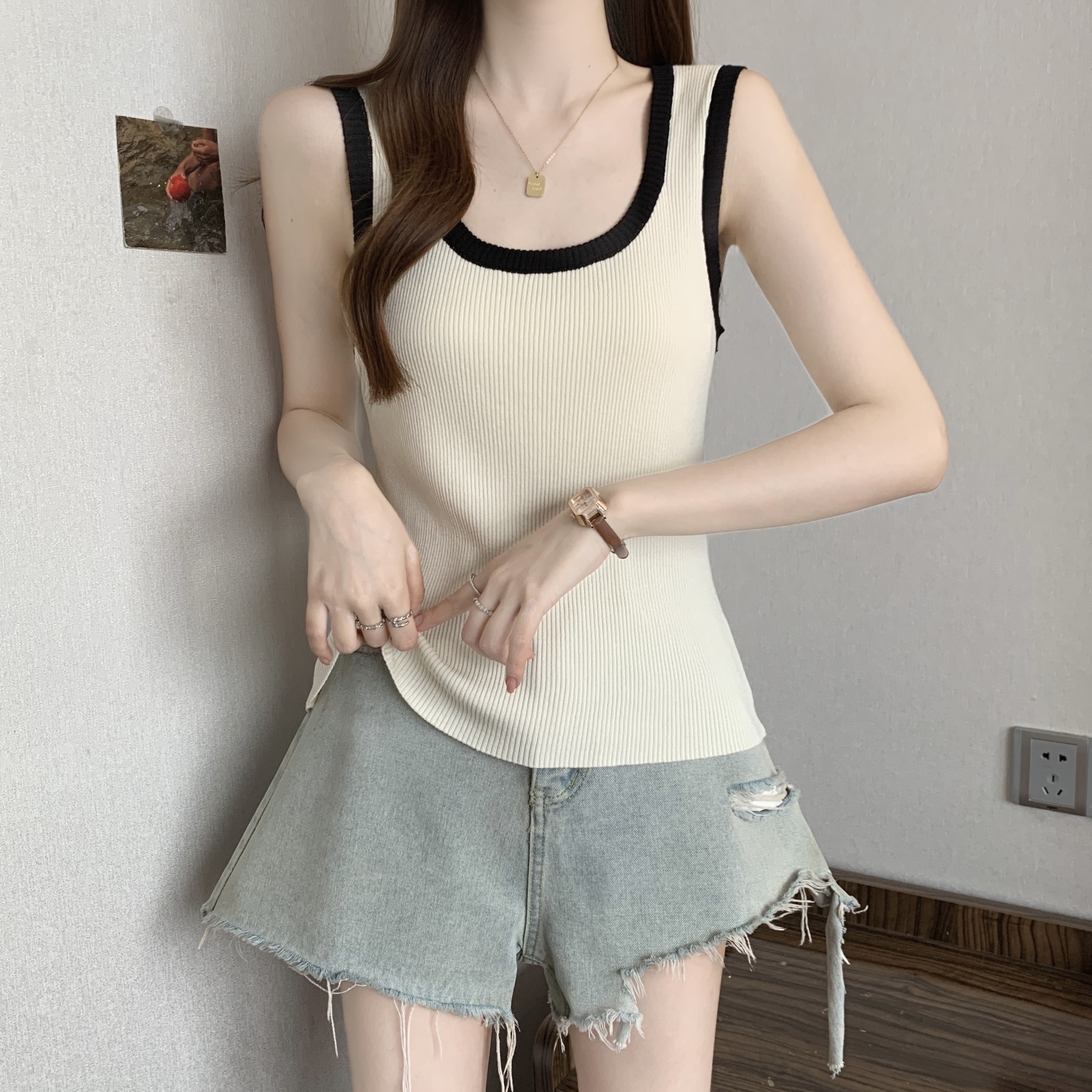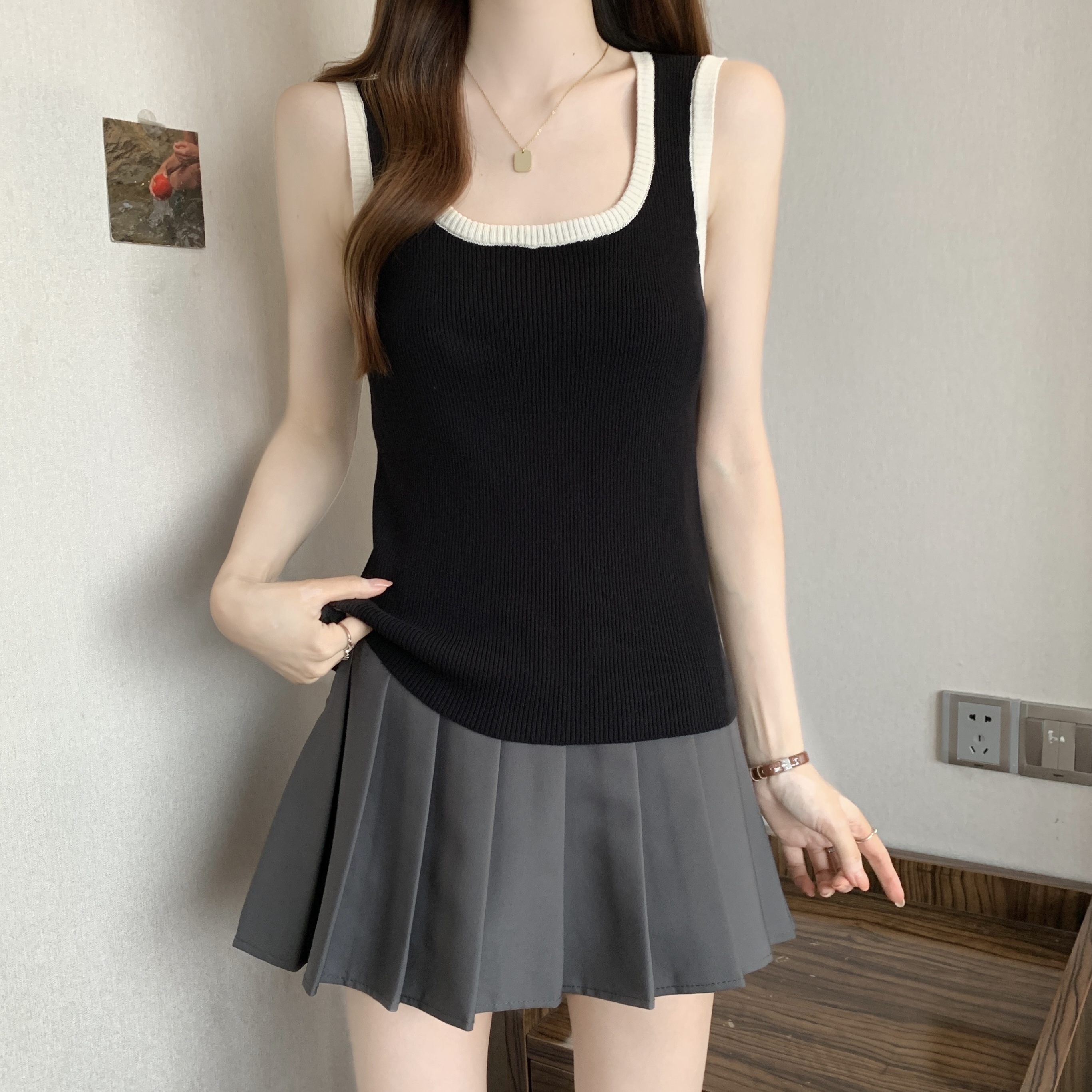 실사 빅 사이즈 지방 mm 새로운 디자인 센스 달콤한 스타일 미니멀리즘 노출 방지 조끼 슬립 슬림해 보이는 표지 고기 맨위
