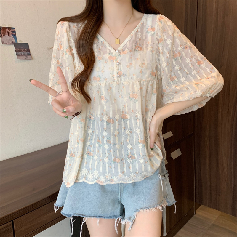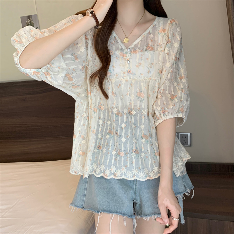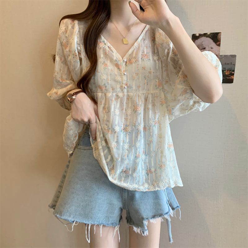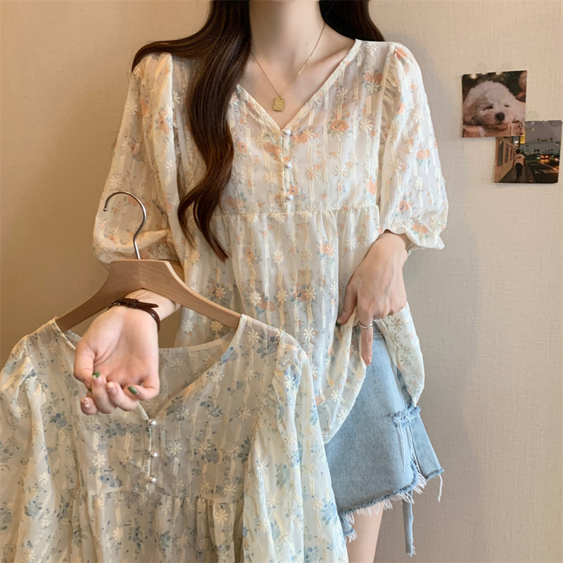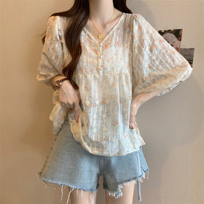 6651 빅 사이즈 실사 V넥 꽃무늬 달콤함 버블 반팔 맨위 셔츠
