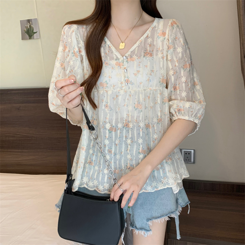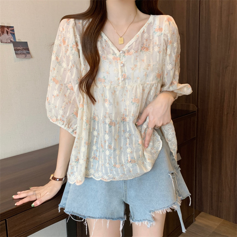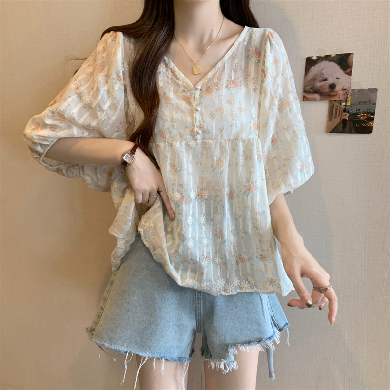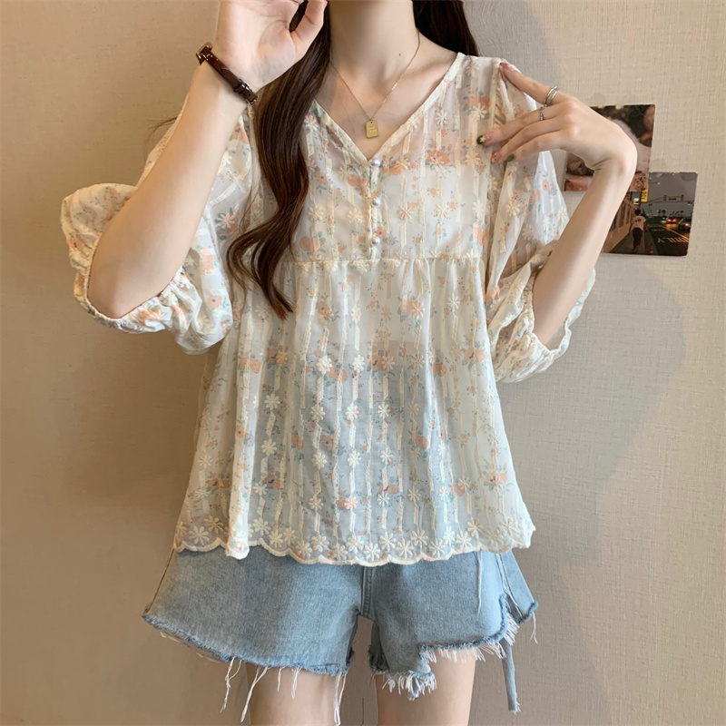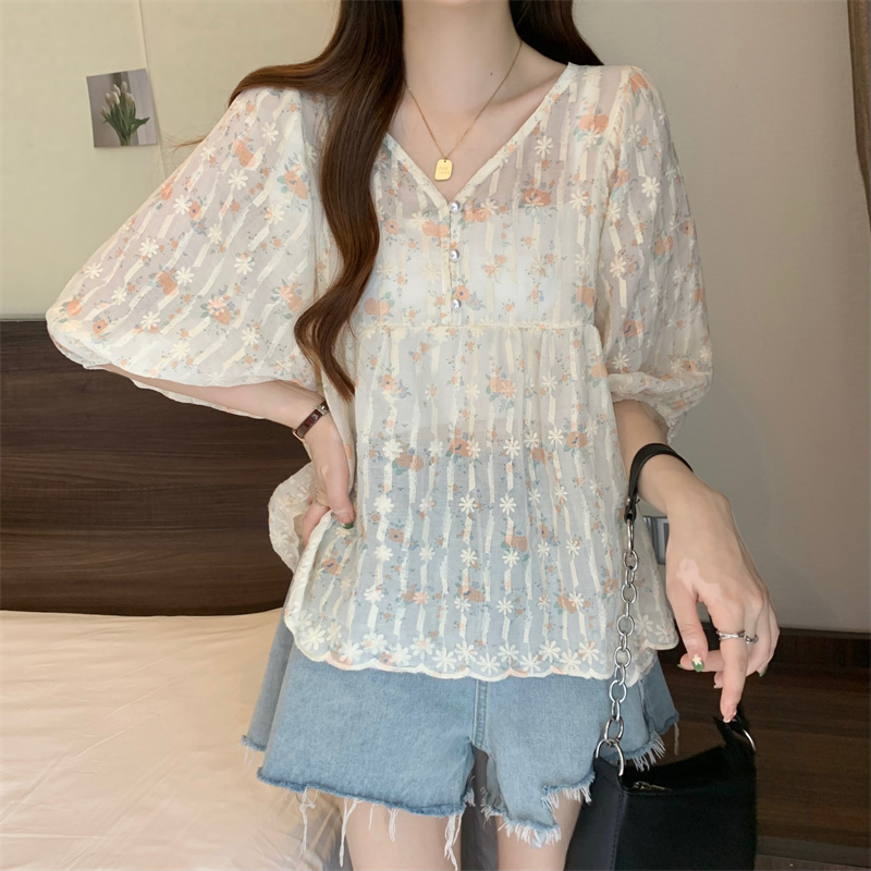 6651 빅 사이즈 실사 V넥 꽃무늬 달콤함 버블 반팔 맨위 셔츠