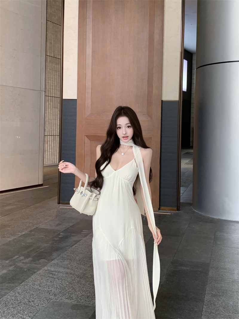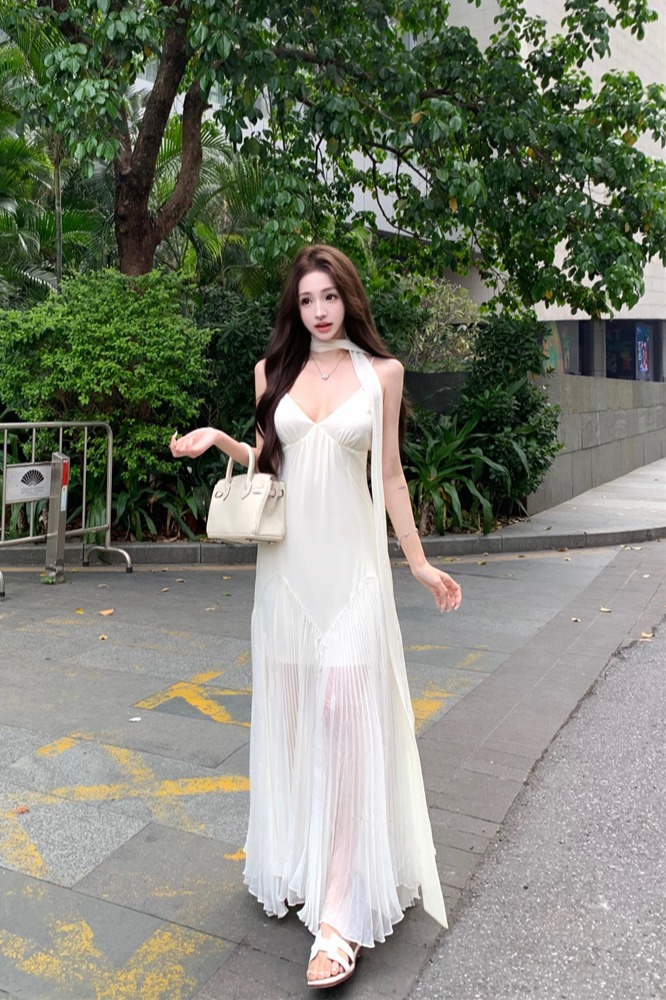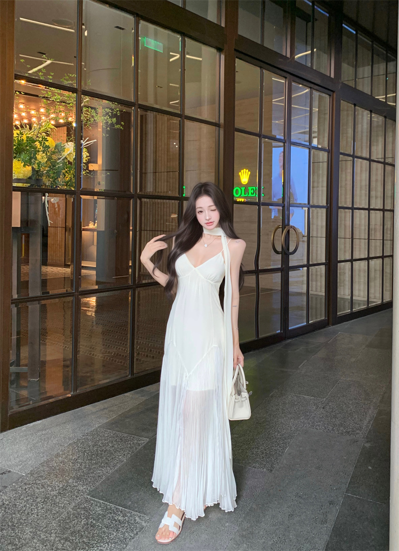 실사 여름 새로운 화이트 플리츠 쉬폰 슬립 드레스 롱 코트 품격 허리 수축 대 치마 요정 치마