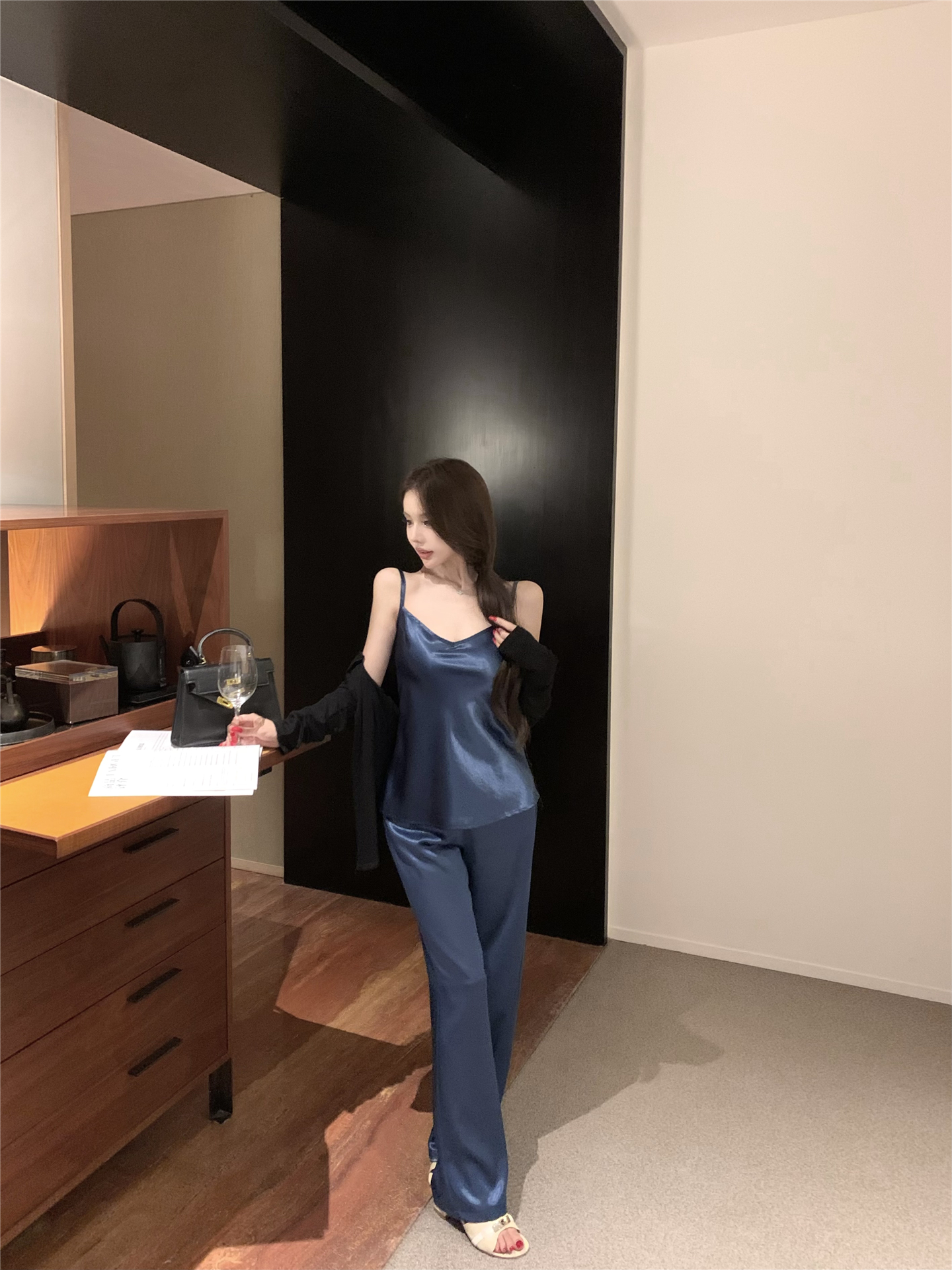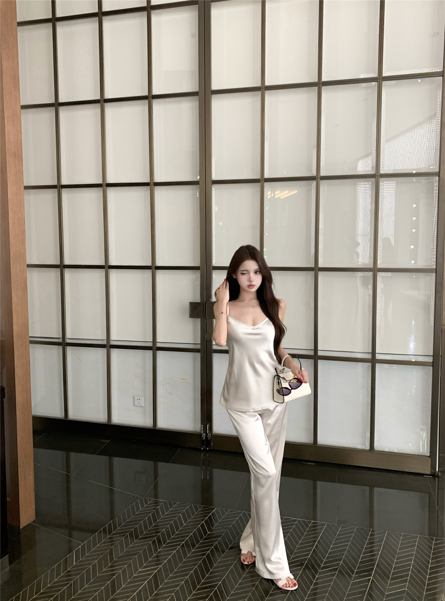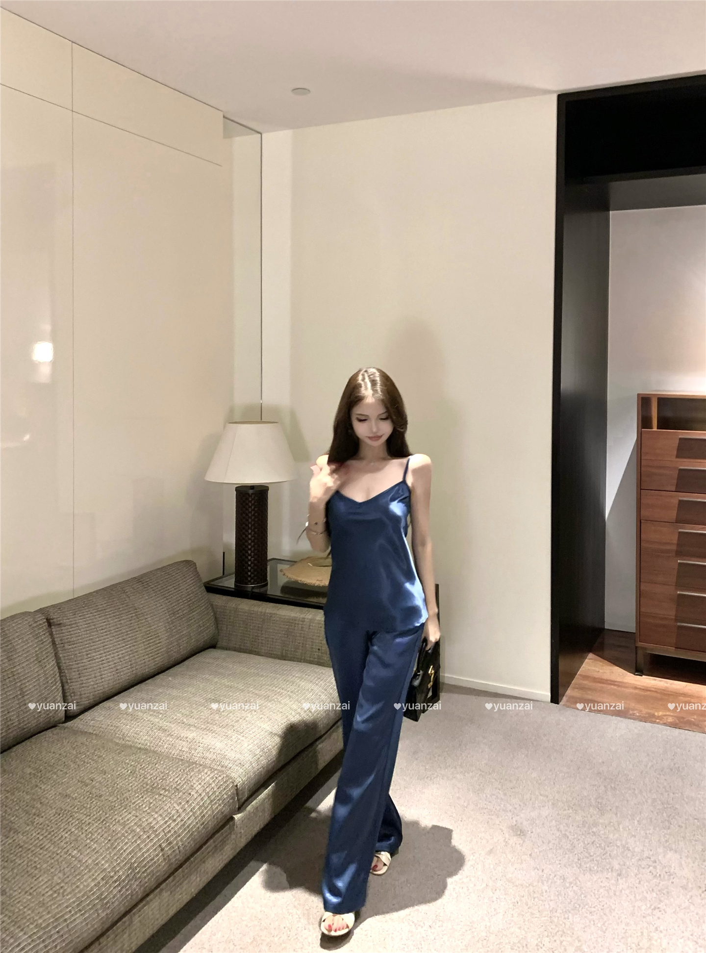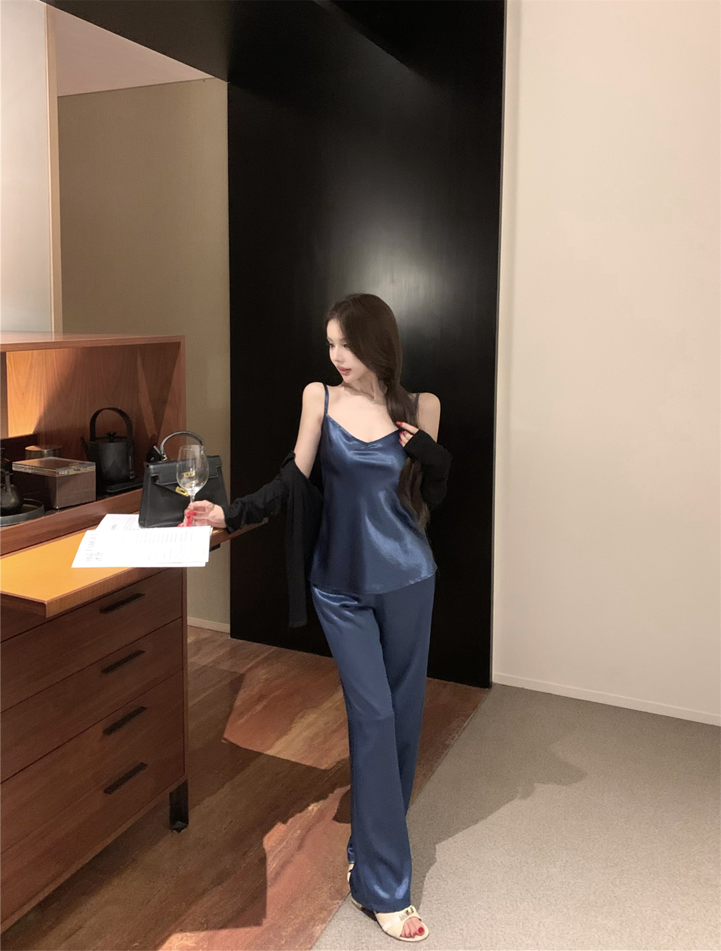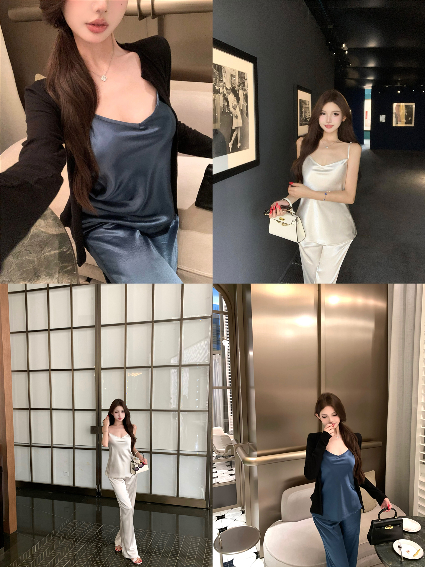 실사 미니멀리즘 고급 센스 V넥 새틴 인사이드 가져 가라. 외출용 슬립 긴 바지 캐주얼 두 조각 여성 세트