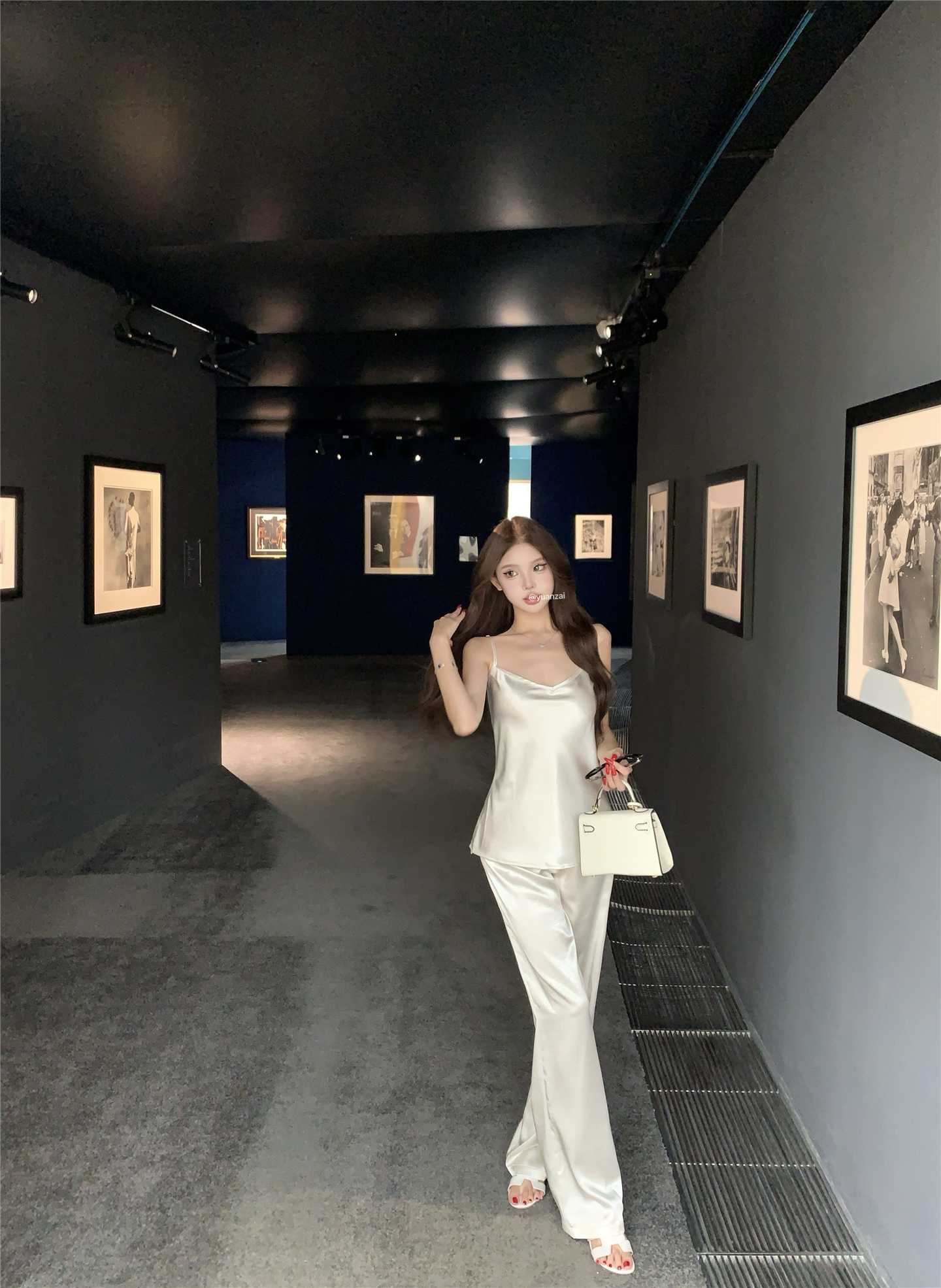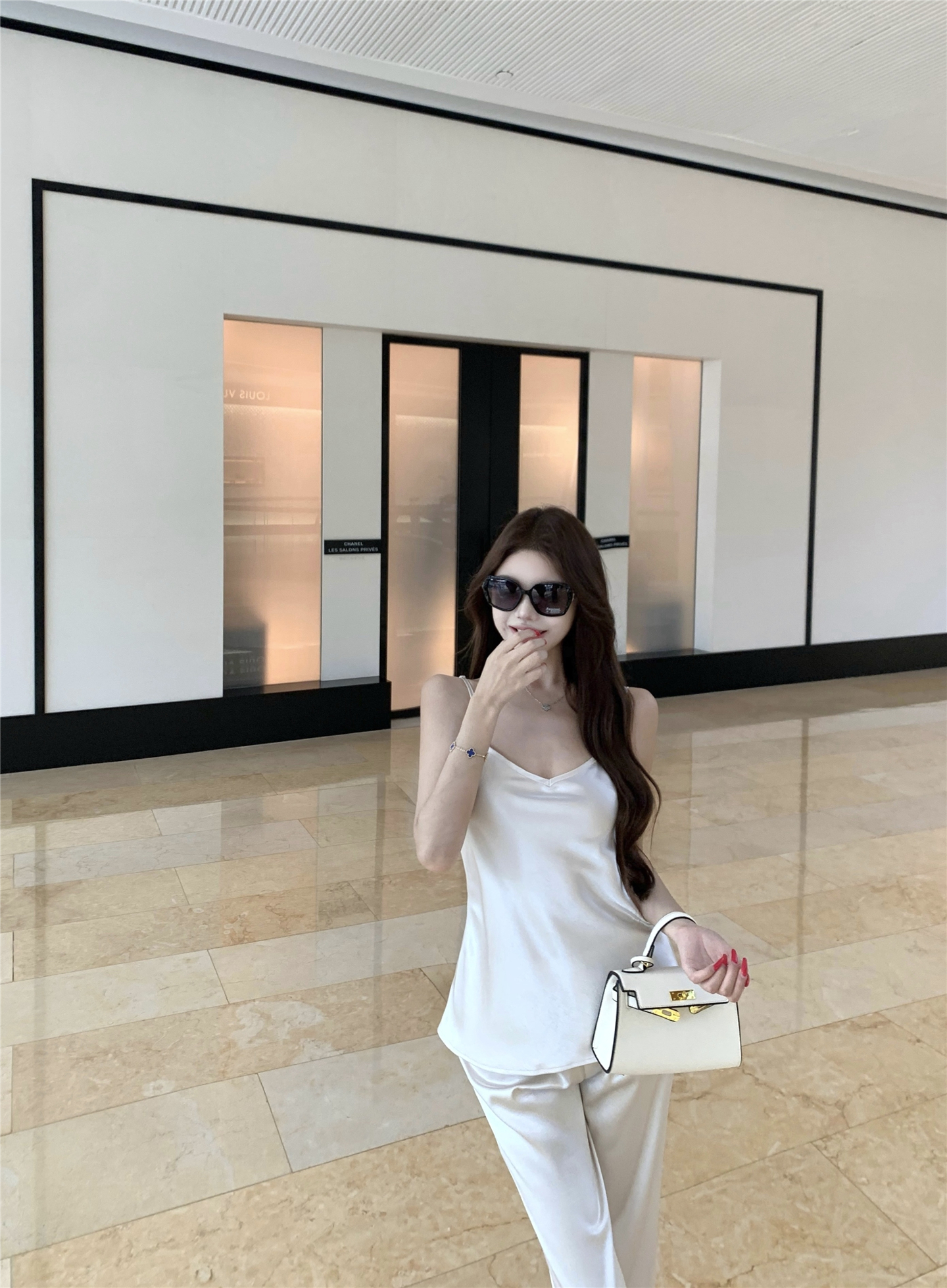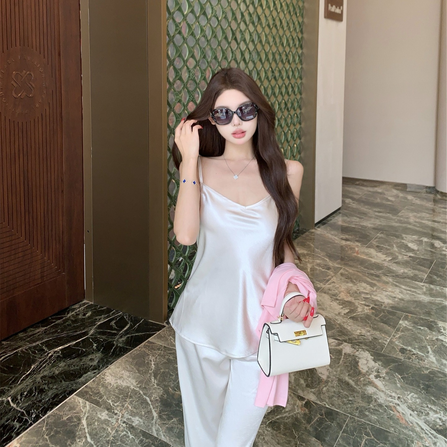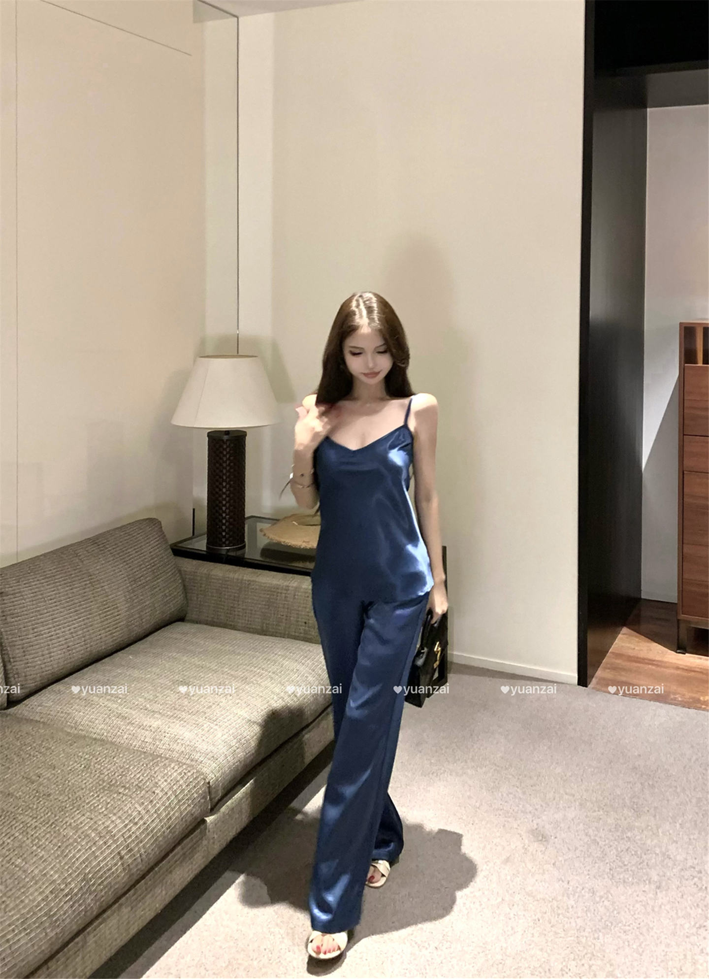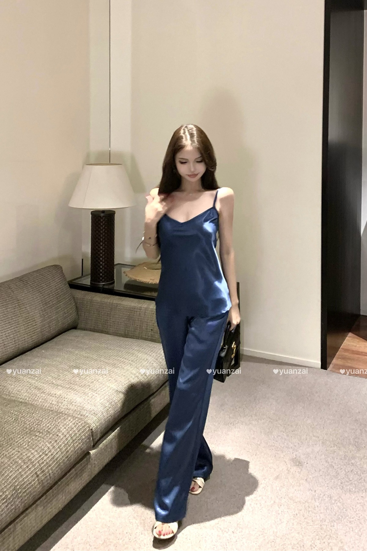 실사 미니멀리즘 고급 센스 V넥 새틴 인사이드 가져 가라. 외출용 슬립 긴 바지 캐주얼 두 조각 여성 세트