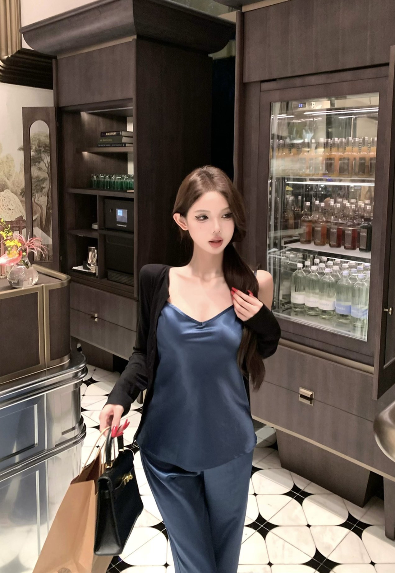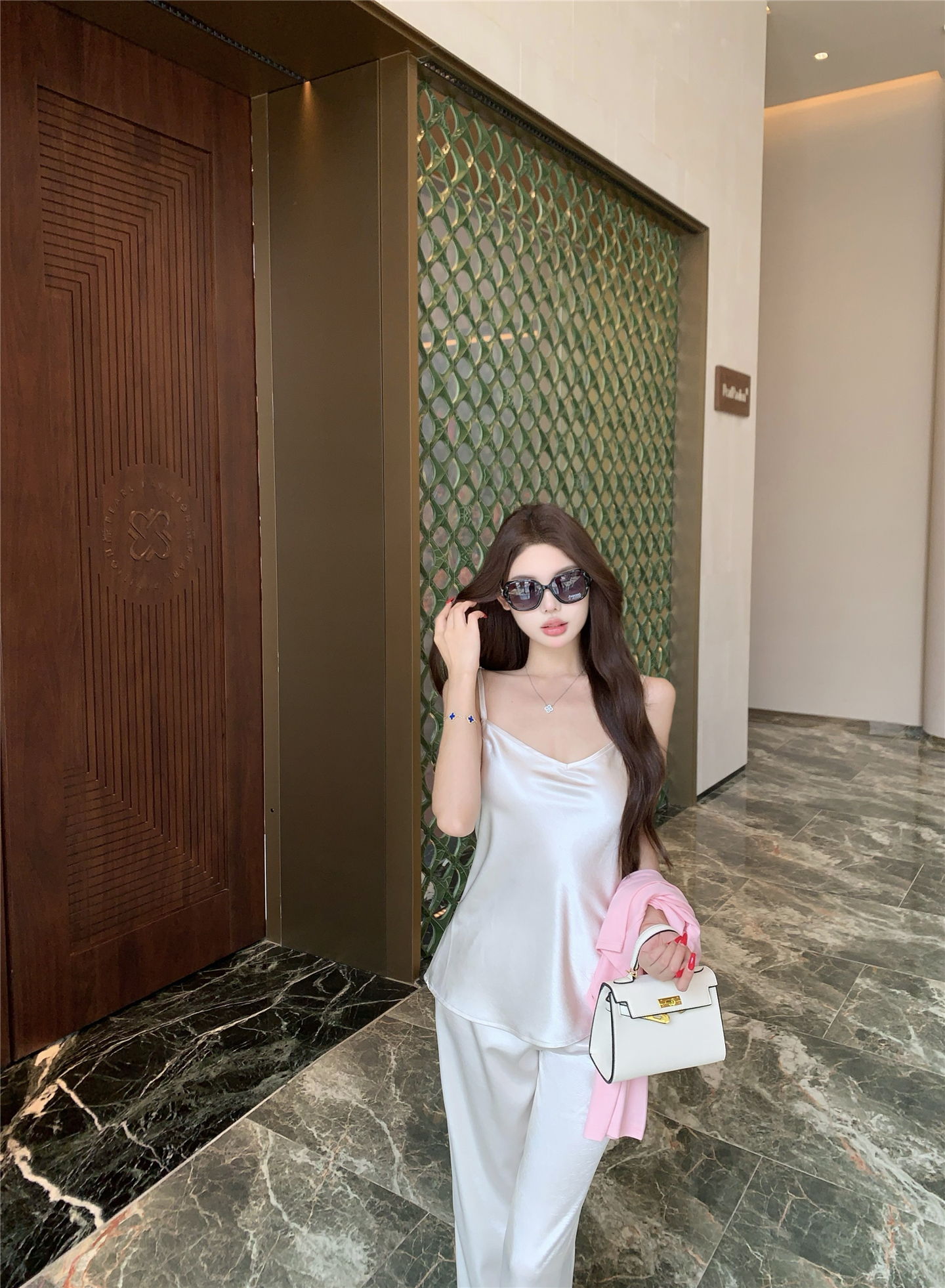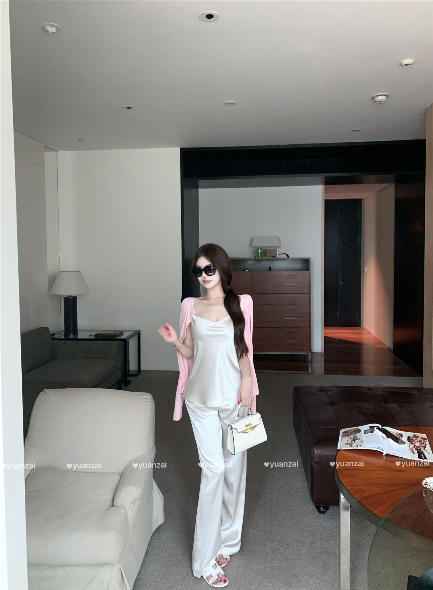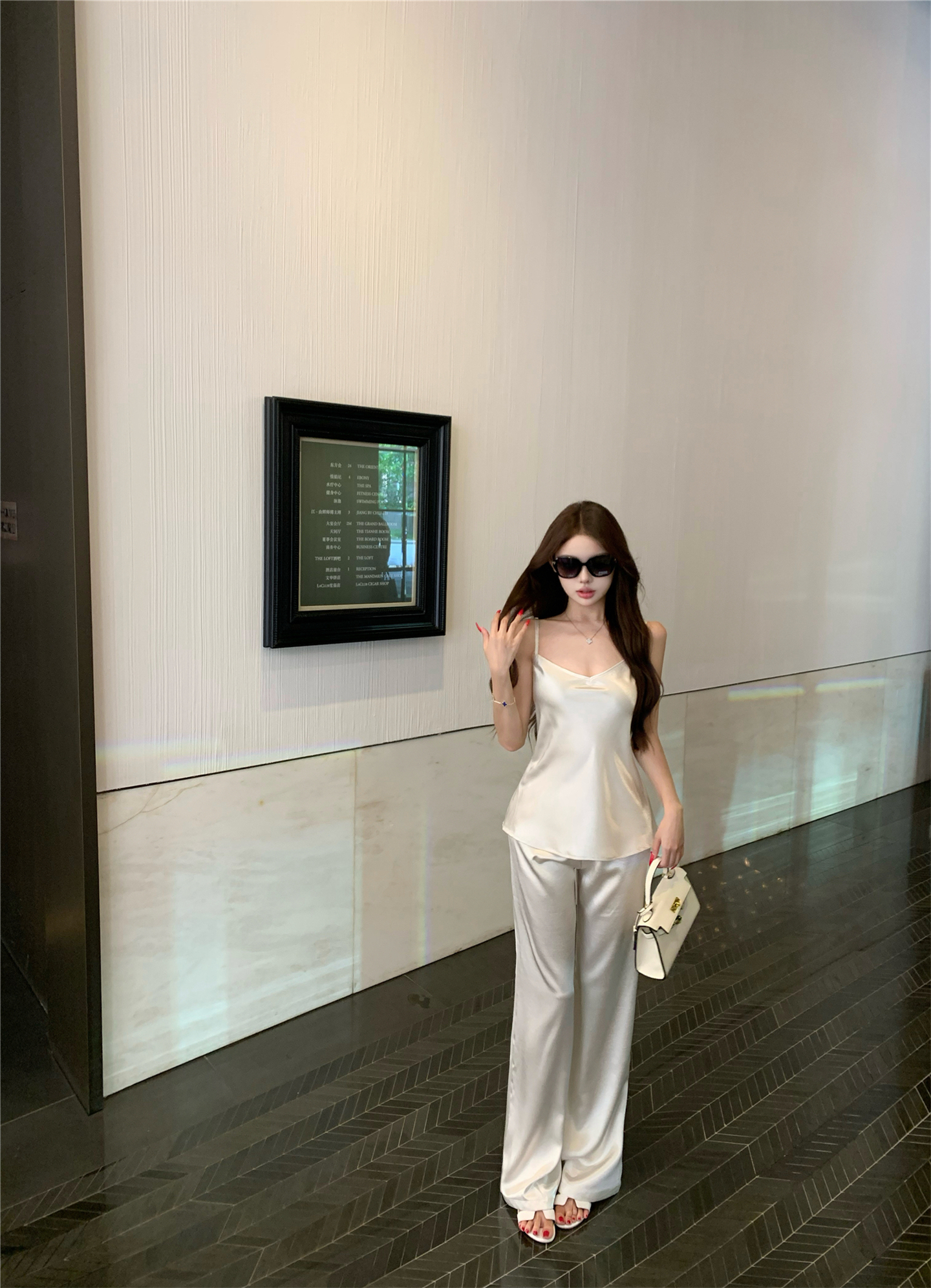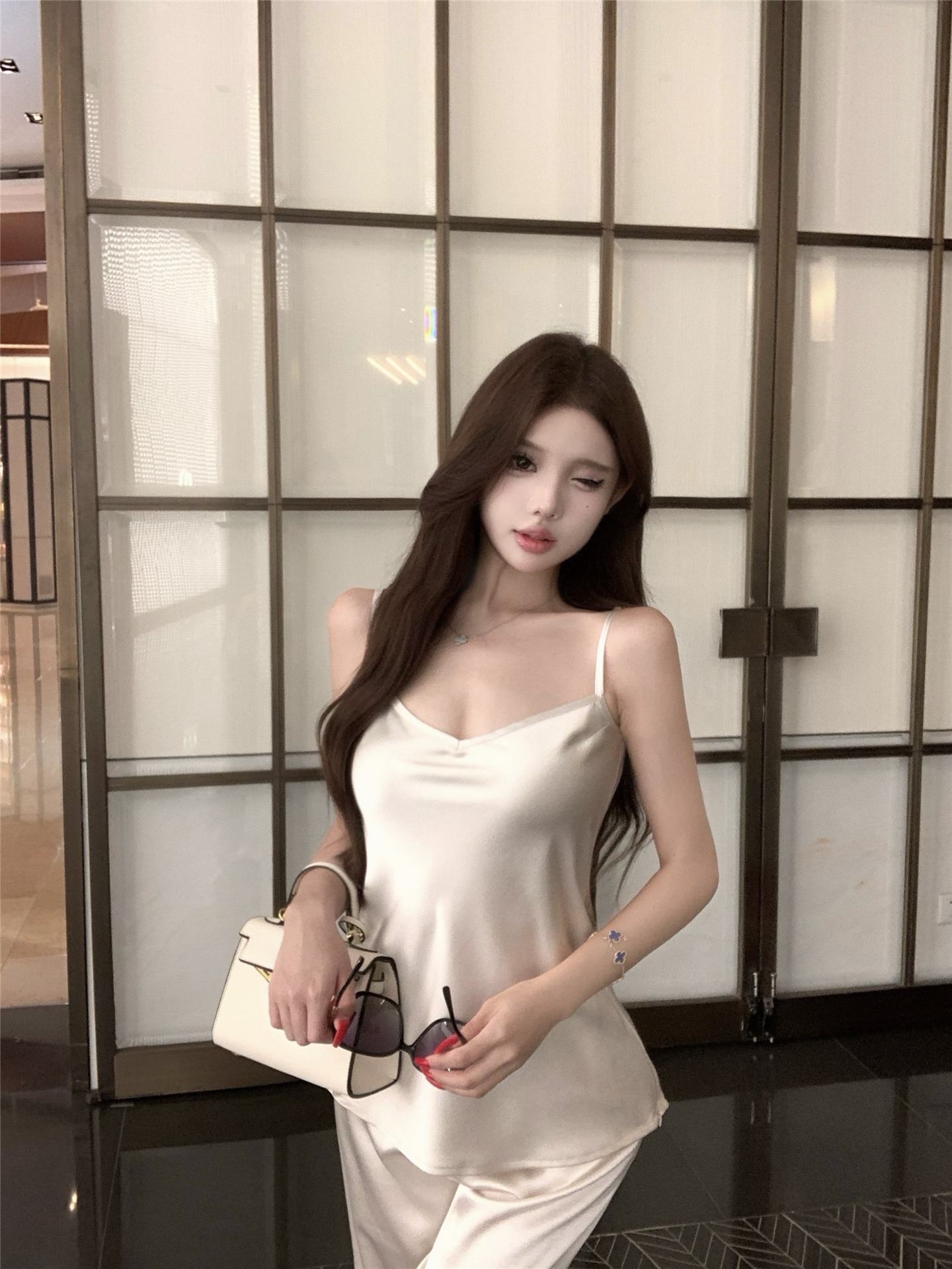 실사 미니멀리즘 고급 센스 V넥 새틴 인사이드 가져 가라. 외출용 슬립 긴 바지 캐주얼 두 조각 여성 세트