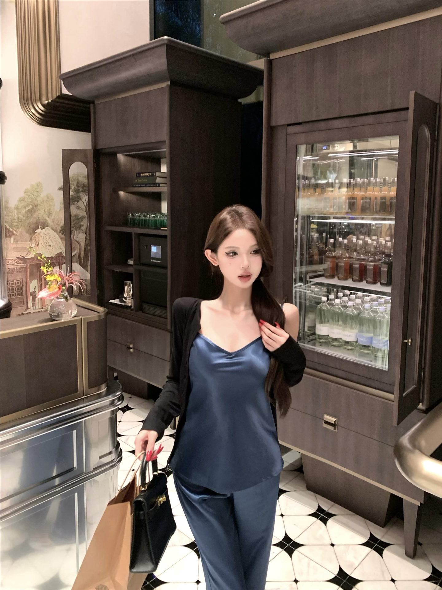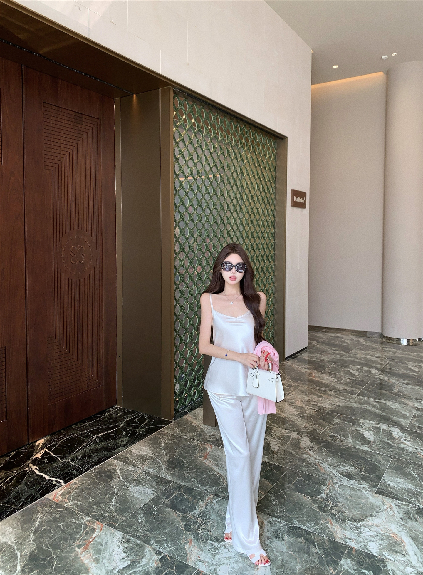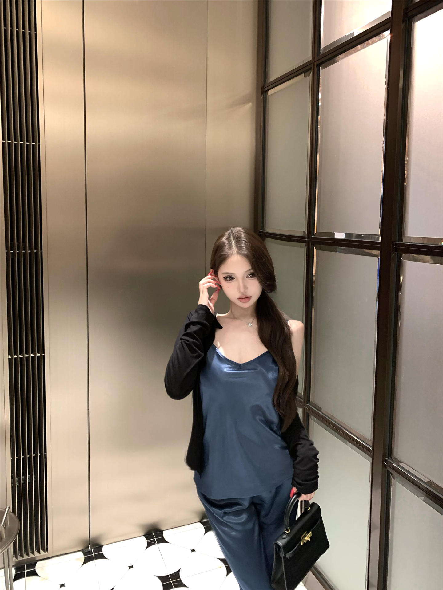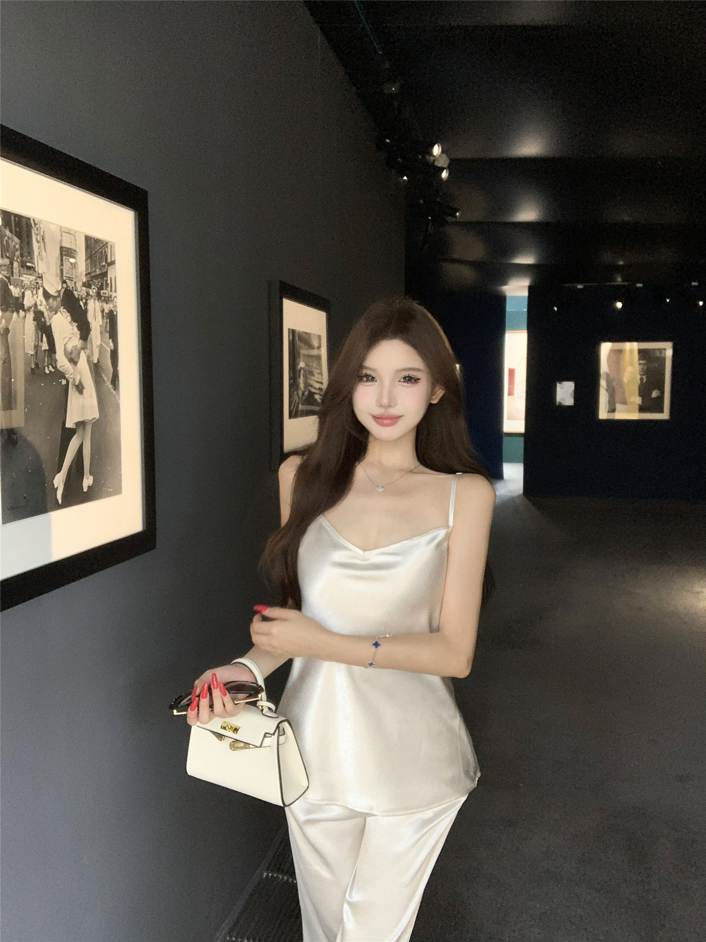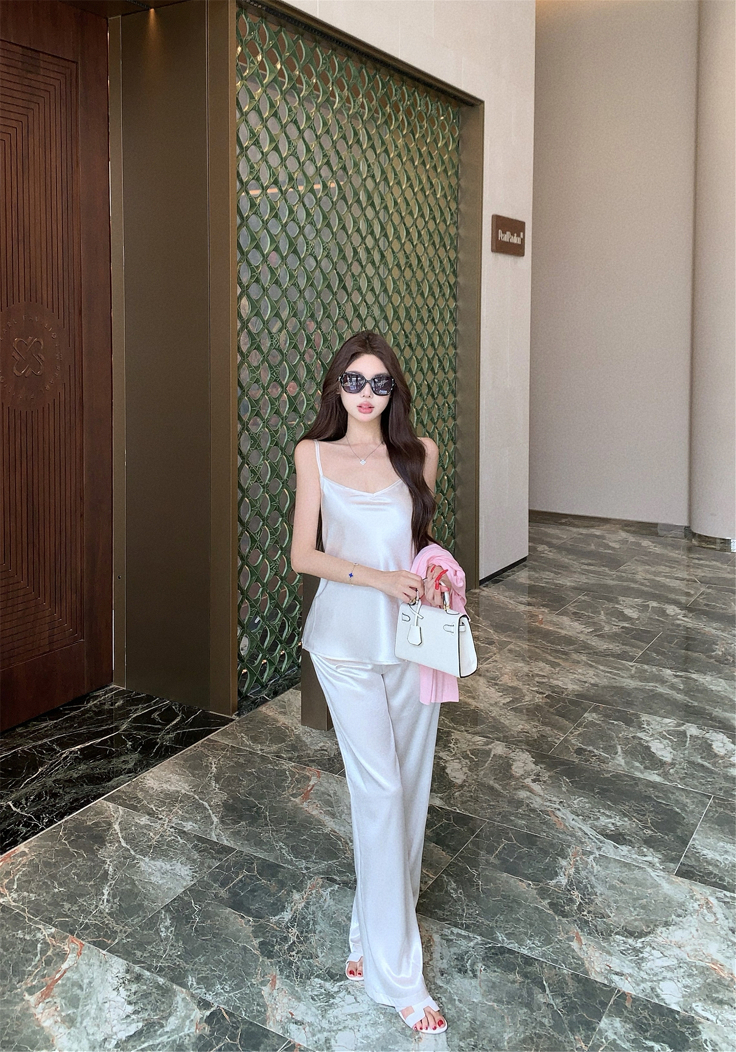 실사 미니멀리즘 고급 센스 V넥 새틴 인사이드 가져 가라. 외출용 슬립 긴 바지 캐주얼 두 조각 여성 세트