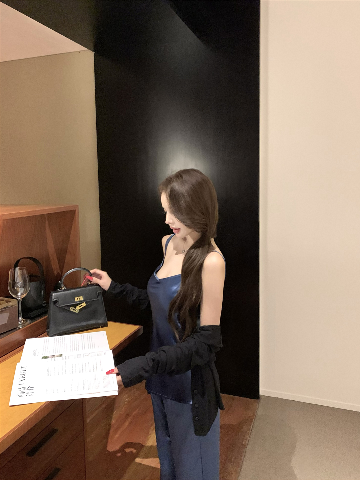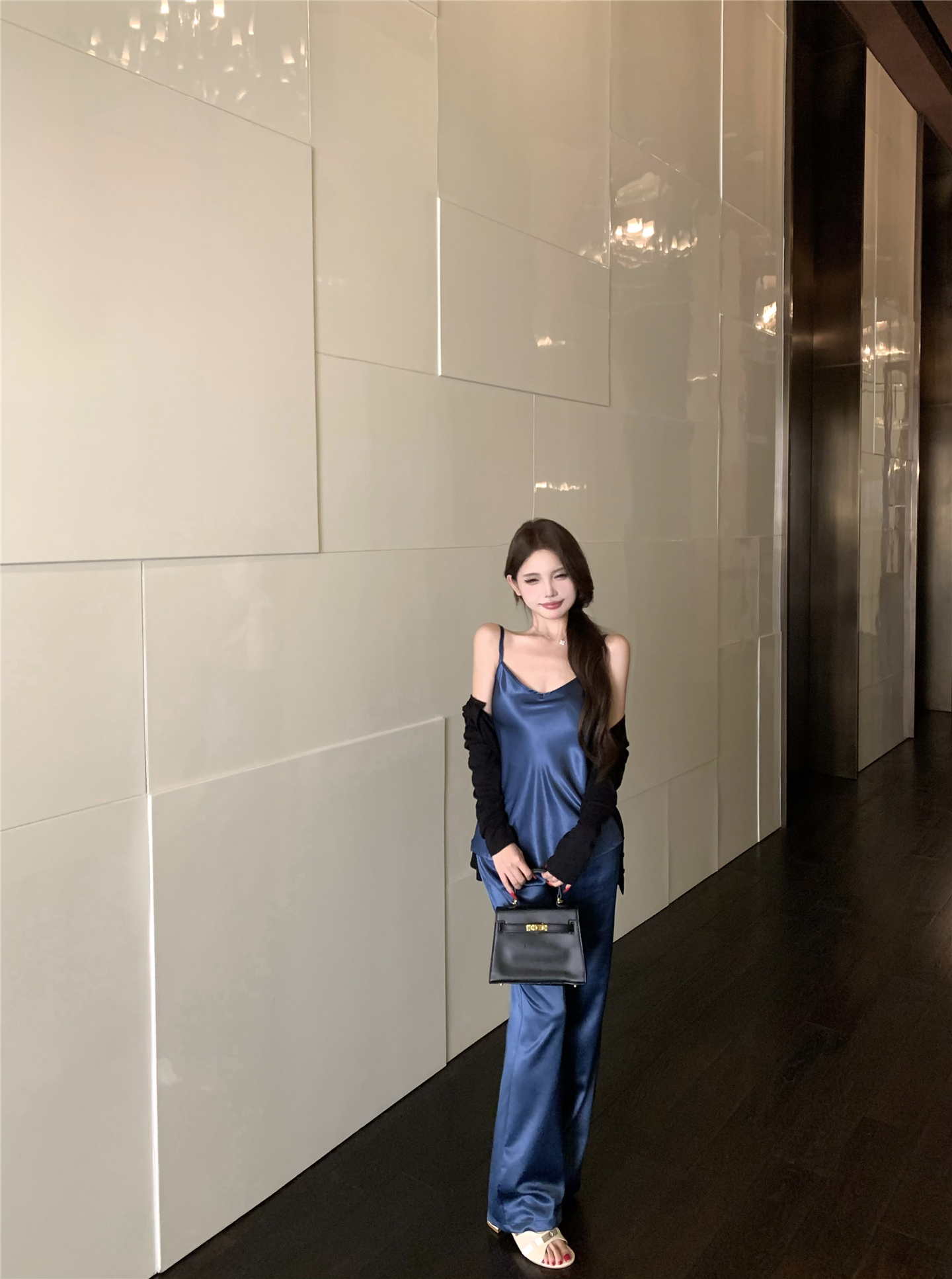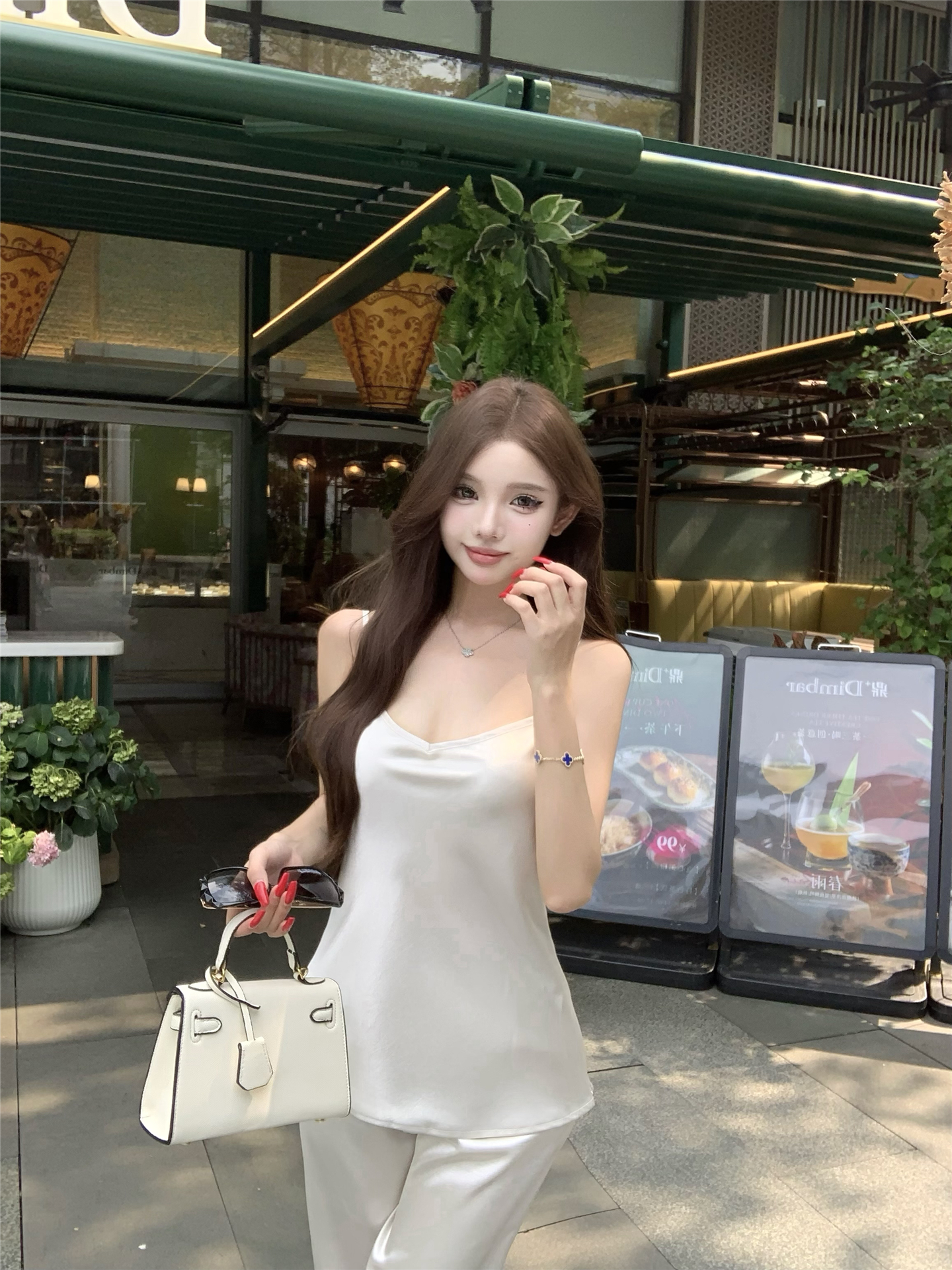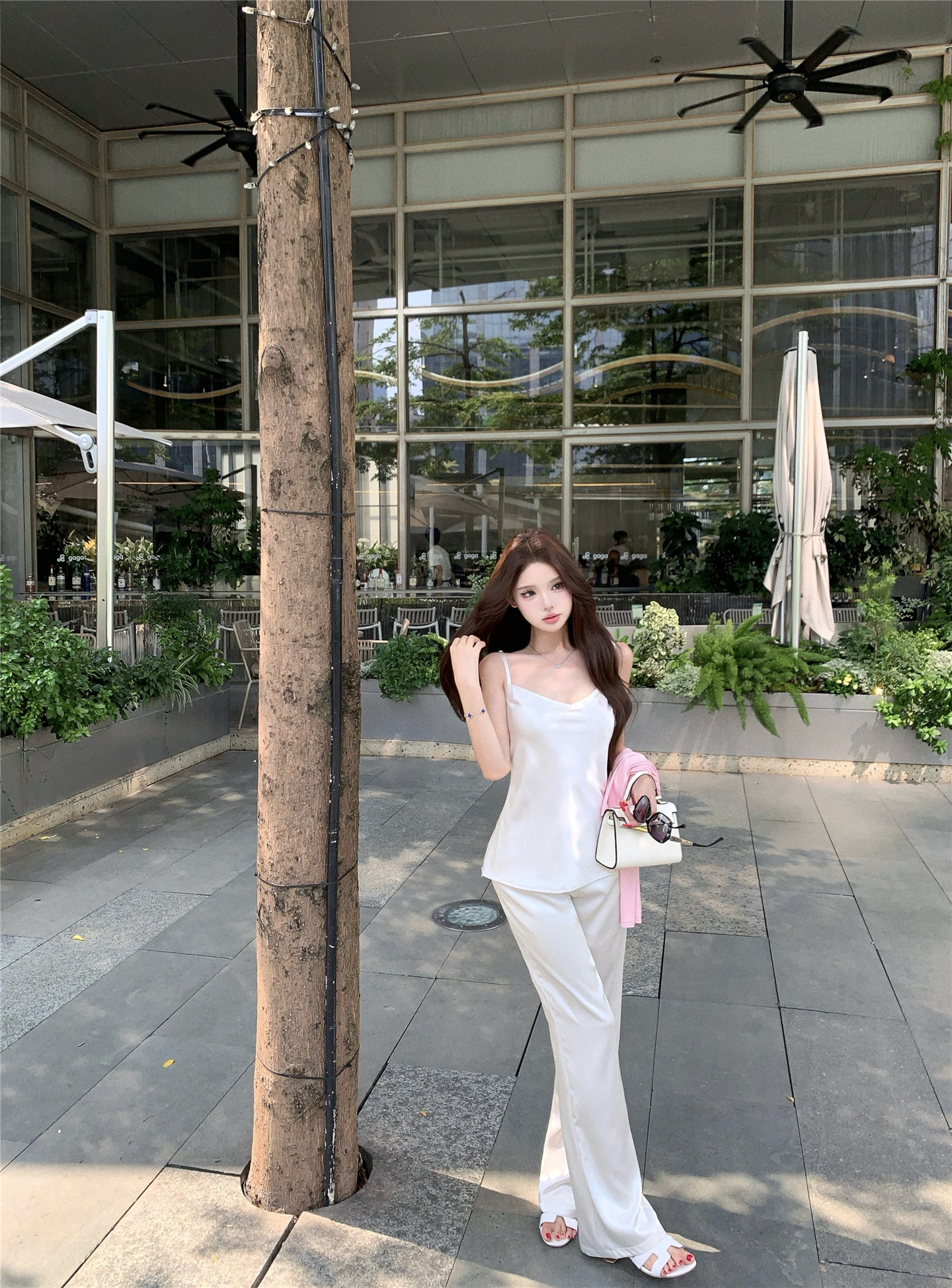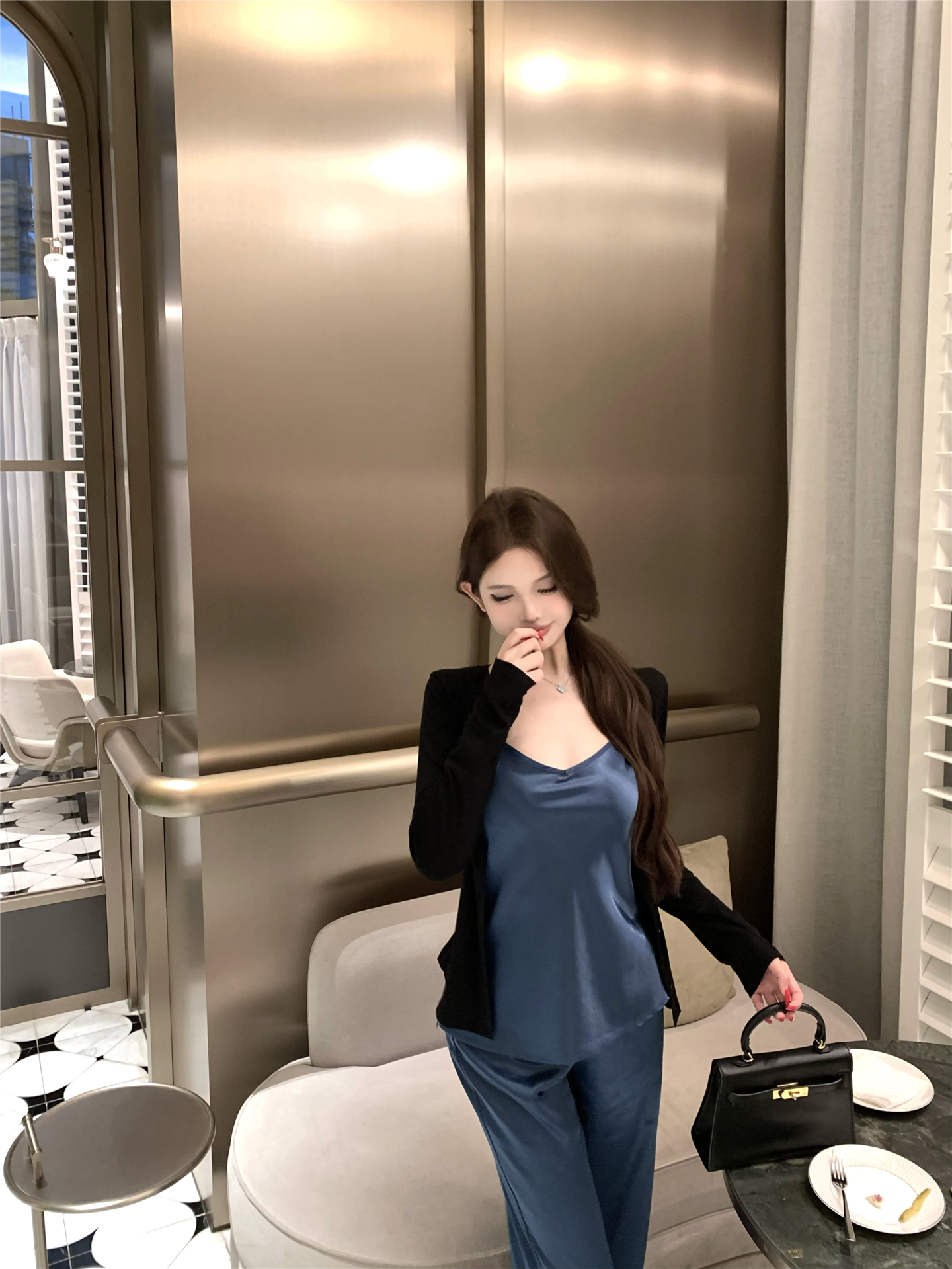 실사 미니멀리즘 고급 센스 V넥 새틴 인사이드 가져 가라. 외출용 슬립 긴 바지 캐주얼 두 조각 여성 세트