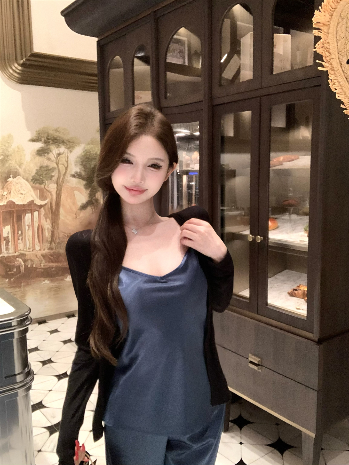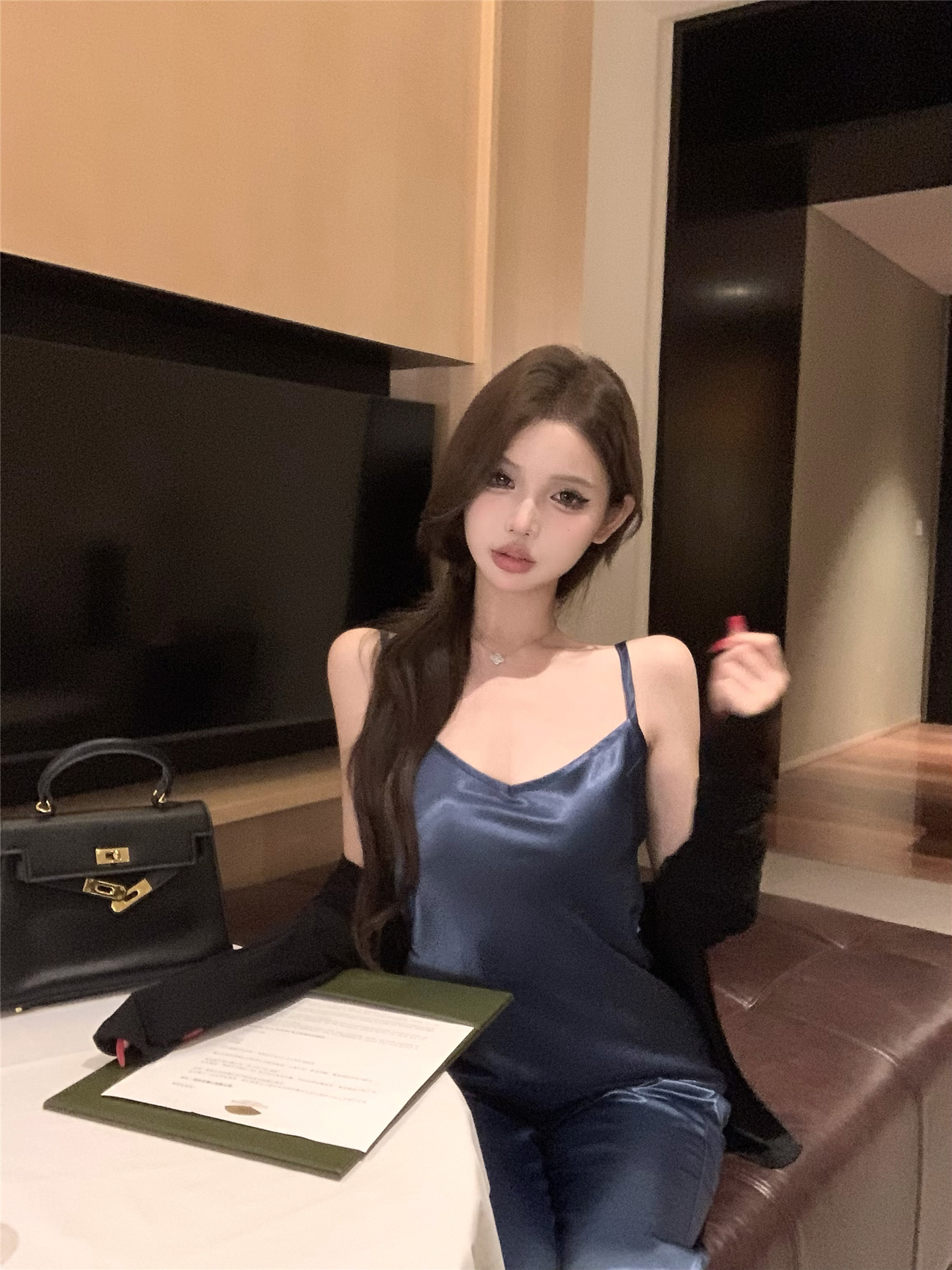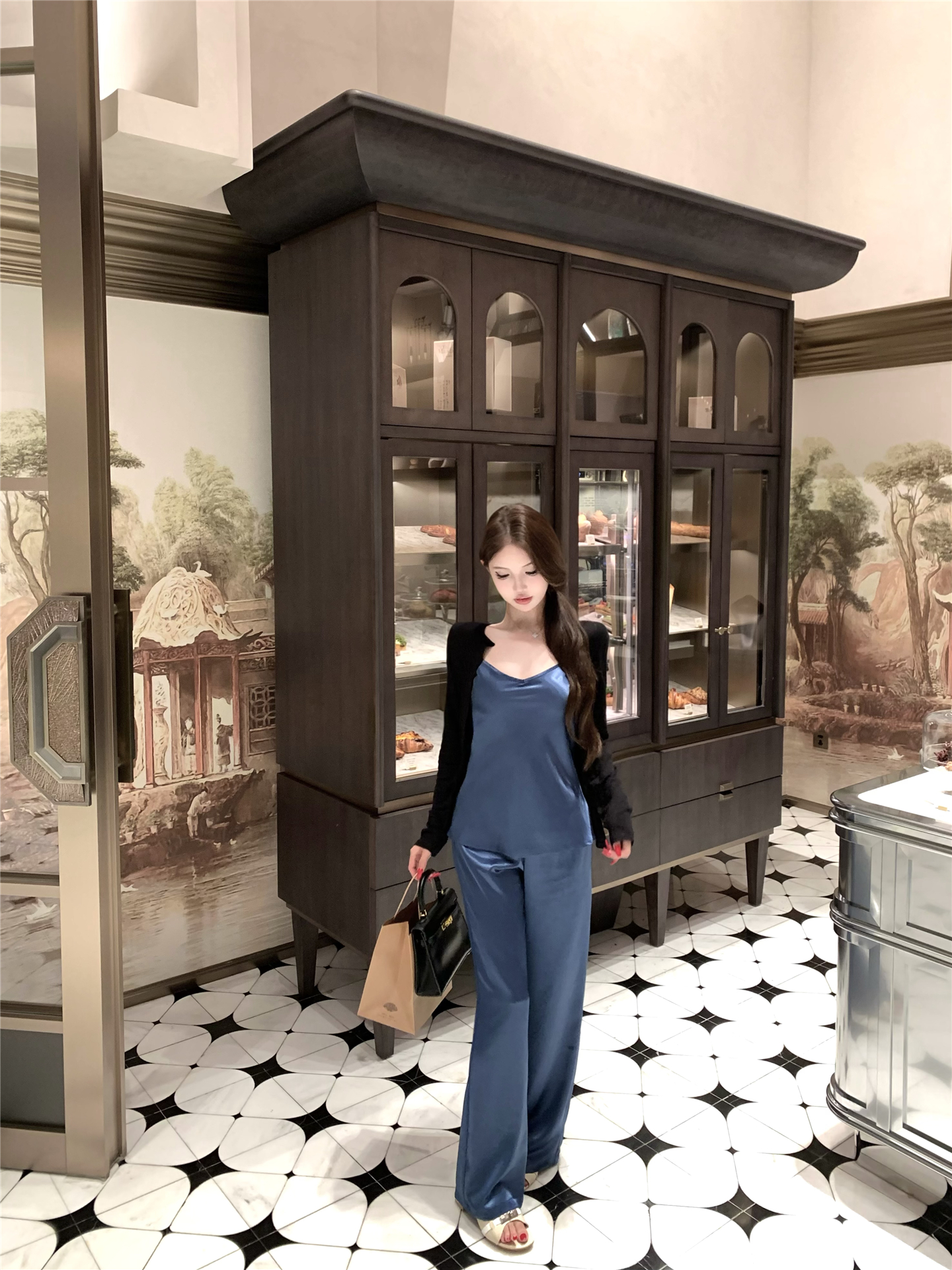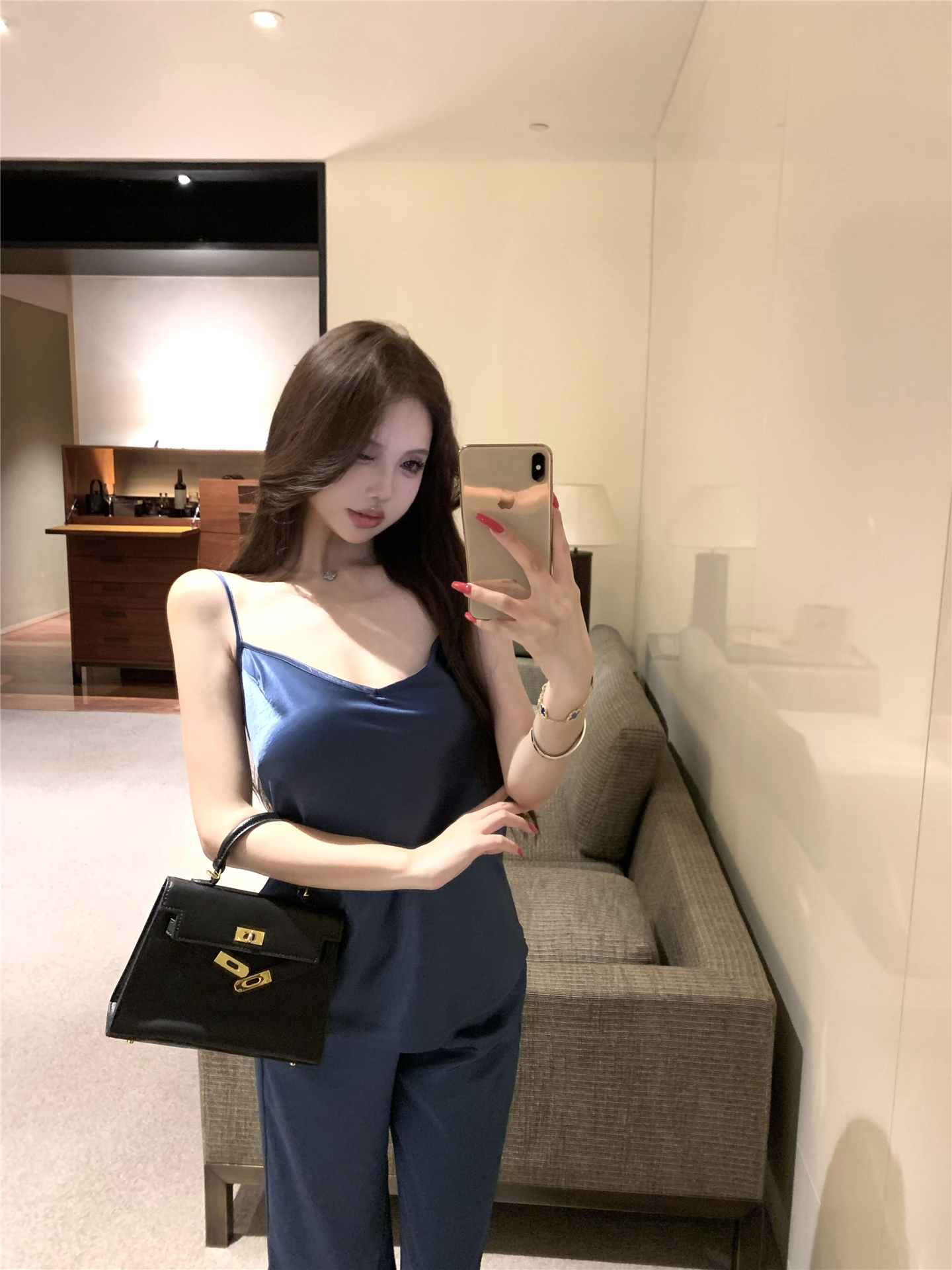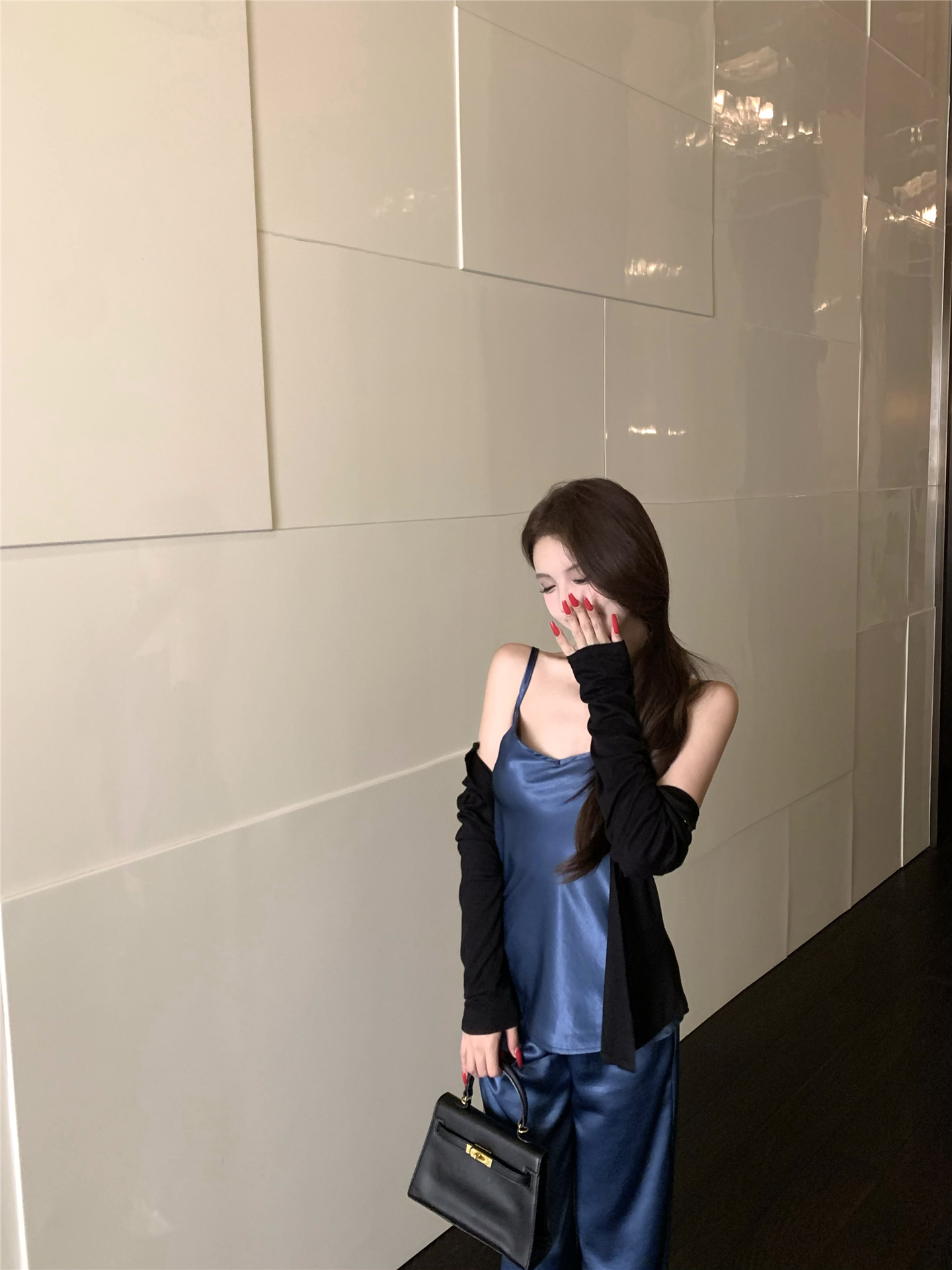 실사 미니멀리즘 고급 센스 V넥 새틴 인사이드 가져 가라. 외출용 슬립 긴 바지 캐주얼 두 조각 여성 세트