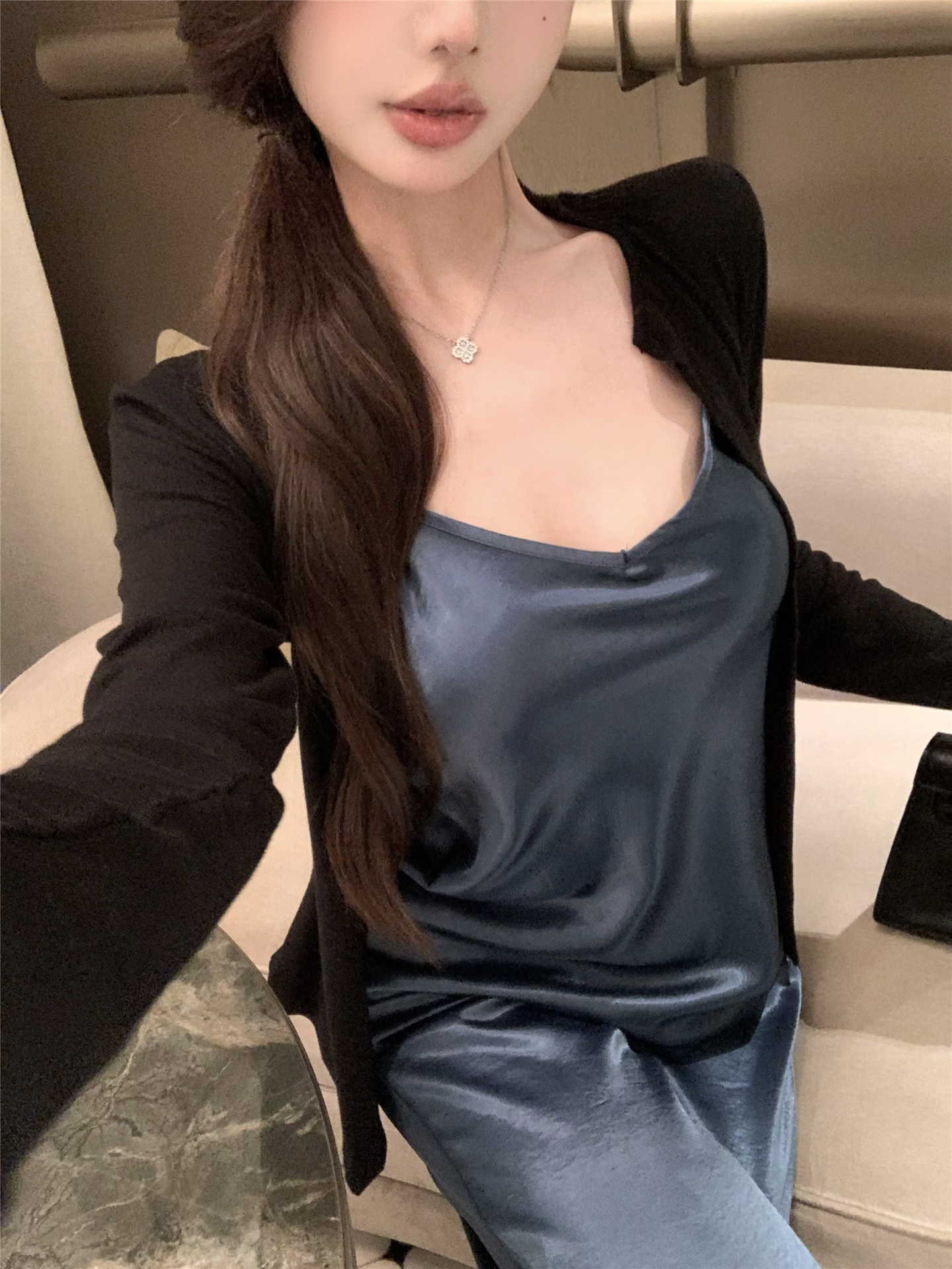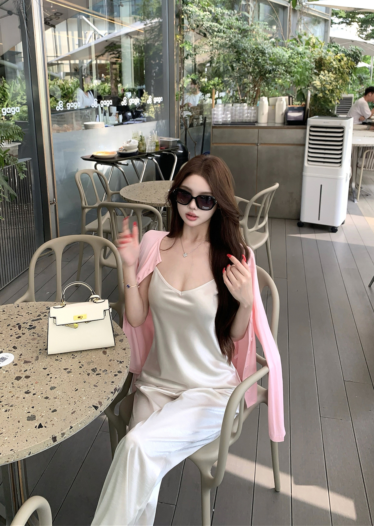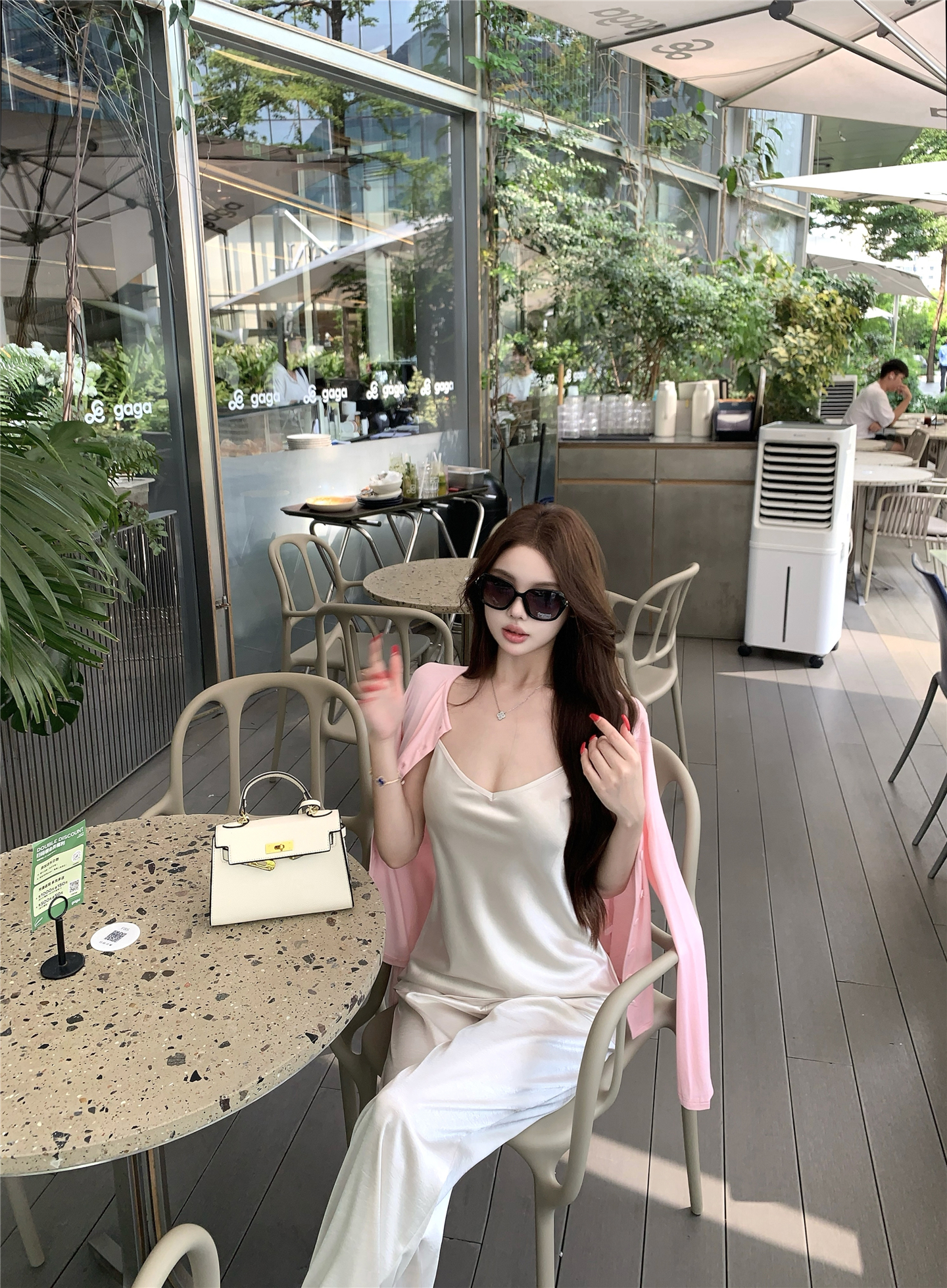 실사 봄 여름 빛 사람들 아름다움 센스 세트 그룹 주름 몸매 가꾸기 슬립 여성 드레스 주간 실크 오픈 가디건 투피스 세트