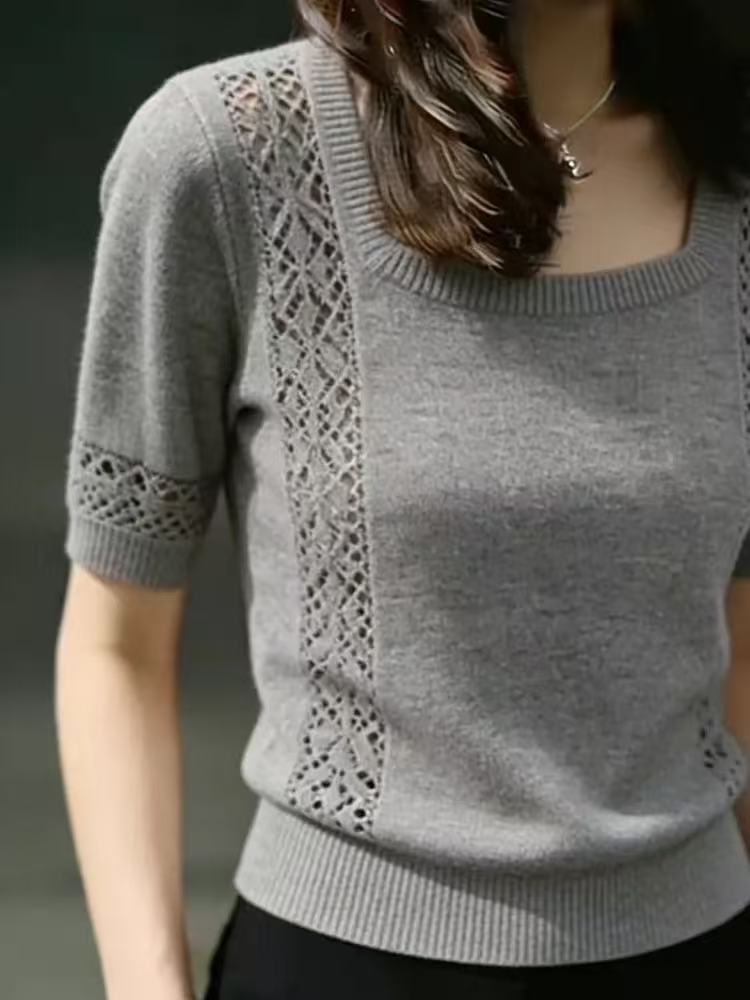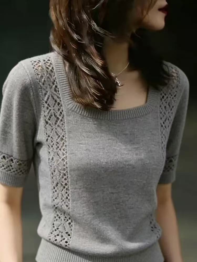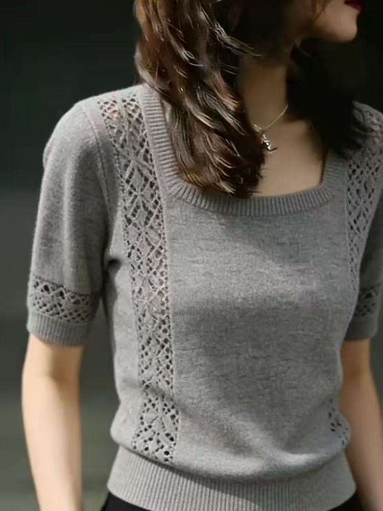 레트로 스타일 라운드 넥 홀로우 아웃 반팔 니트 스웨터 여성 2026 여름 새로운 회색 풀오버 슬림해 보이는 외국 가스 맨위 서비스