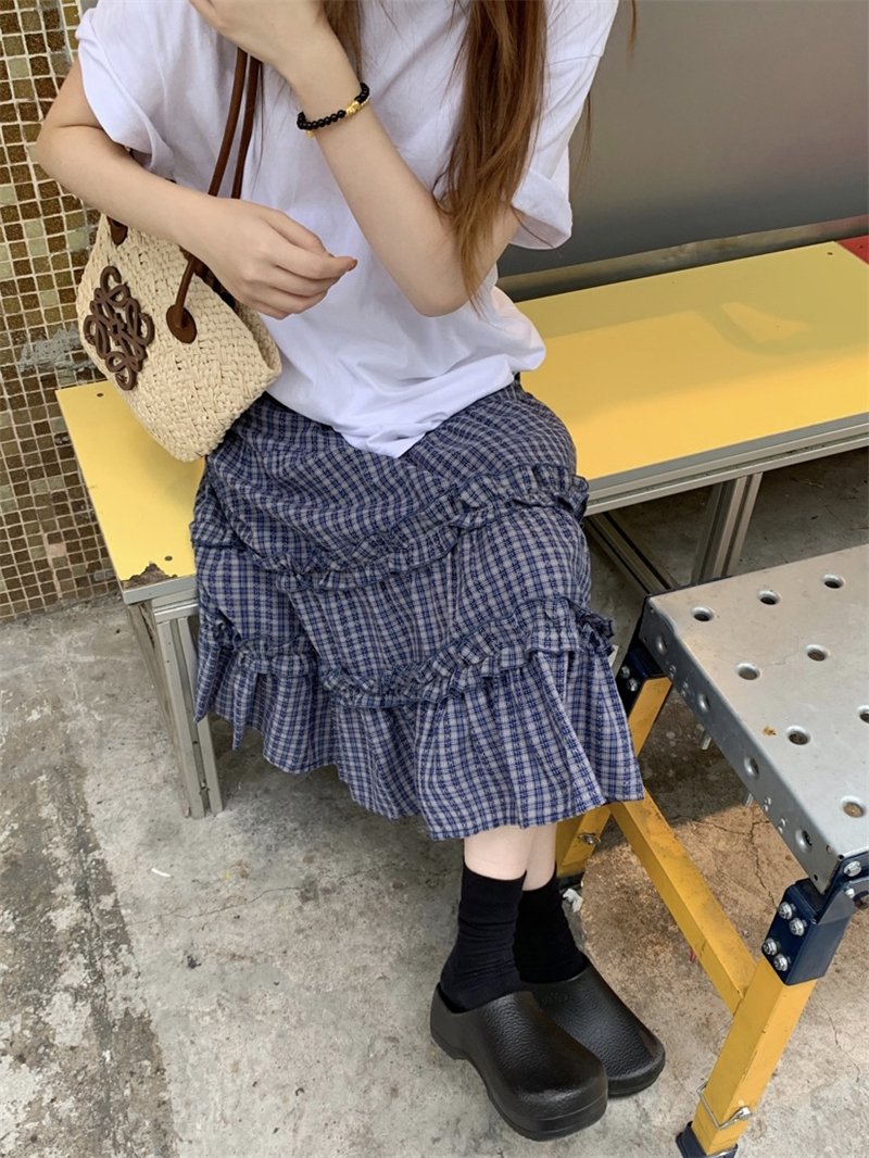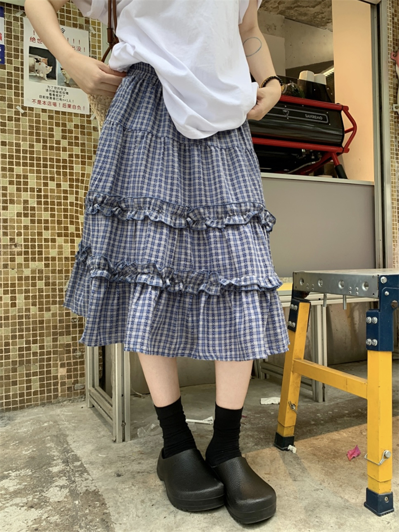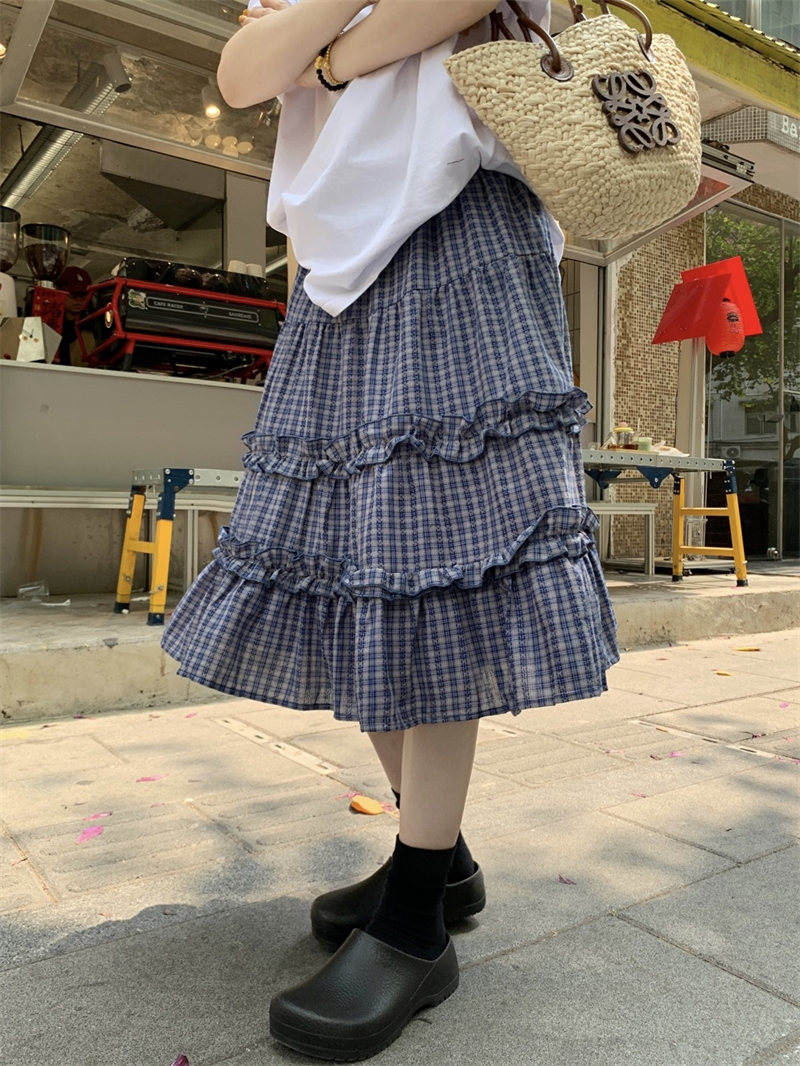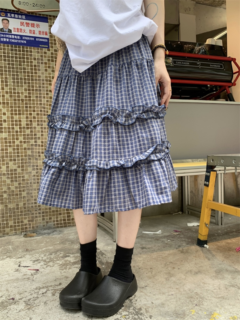 실사 정가 한 부서 무거운 작업 체크무늬 더블 목이버섯 레이스 패치워크 체크무늬 miu 부서 반신 중간 스커트