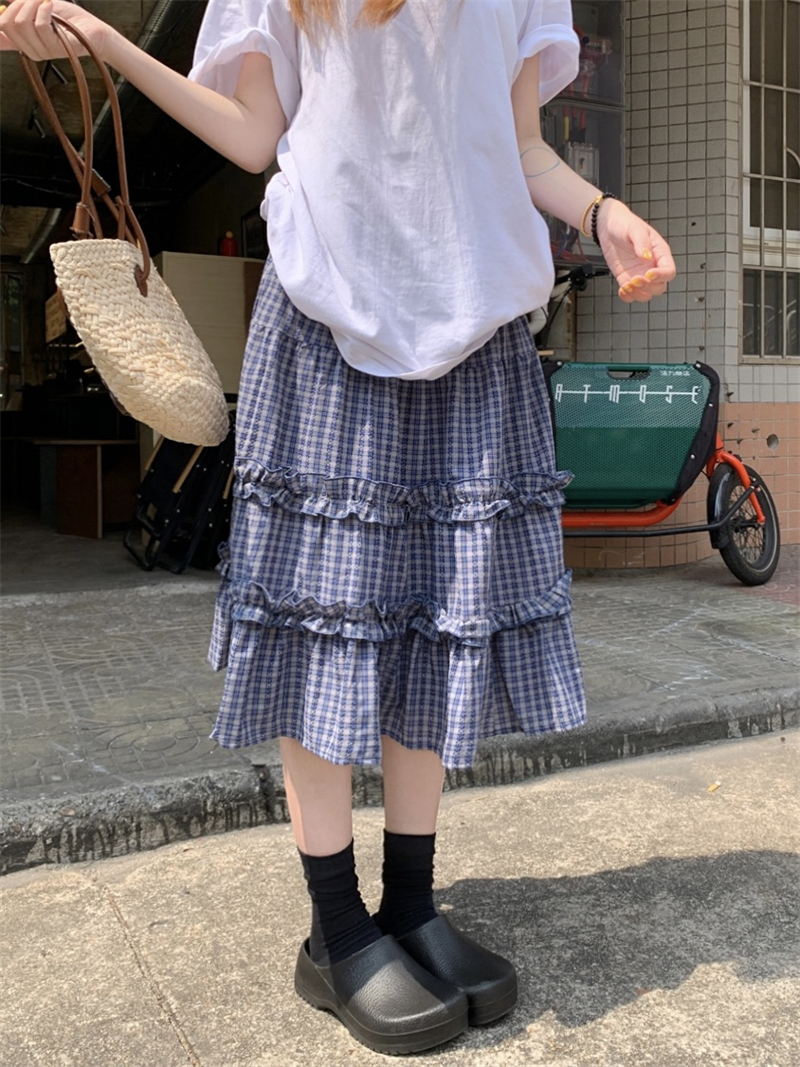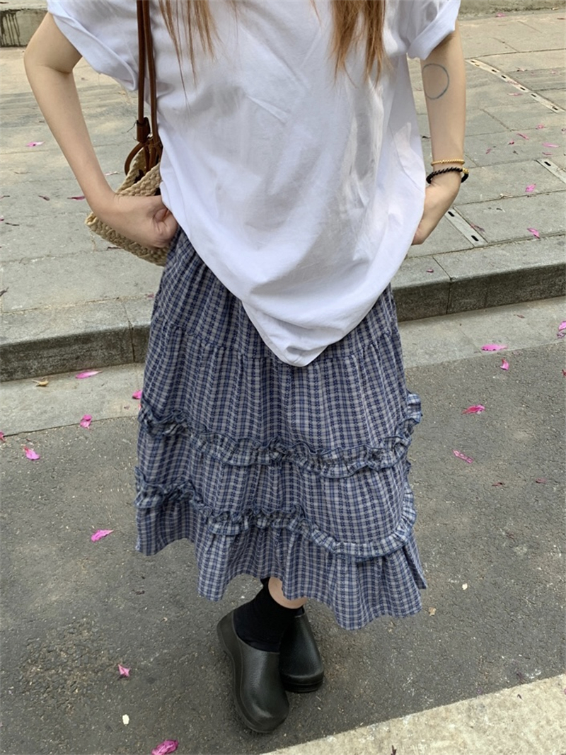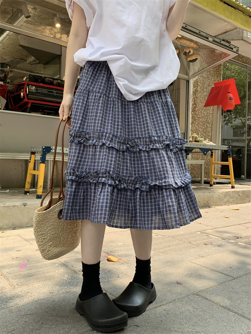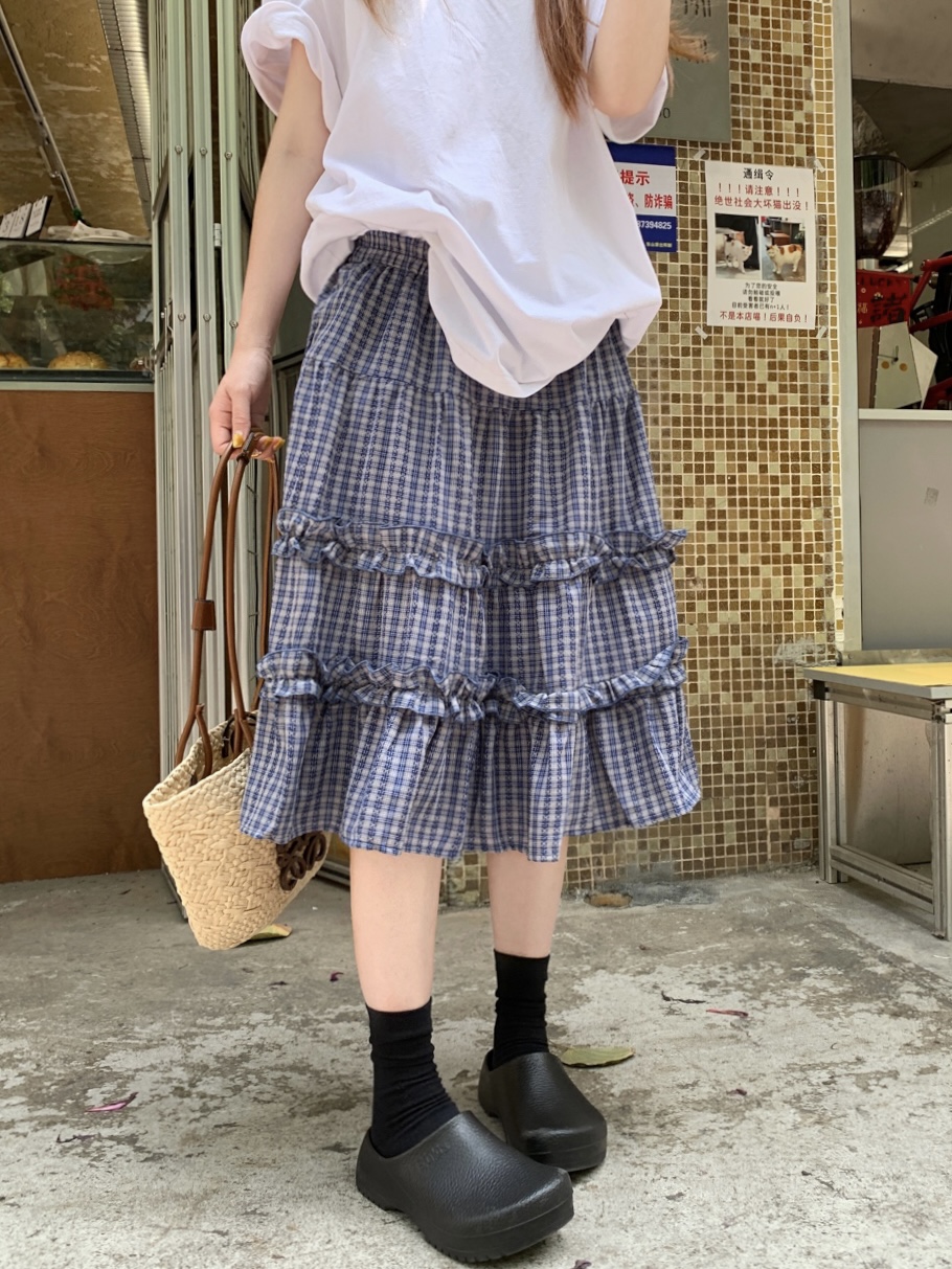 실사 정가 한 부서 무거운 작업 체크무늬 더블 목이버섯 레이스 패치워크 체크무늬 miu 부서 반신 중간 스커트