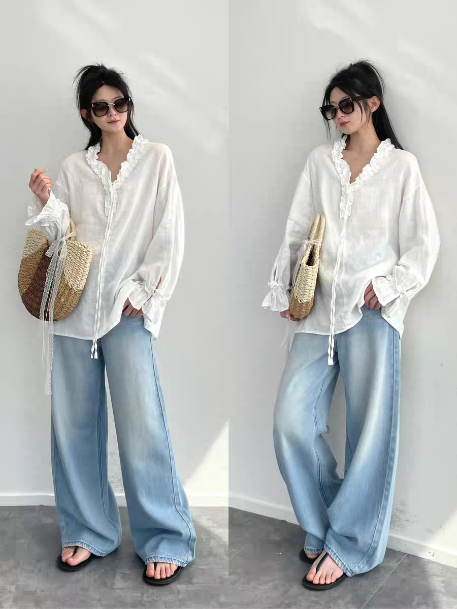제직 섬 느슨함 느긋한 프랑스식 낭만주의 100 아마 수공 프릴 V넥 스트랩 여성 셔츠 2026 봄