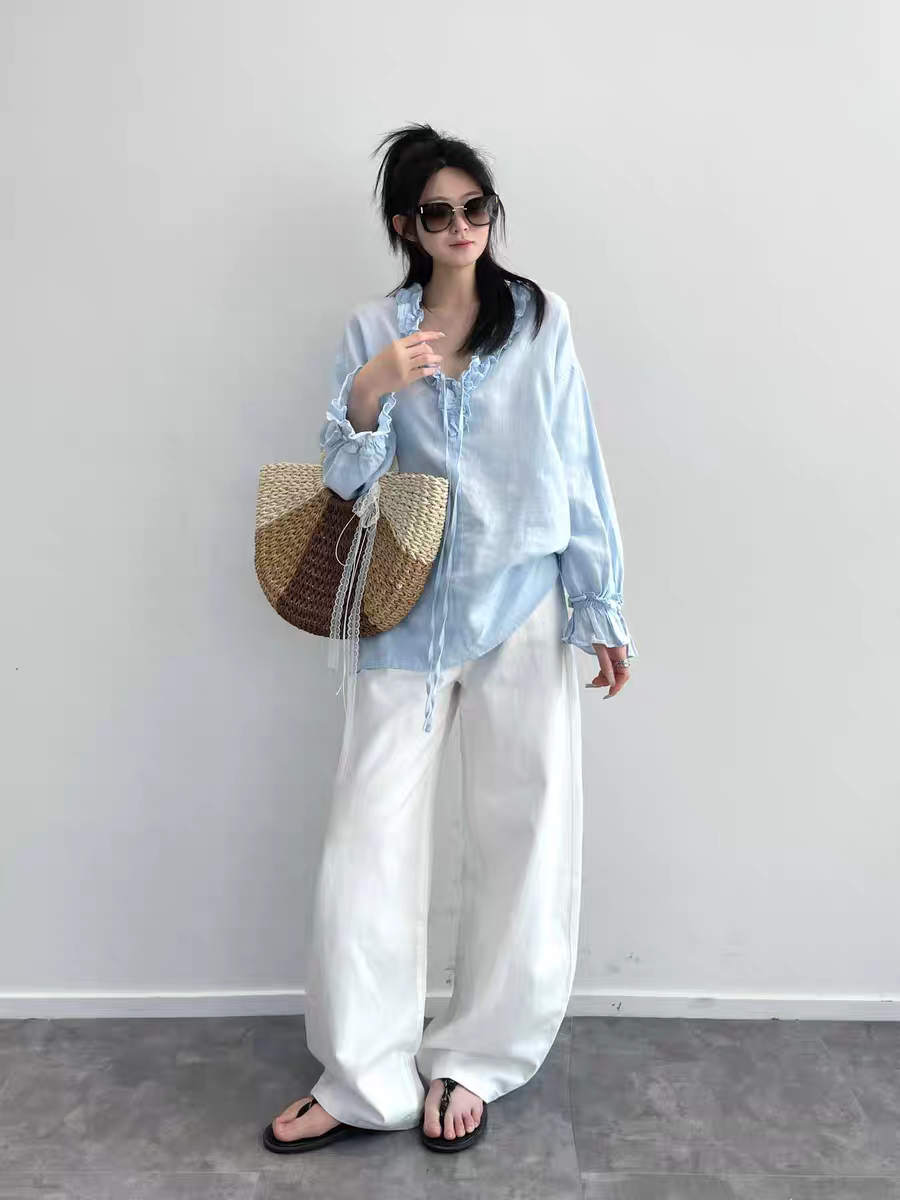 boluo 프랑스식 낭만주의 100 아마 수공 프릴 V넥 스트랩 셔츠 여성 루즈핏 다용도 맨위