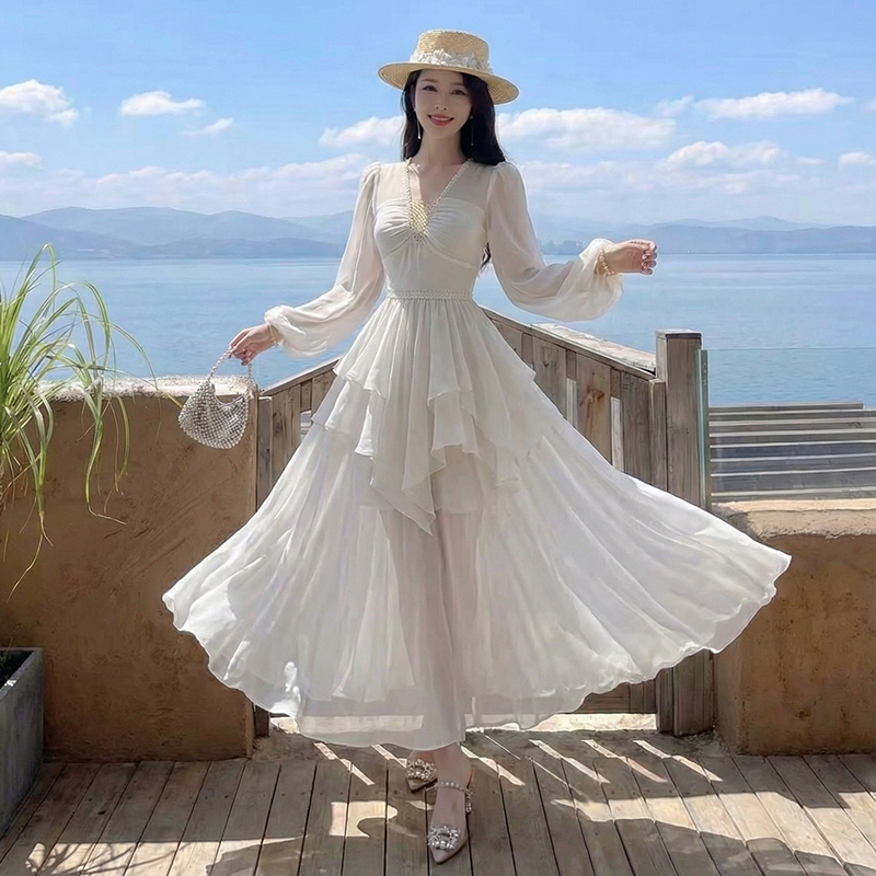새로운 해변 드레스 봄 여름 슈퍼 요정 화이트 롱 스커트 허리 수축 슬림해 보이는 발리 섬 품격 해변가 드레스