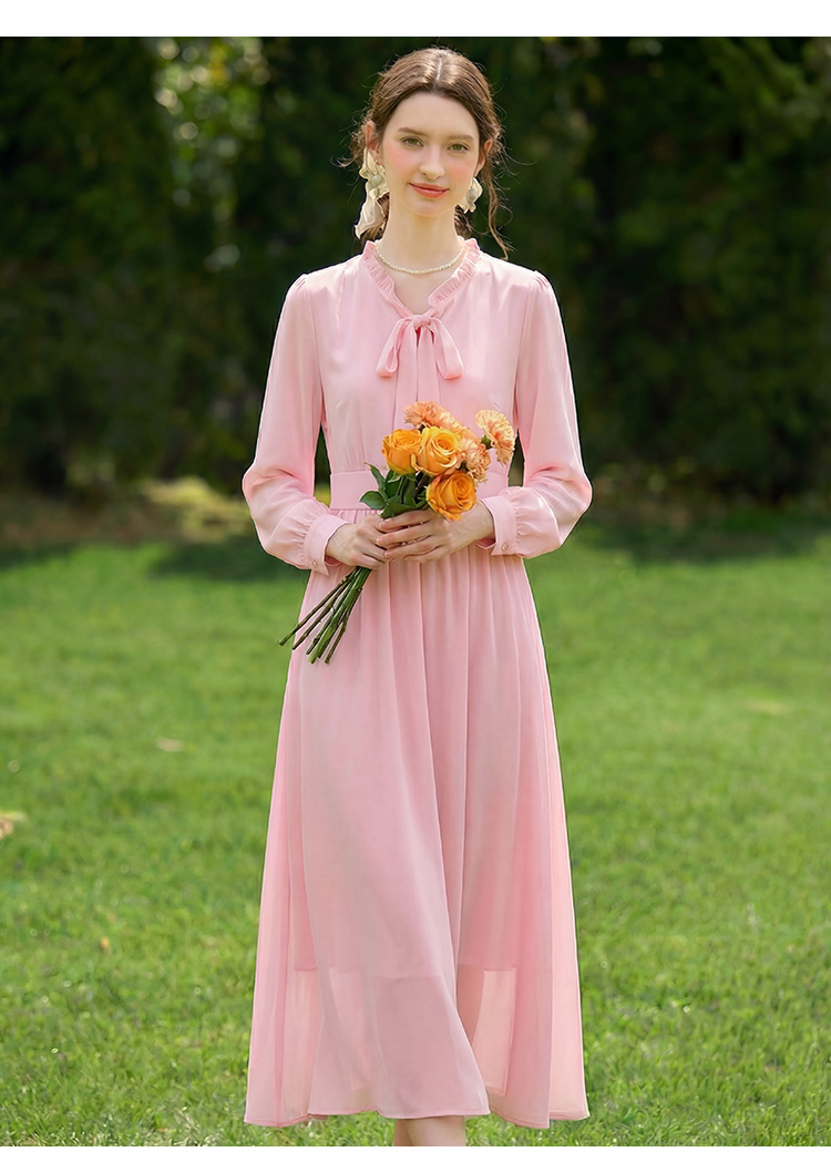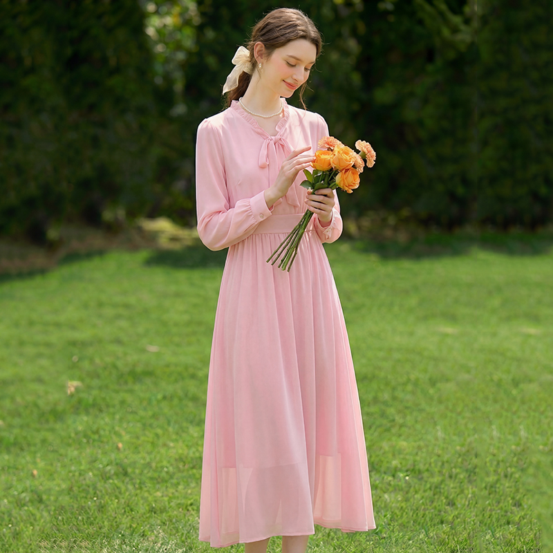 06 년 봄 여름 새로운 여성 프랑스식 우아함 품격 허리 수축 슬림해 보이는 핑크색 고급 센스 긴팔 드레스