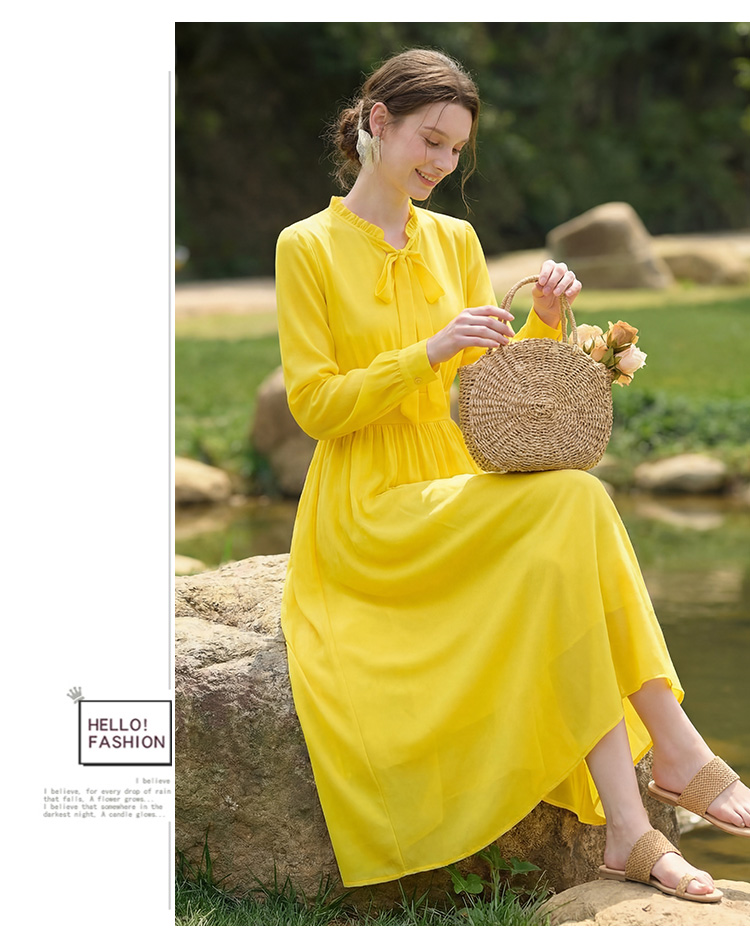 봄 여름 새로운 패션 프랑스식 베이비 칼라 긴팔 쉬폰 여성 드레스 품격 해변가 휴가 해변 길다 치마