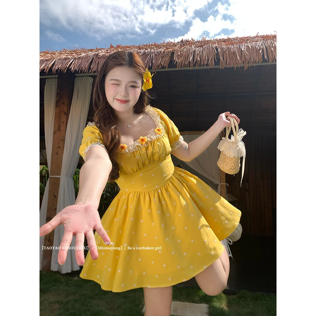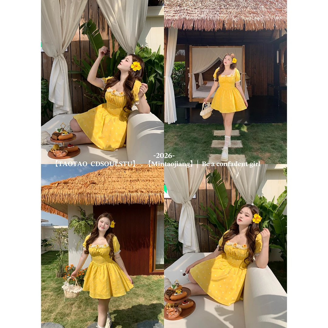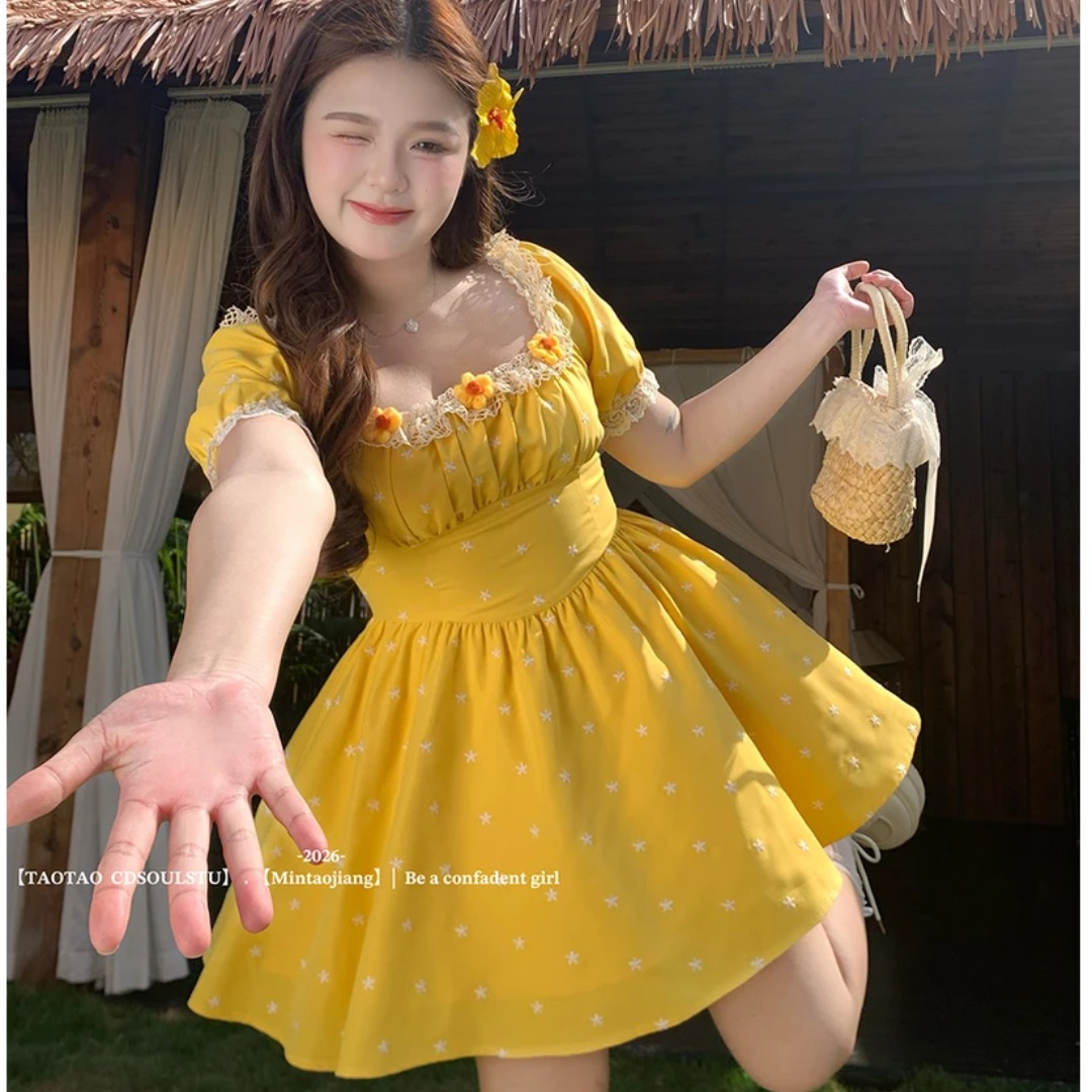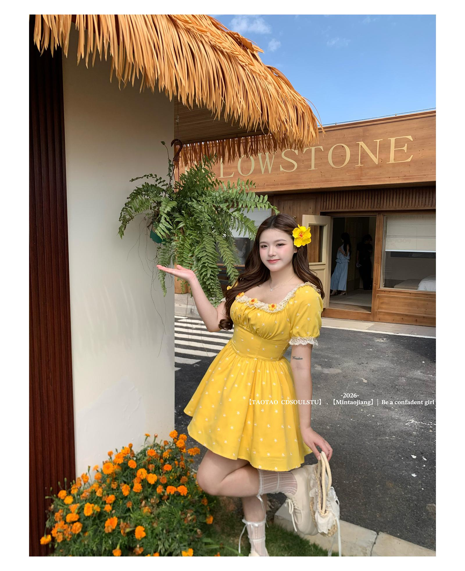 sweet 산소 레몬 마이크로 지방 프랑스식 달콤함 소녀 허리 수축 꽃무늬 광장 칼라 3 차원 꽃 반팔 드레스