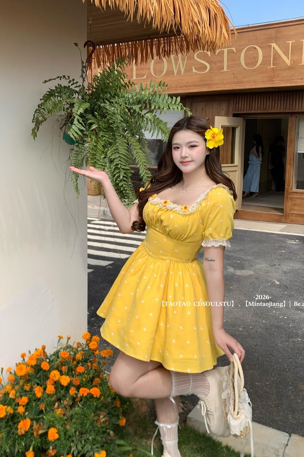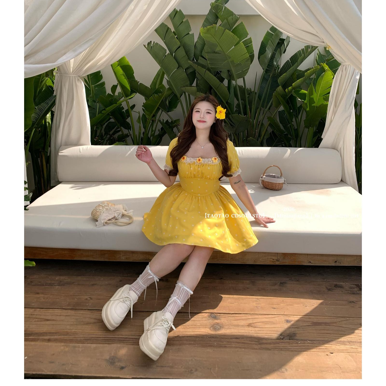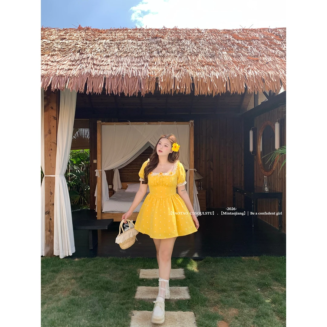 sweet 산소 레몬 마이크로 지방 프랑스식 달콤함 소녀 허리 수축 꽃무늬 광장 칼라 3 차원 꽃 반팔 드레스