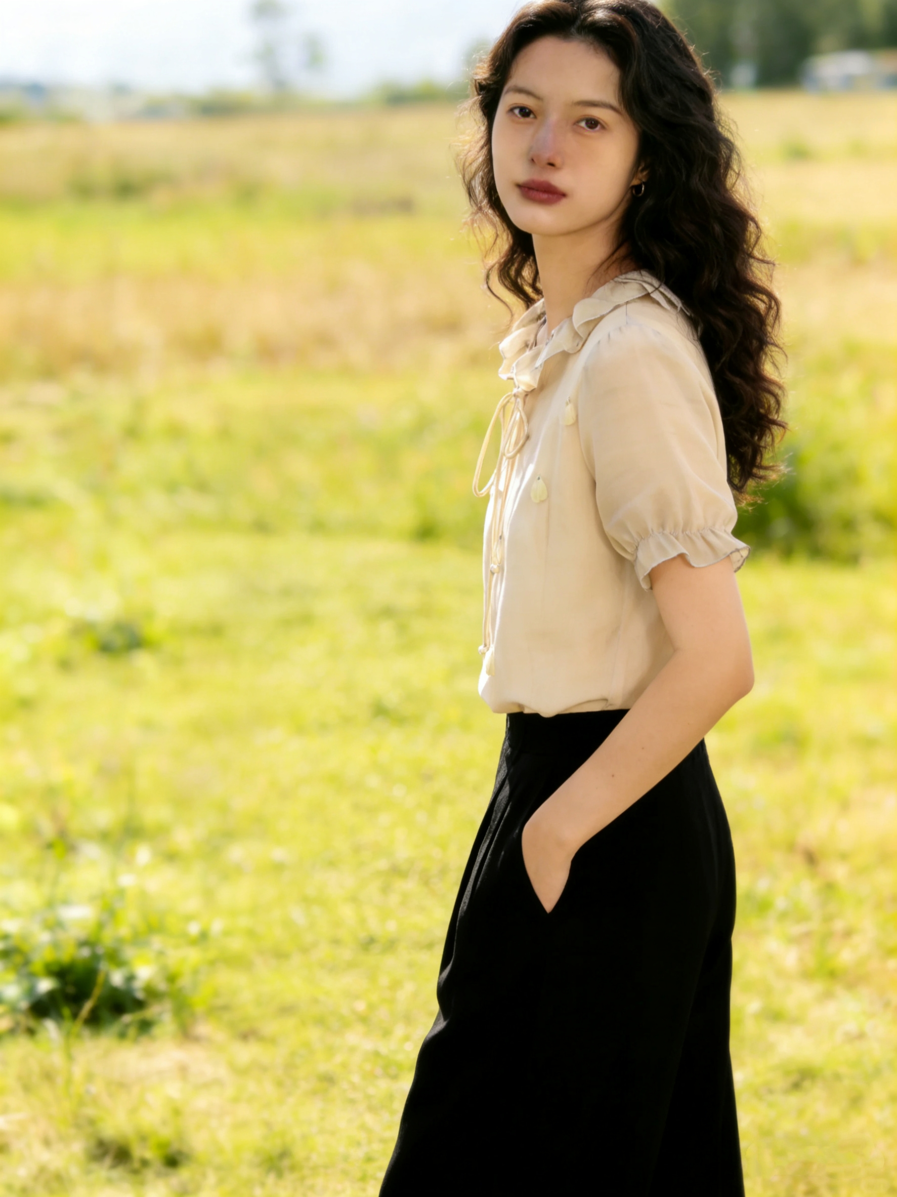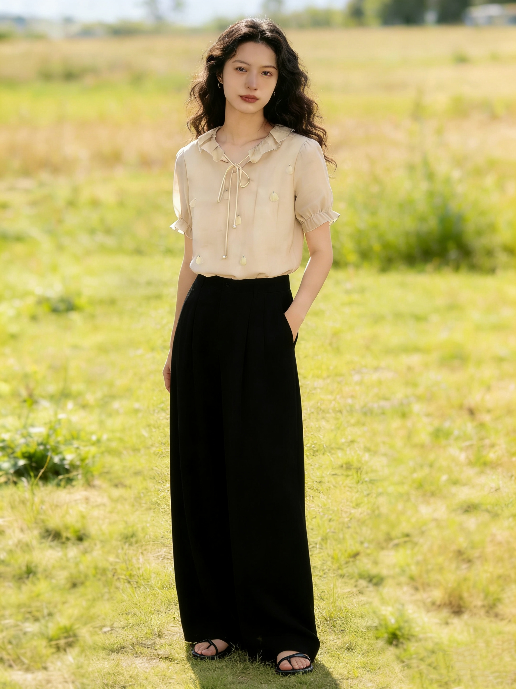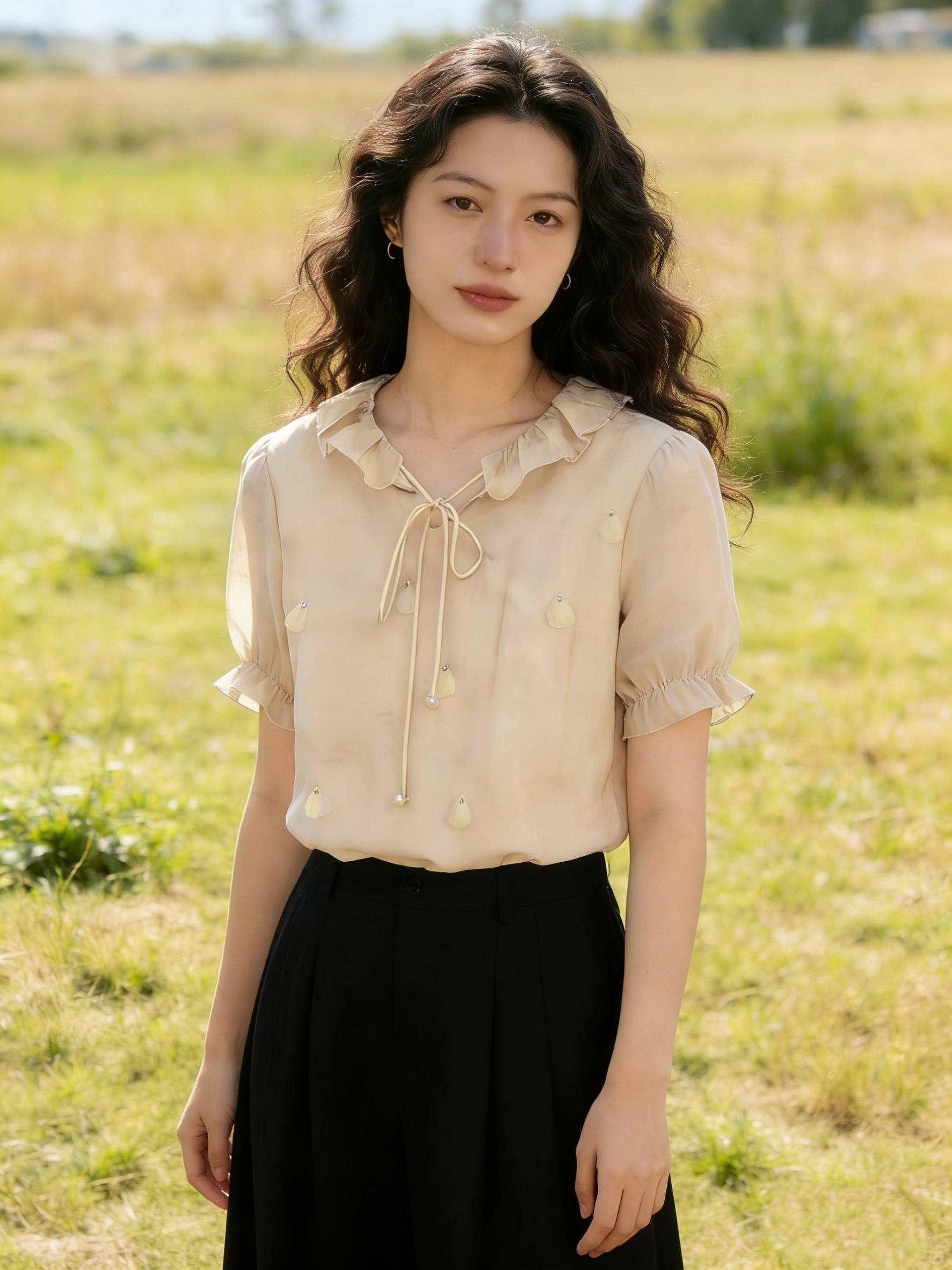 실사 오리지널 계단식 꽃 리플 2026 봄 3 차원 꽃 긍정적 인 어깨 디자인 센스 리본 긴팔 셔츠