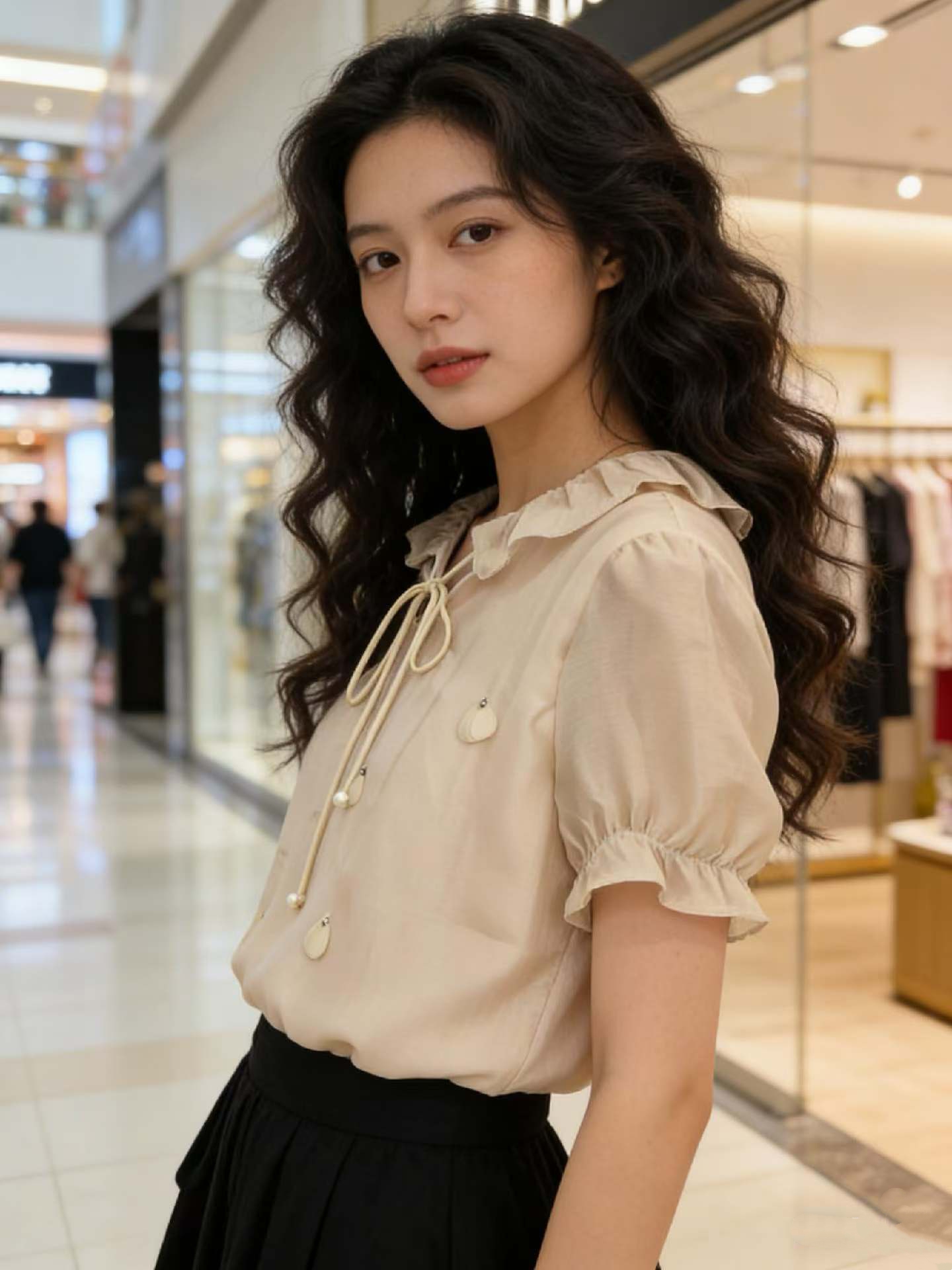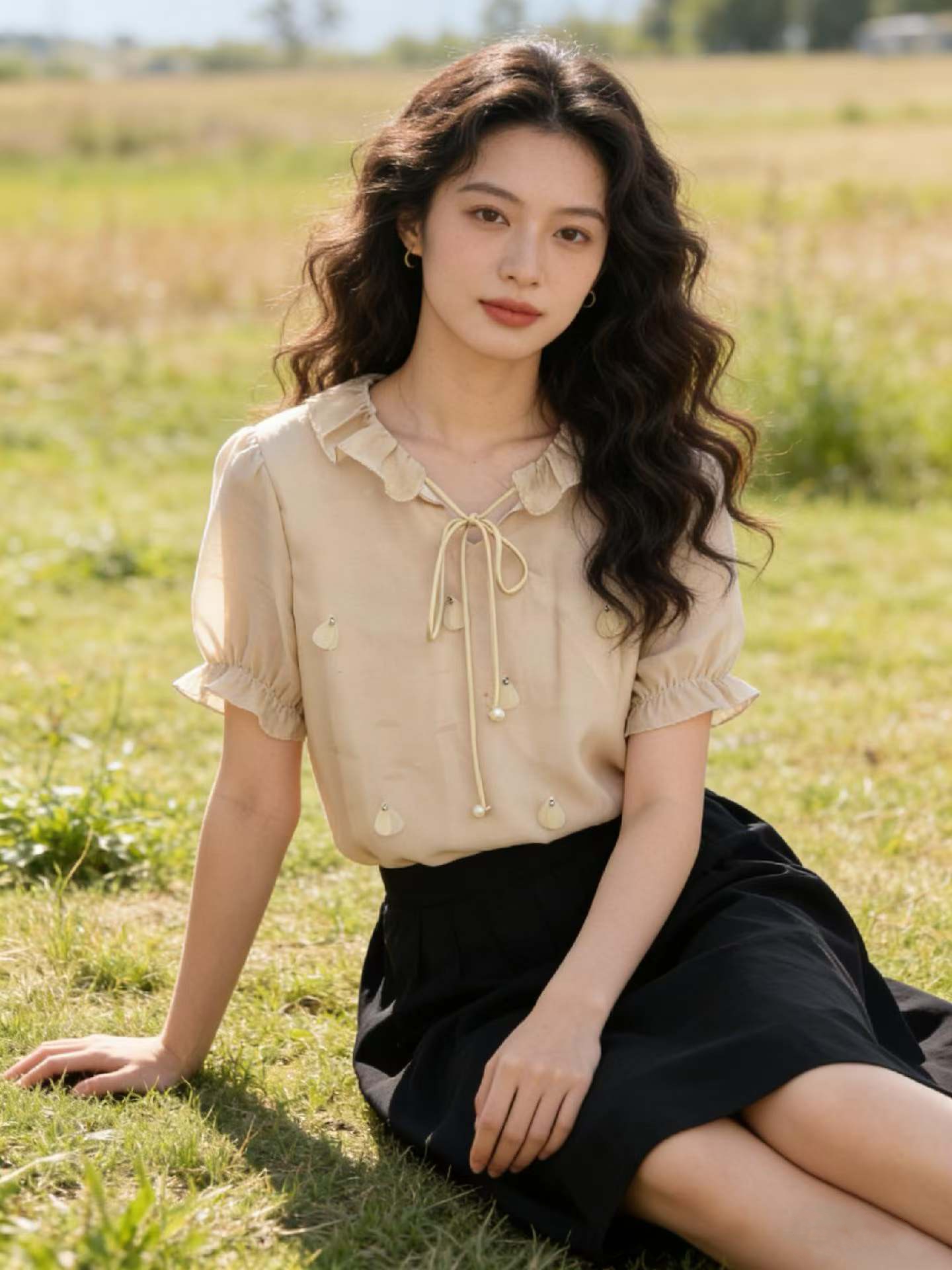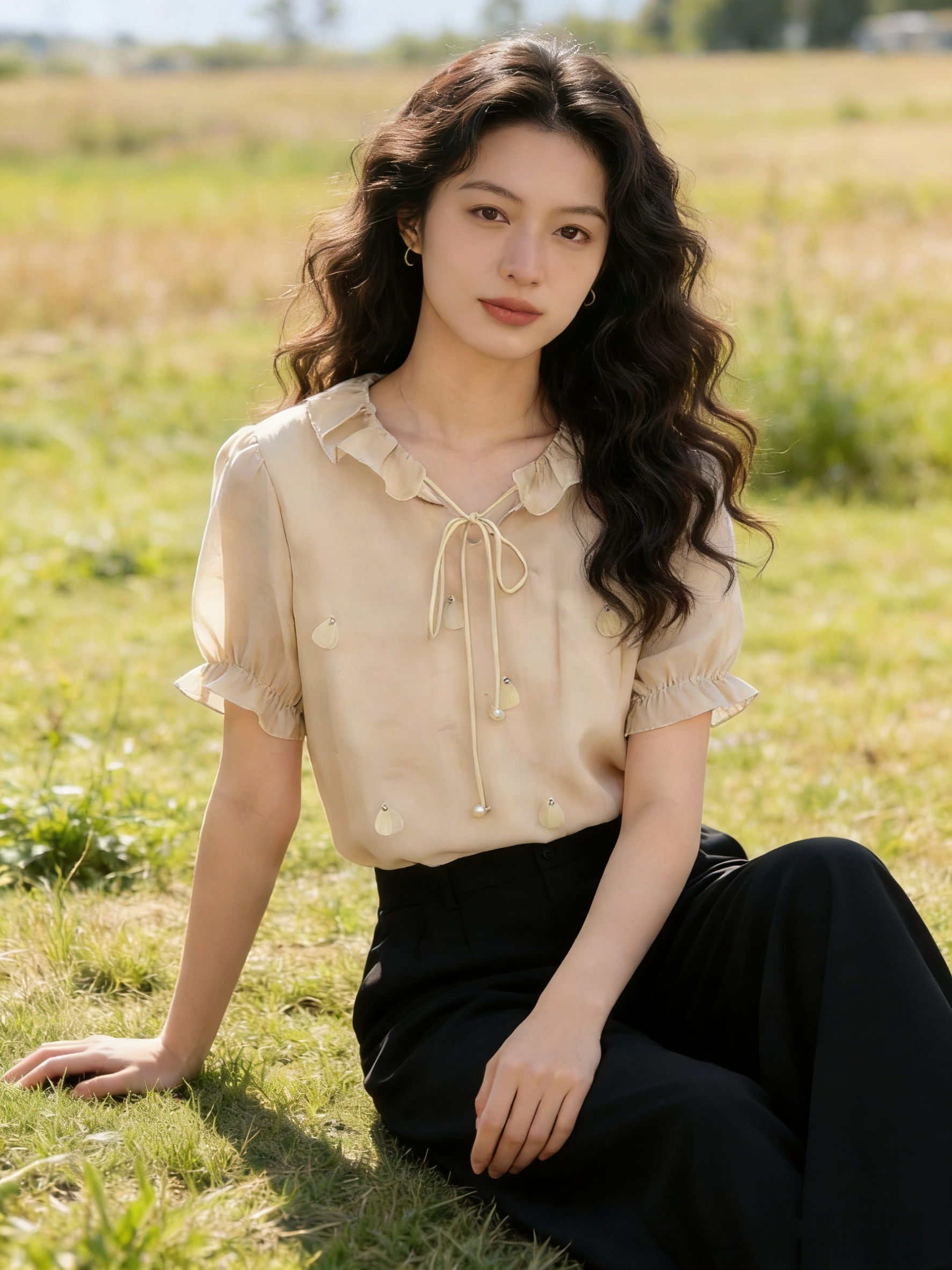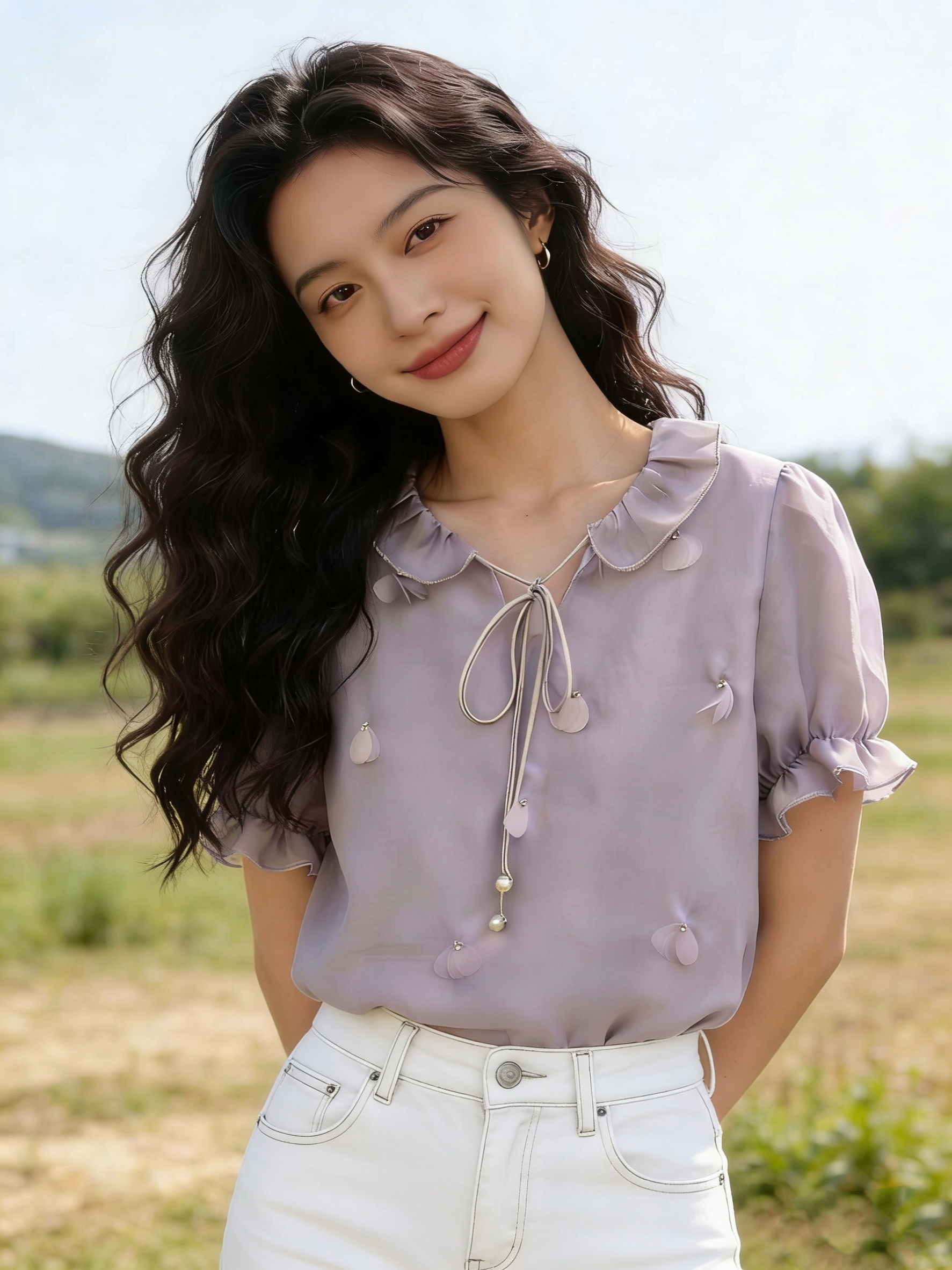md 입력 오리지널 계단식 꽃 리플 2026 봄 3 차원 꽃 긍정적 인 어깨 디자인 센스 리본 긴팔 셔츠