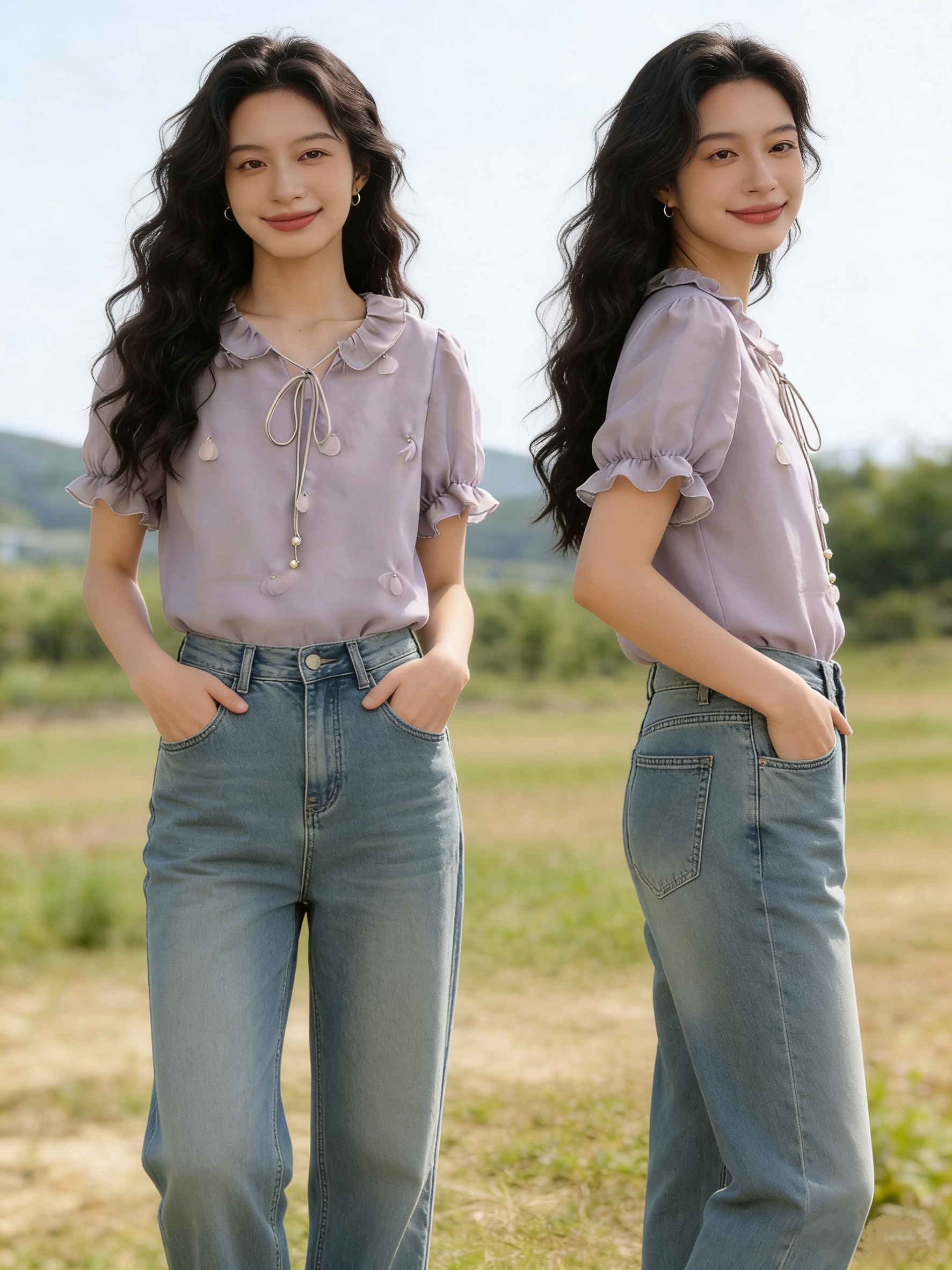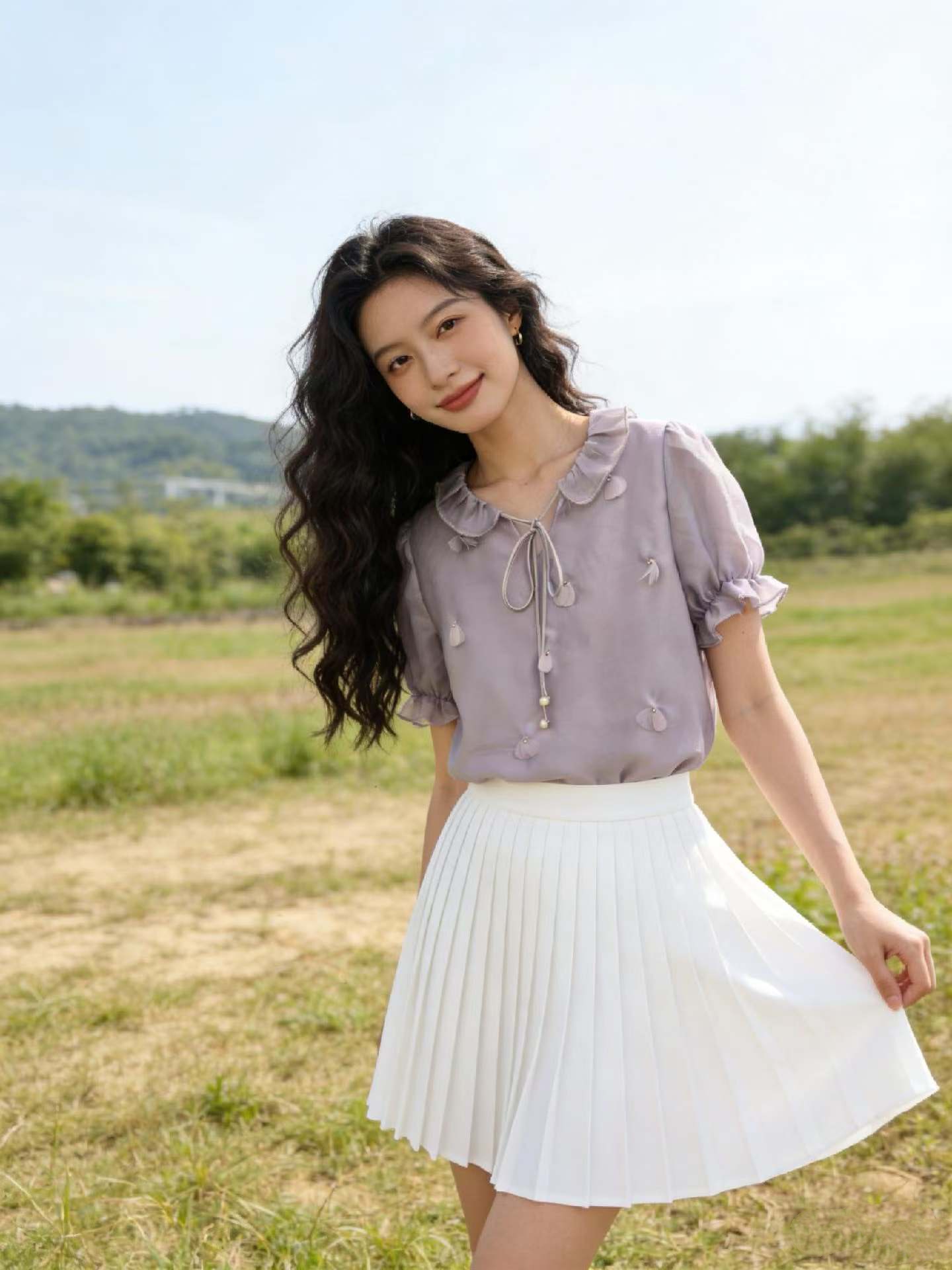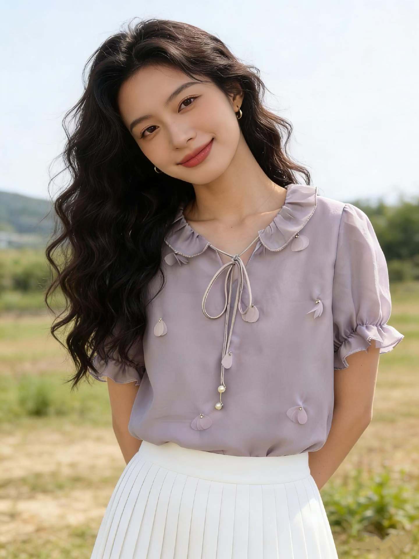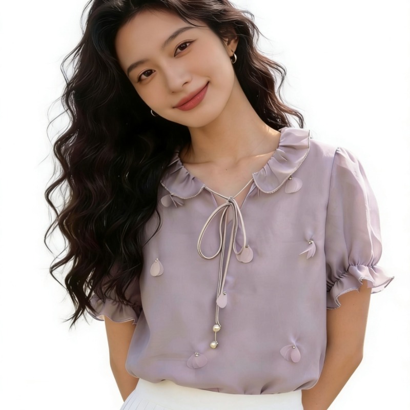 실사 프랑스식 반팔 셔츠 2026 새로운 여성 여름 3 차원 꽃 루즈핏 셔츠 트렌드 보라색 맨위