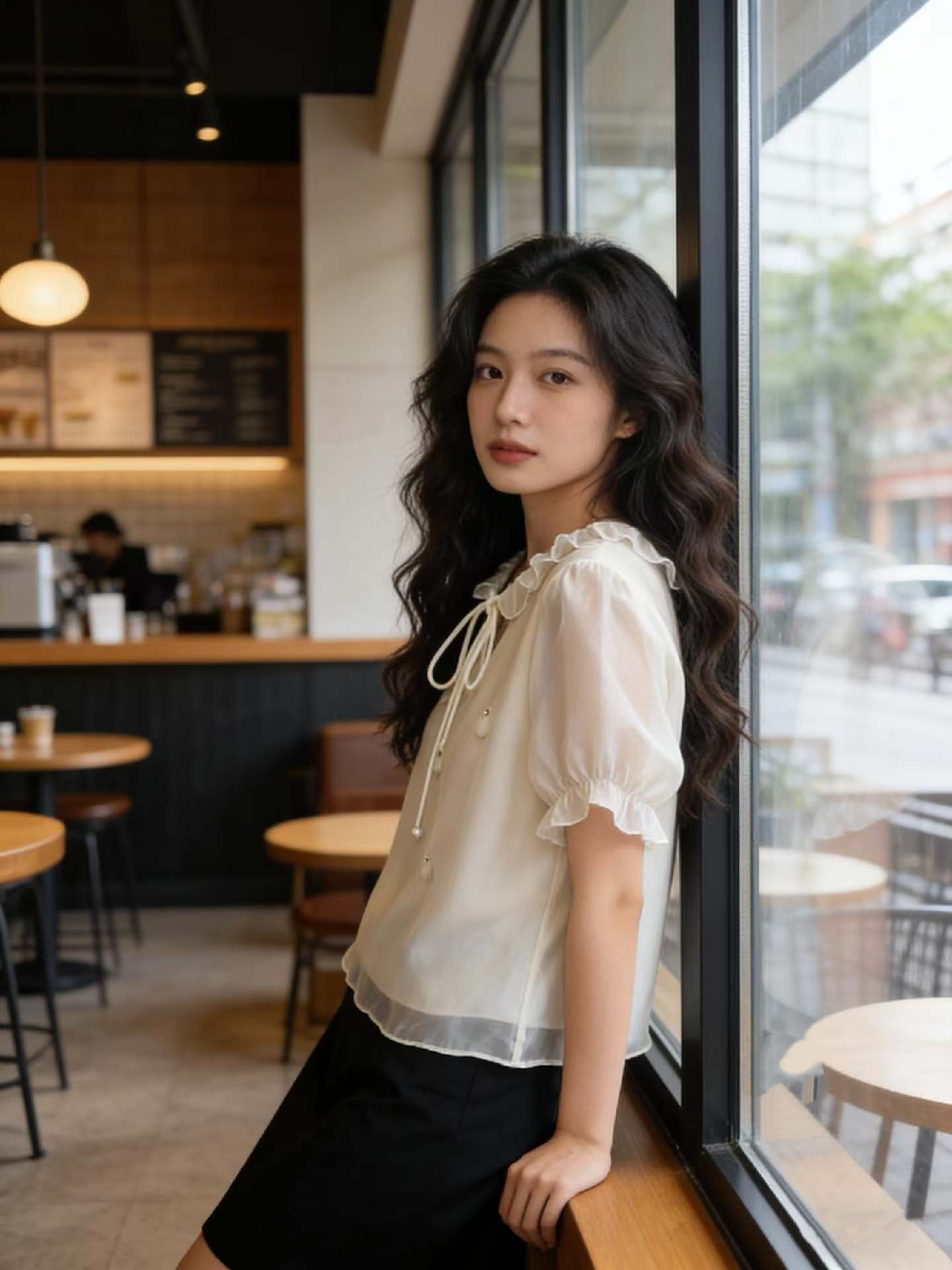 실사 파란색 쉬폰 여성 셔츠 2026 새로운 프랑스식 맨위 V넥 작은 셔츠 홀로우 아웃 작은 대중 셔츠 여성