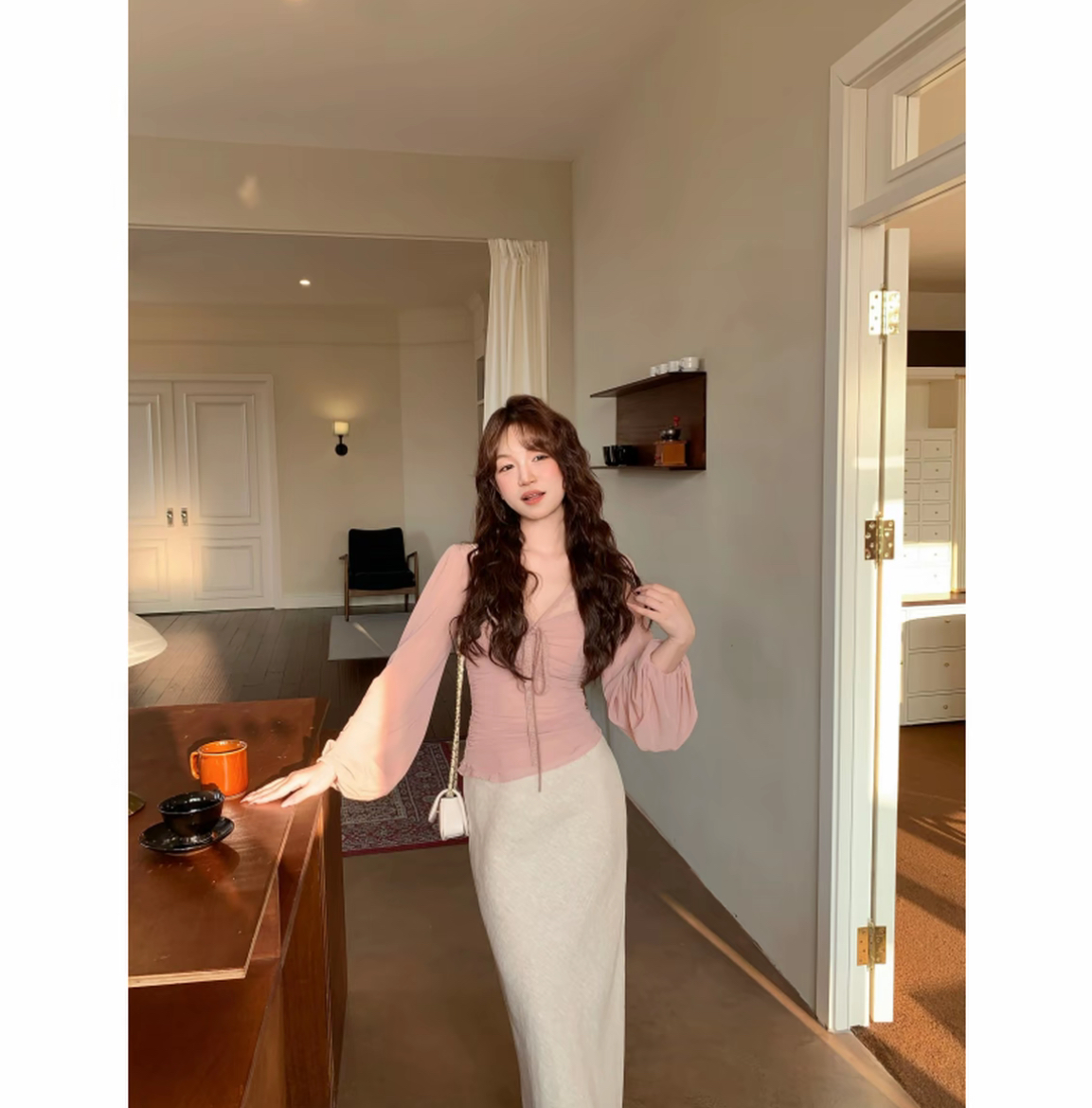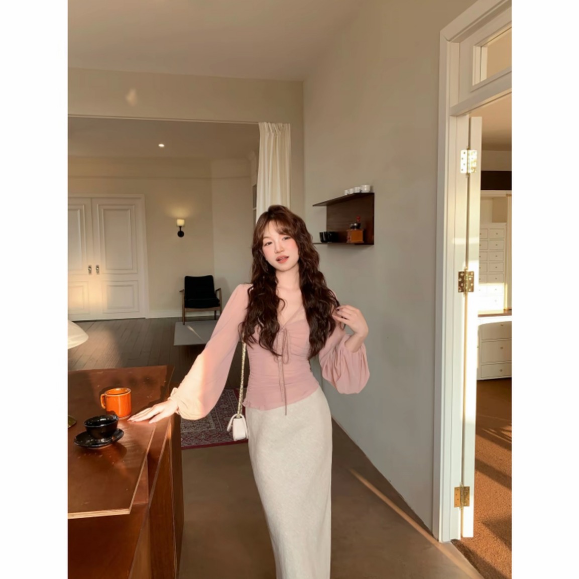 2026 여름 새로운 디자인 센스 작은 대중 패션 품격 여성 V넥 반팔 티셔츠 다용도 작은 레이스 치마