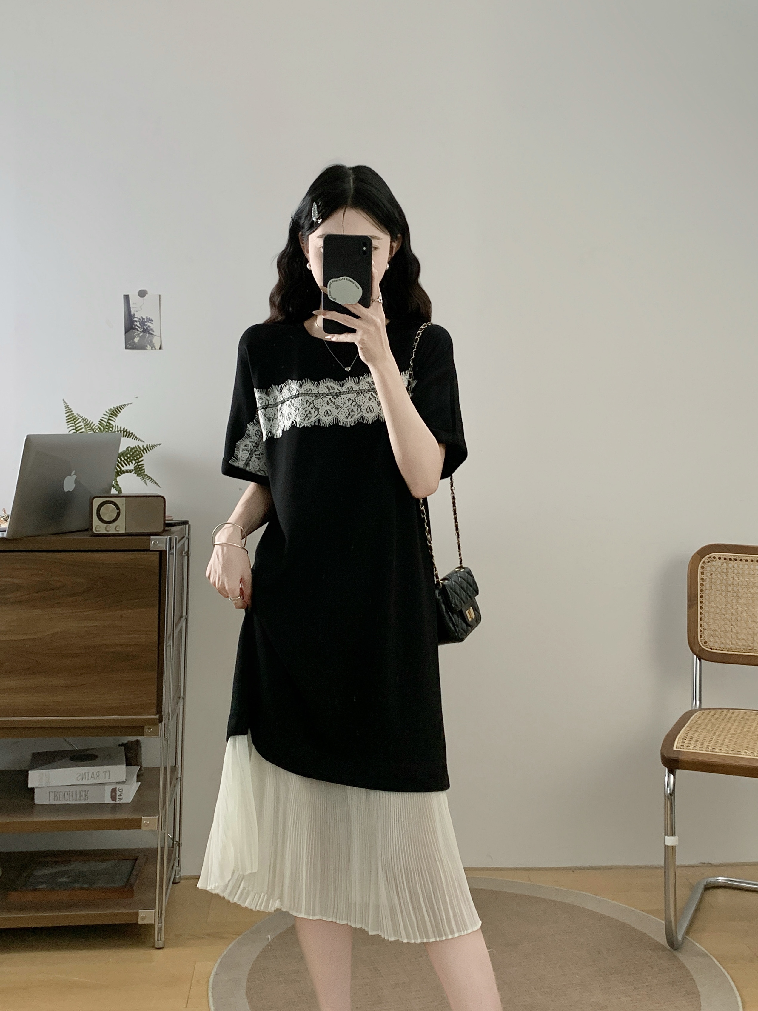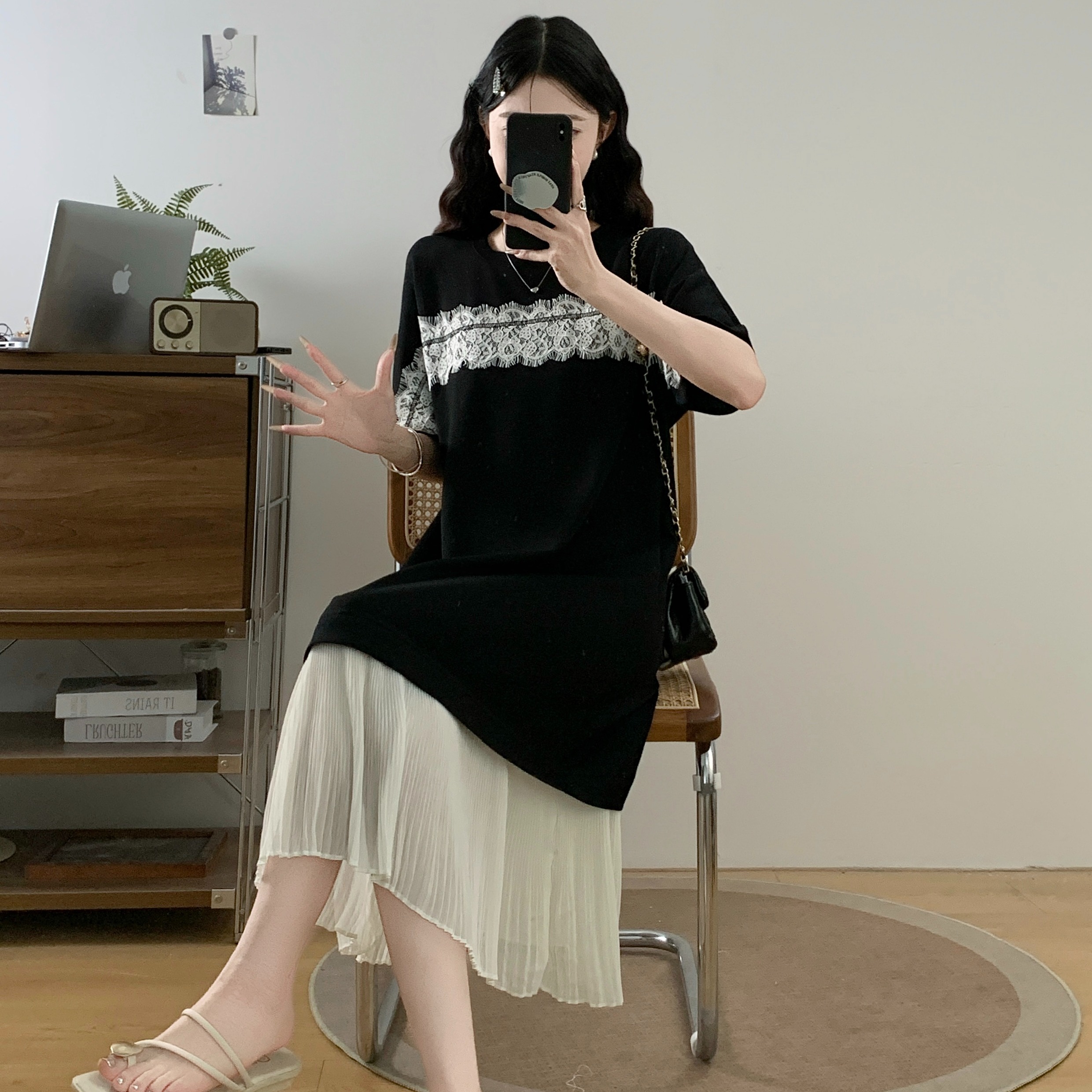실사 빅 사이즈 여성 의류 지방 mm 봄 여름 디자인 센스 패치워크 레이스 불규칙 루즈핏 티셔츠 맨위 기본 셔츠