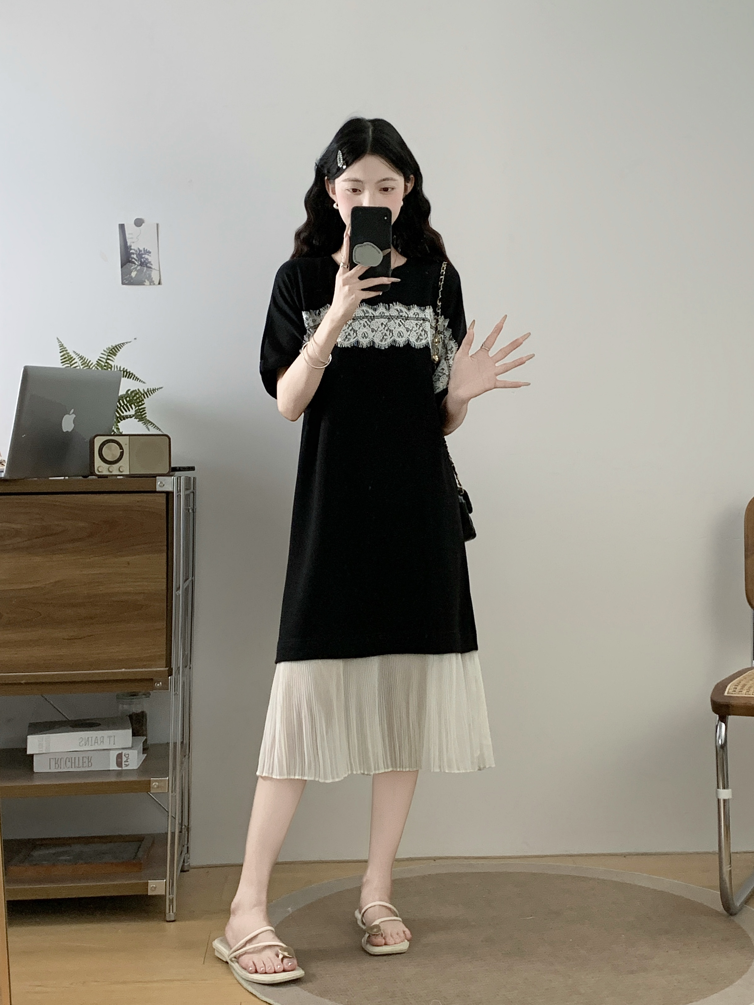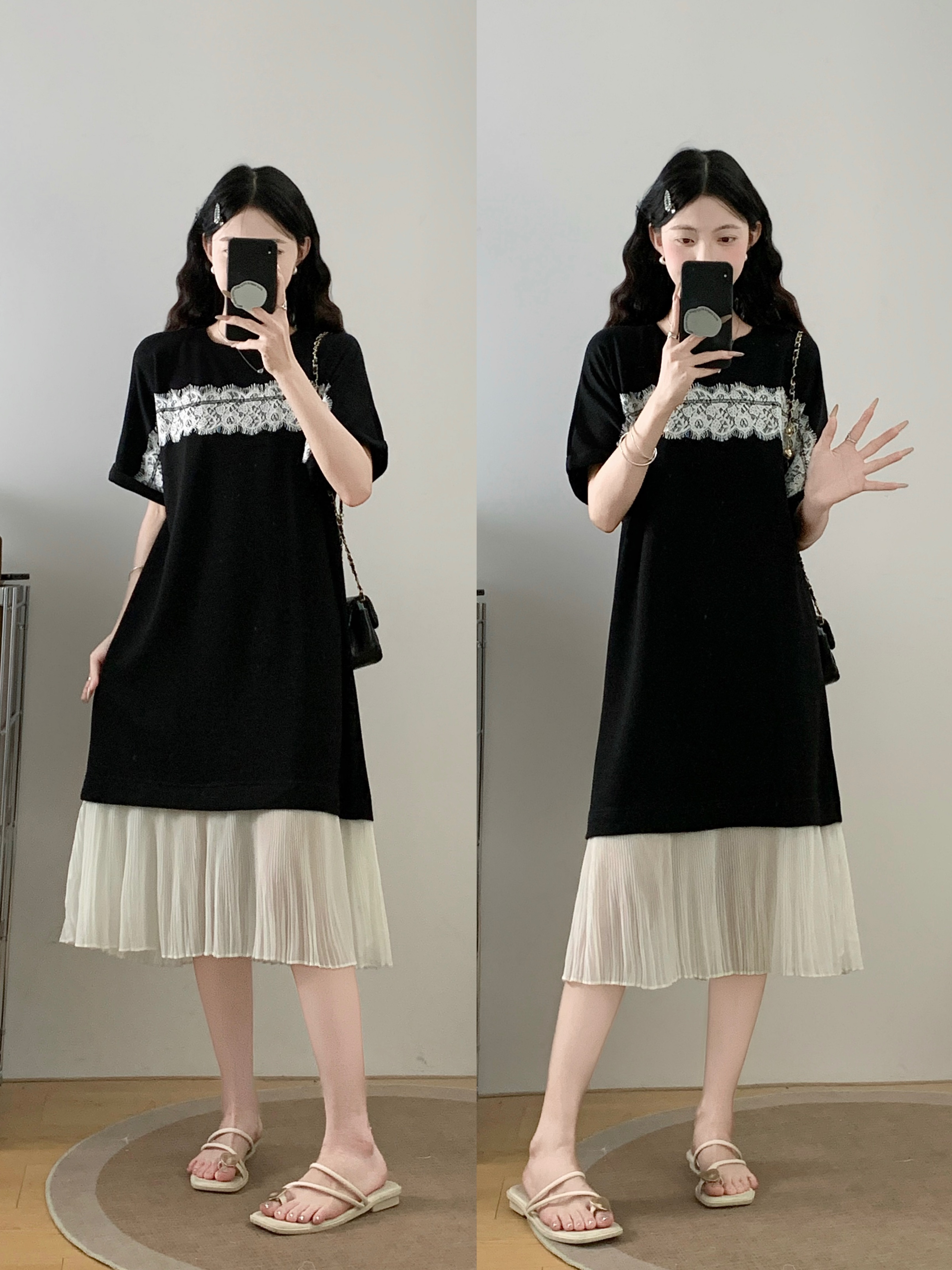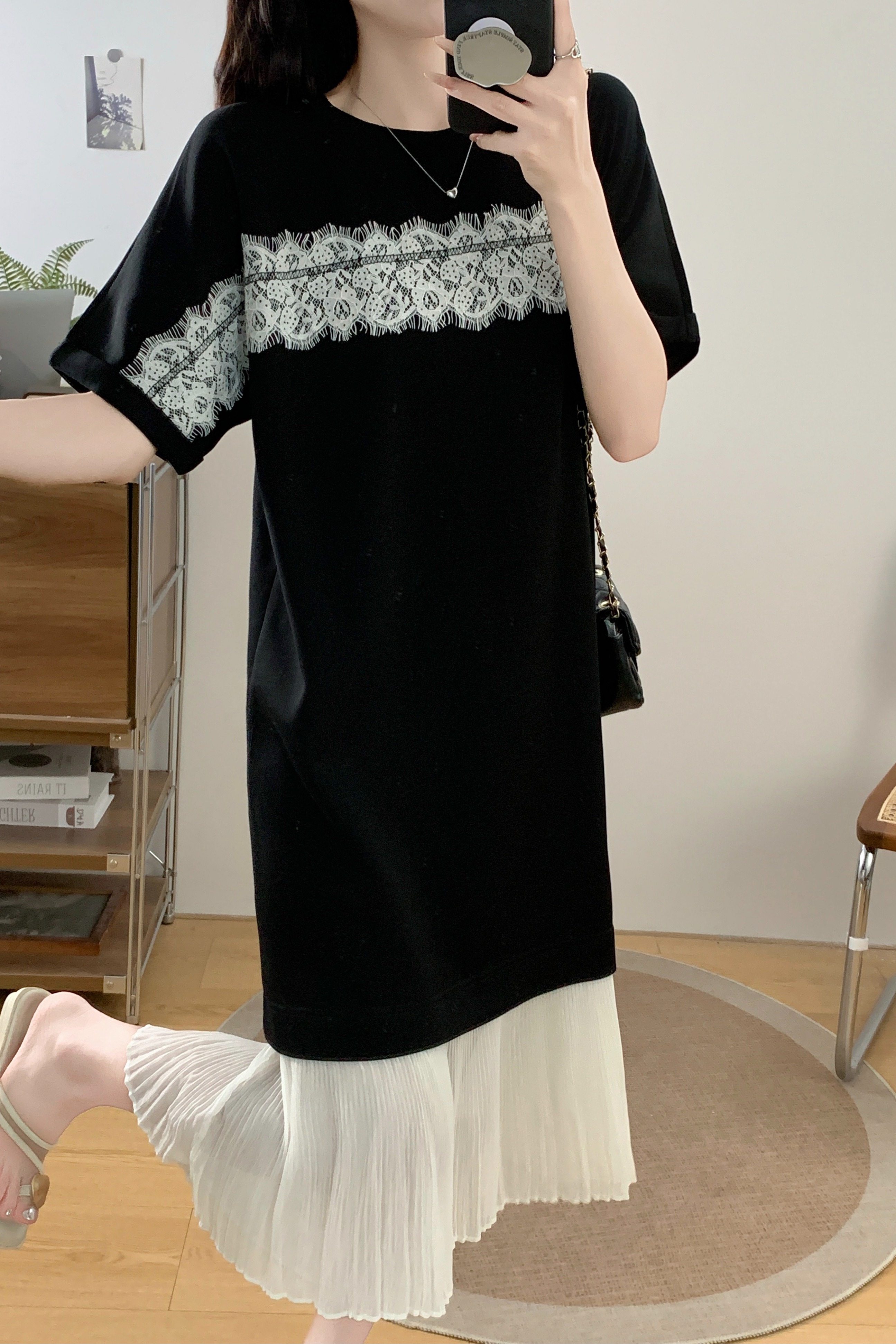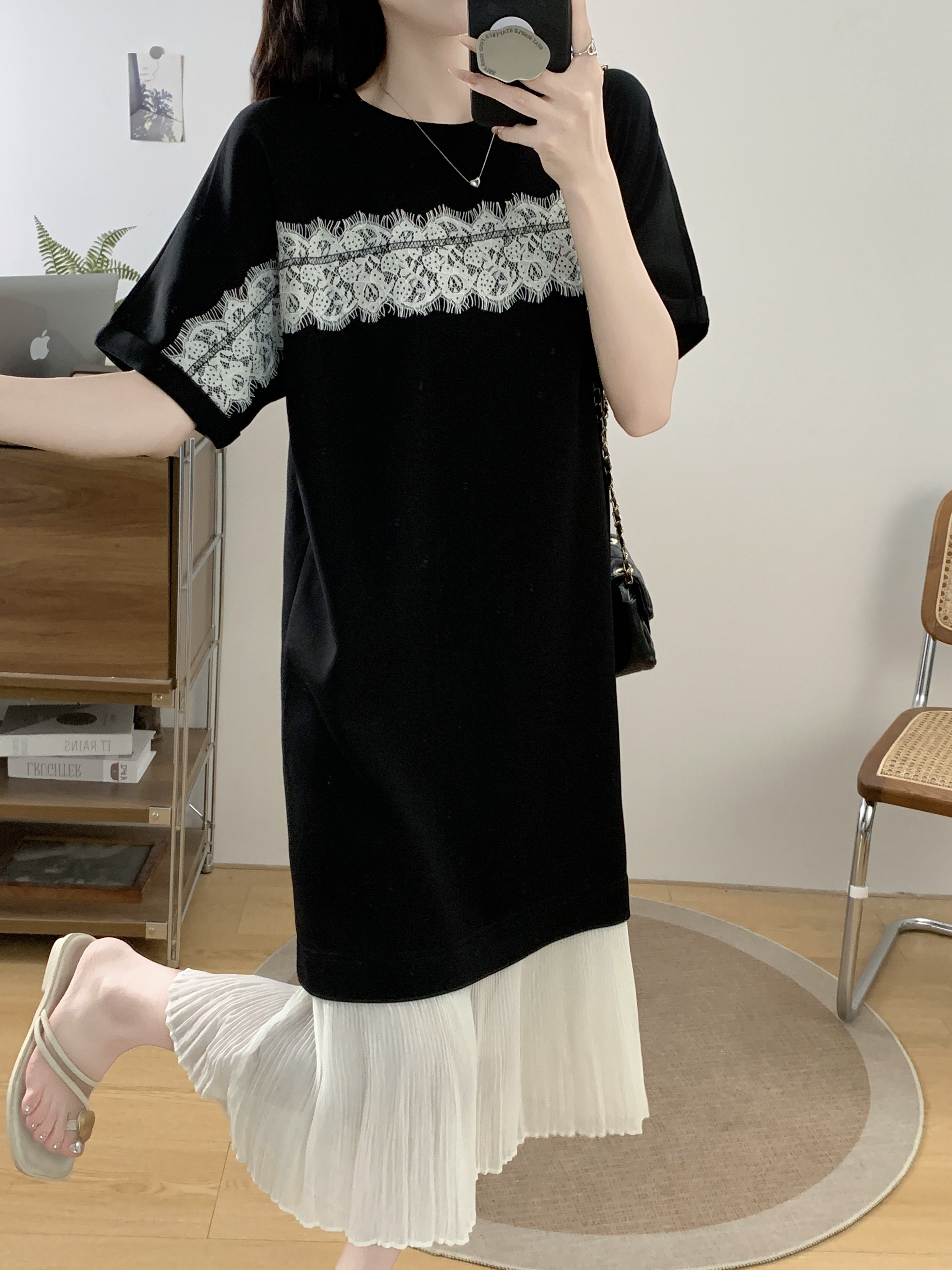 실사 빅 사이즈 여성 의류 2026 여름 프랑스식 패션 캐주얼 레이스 조각 페이크 레이어드 슬림해 보이는 반팔 드레스