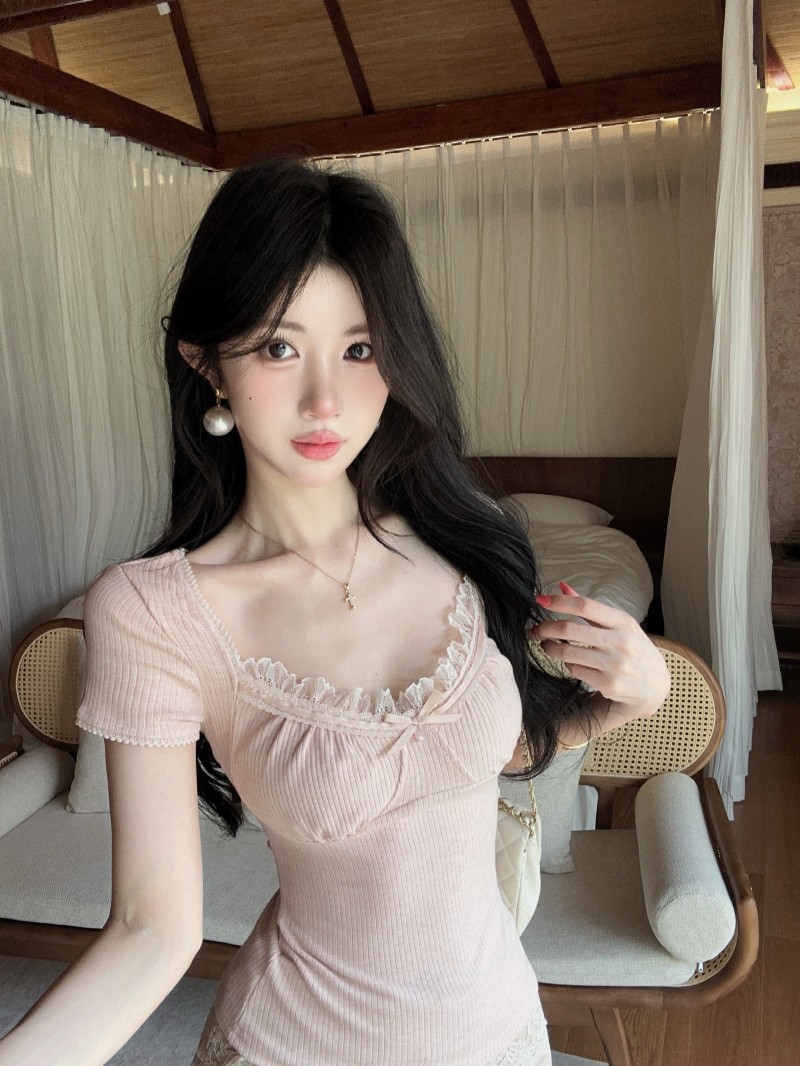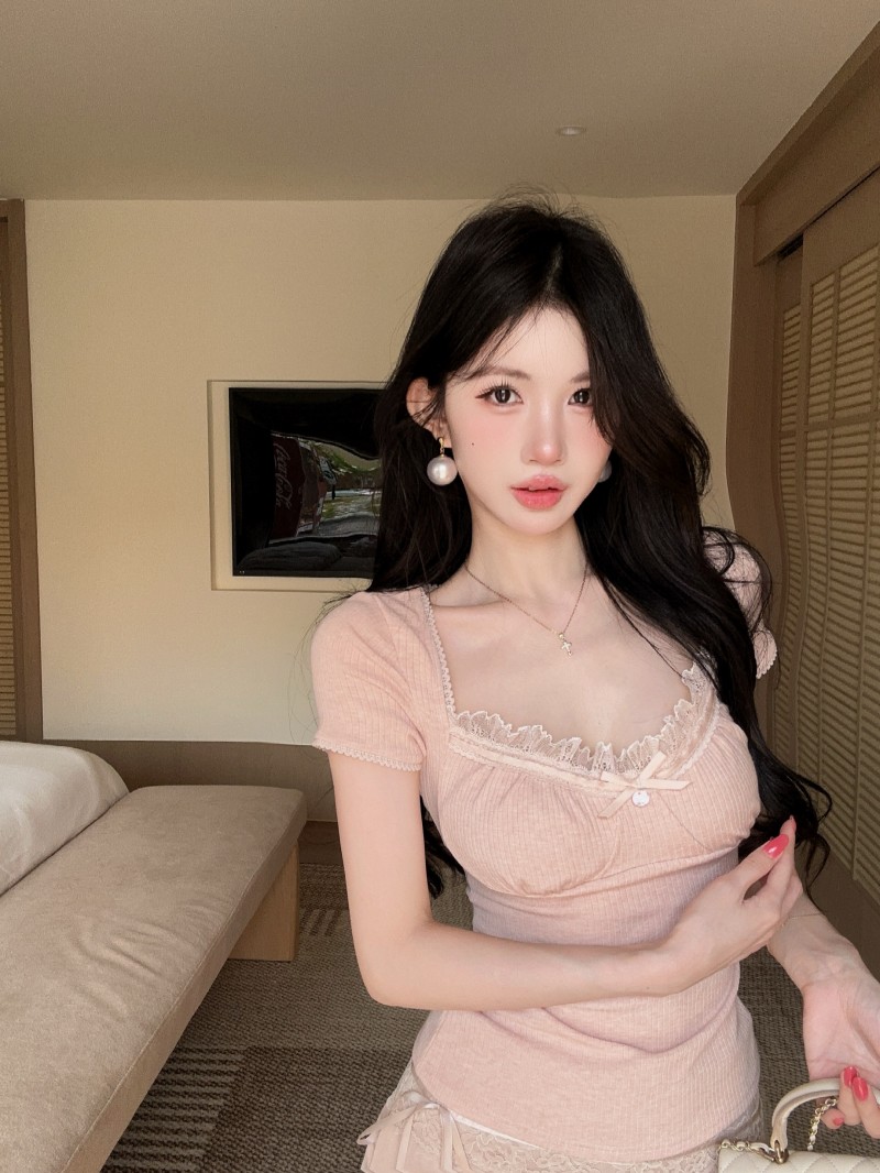 실사 정가 감소되지 않음 티셔츠 여성 의류 디자인 센스 작은 대중 불규칙 광장 칼라 타이트 쇼트 스타일 반팔 맨위