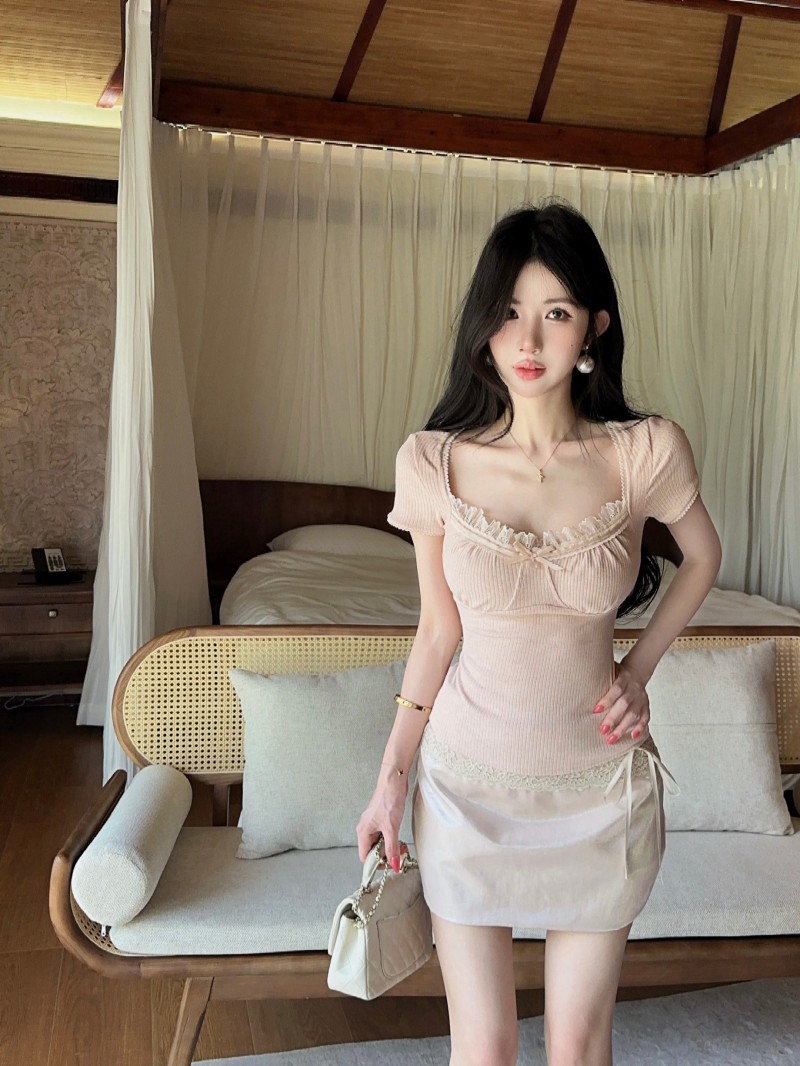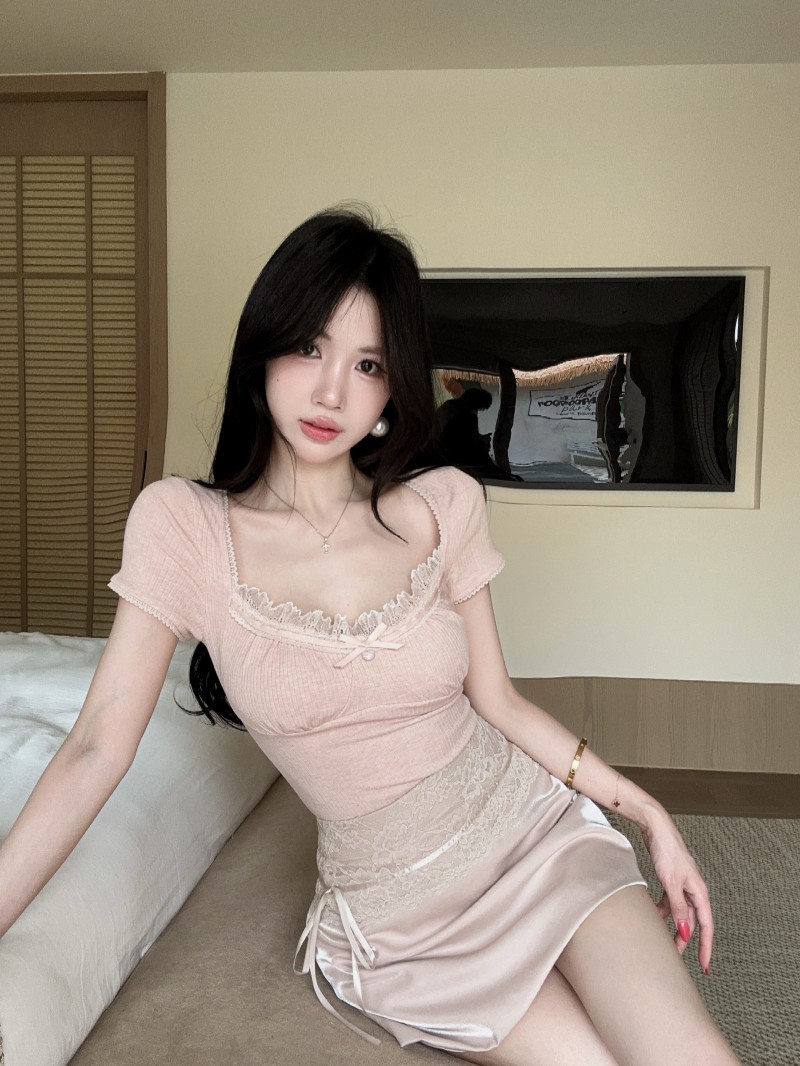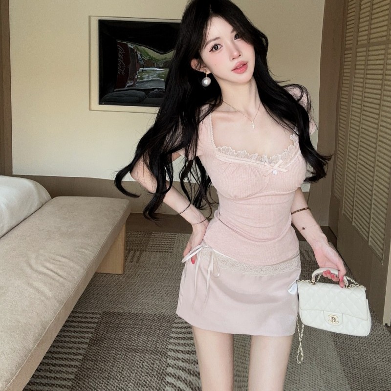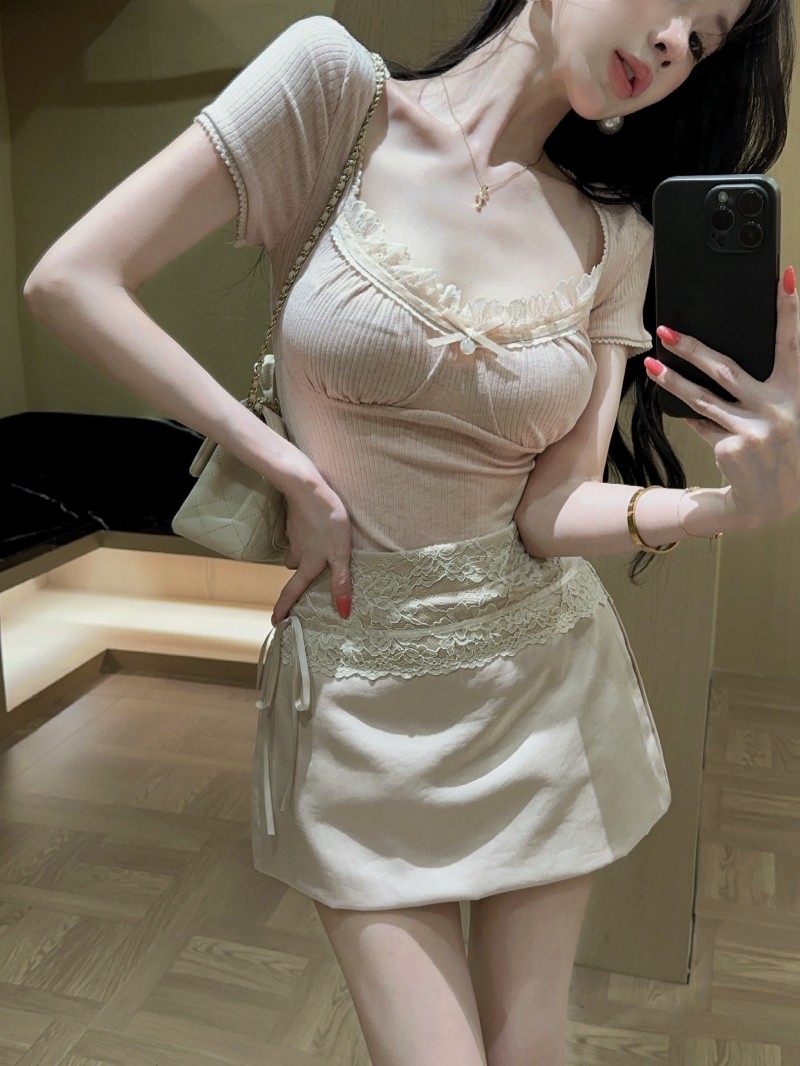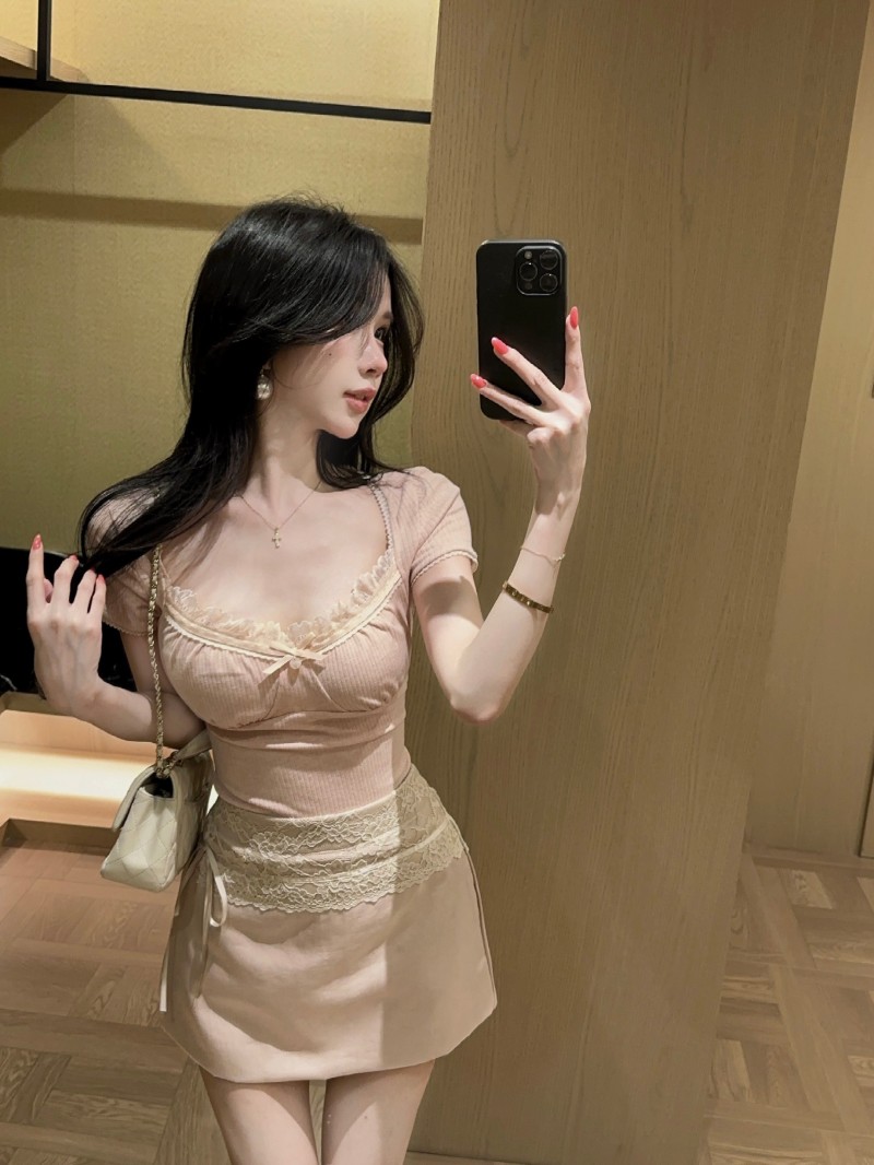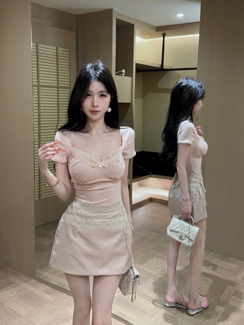 실사 정가 감소되지 않음 캐주얼 세트 레이스 조각 반팔 티셔츠 품격 하이웨이스트 타이트 스커트 반신 스커트 투피스 세트