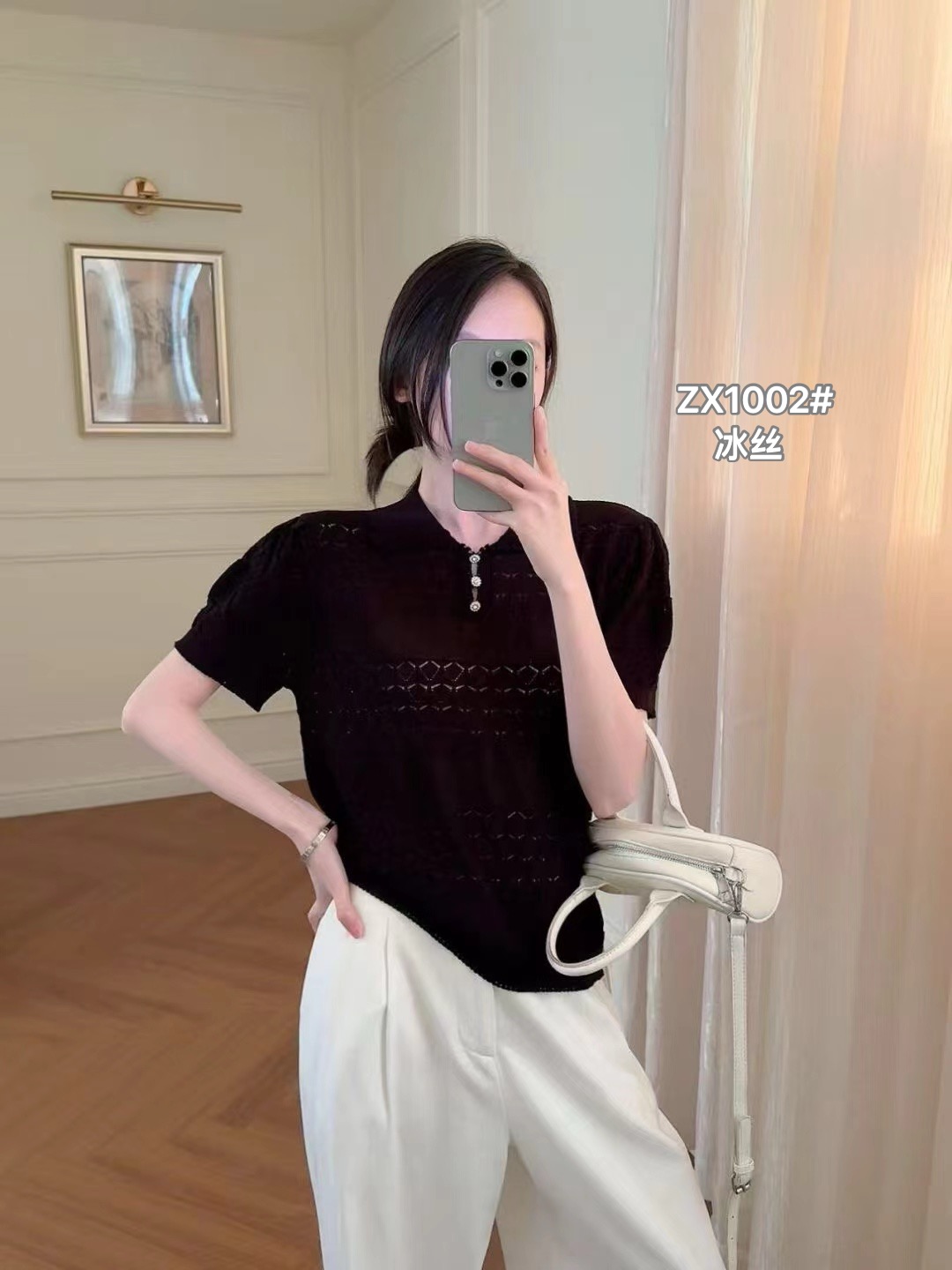 배색 반팔 니트 티셔츠 여성 여름 새로운 라운드 넥 디자인 센스 작은 대중 홀로우 아웃 몸매 가꾸기 쇼트 스타일 핫걸 맨위