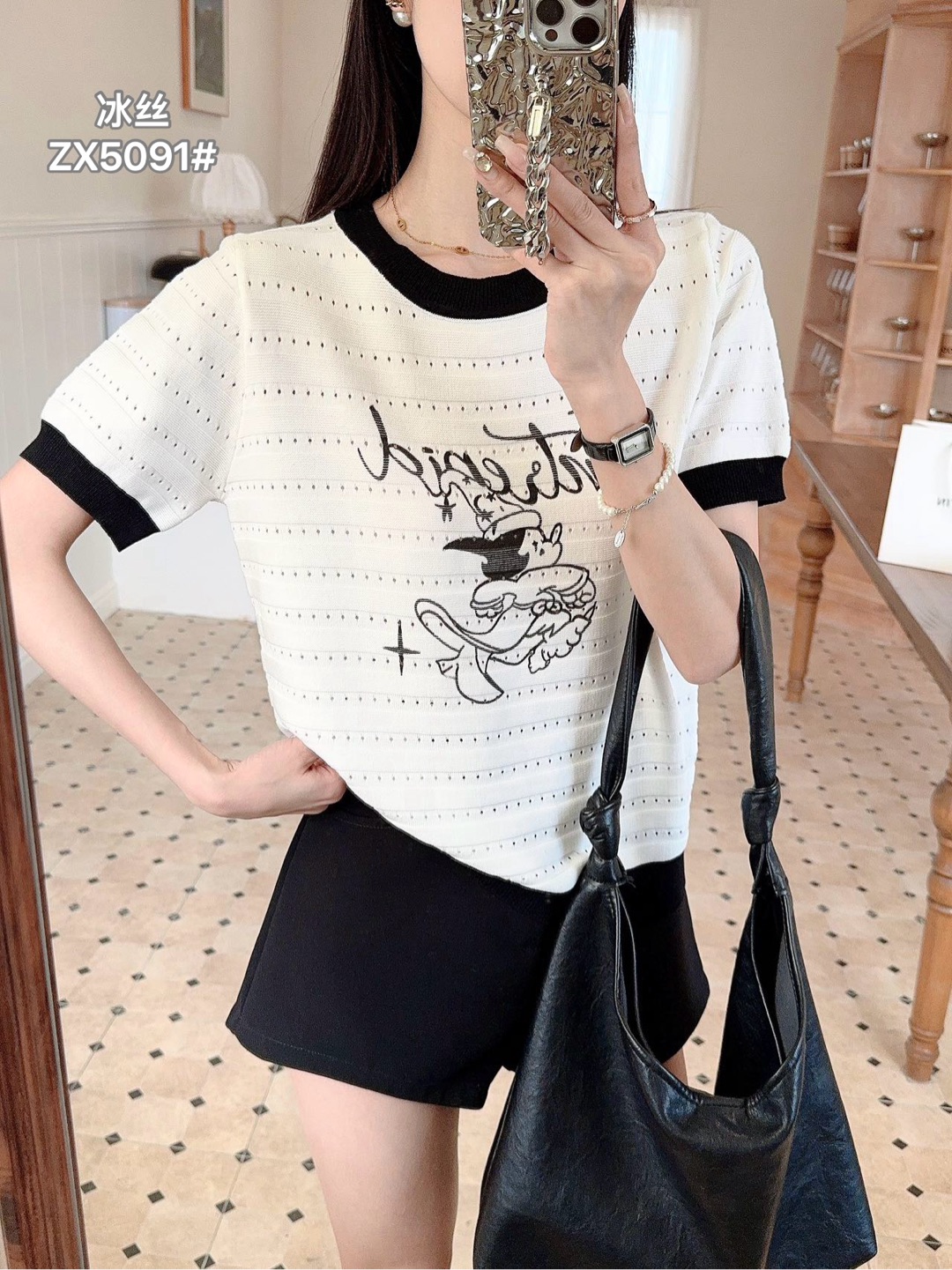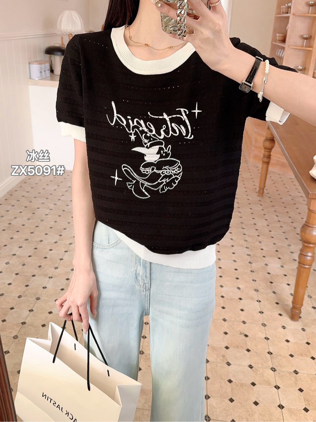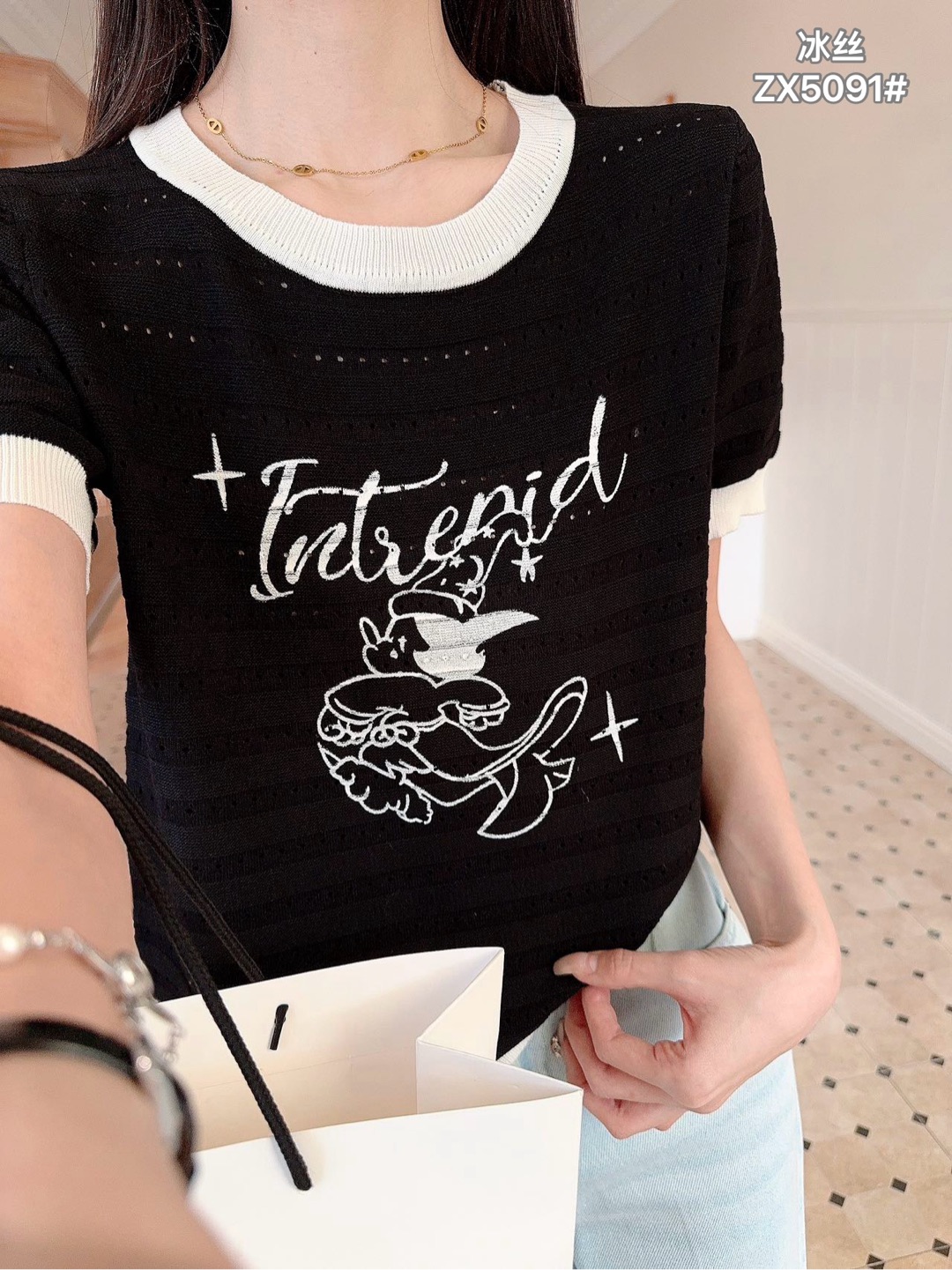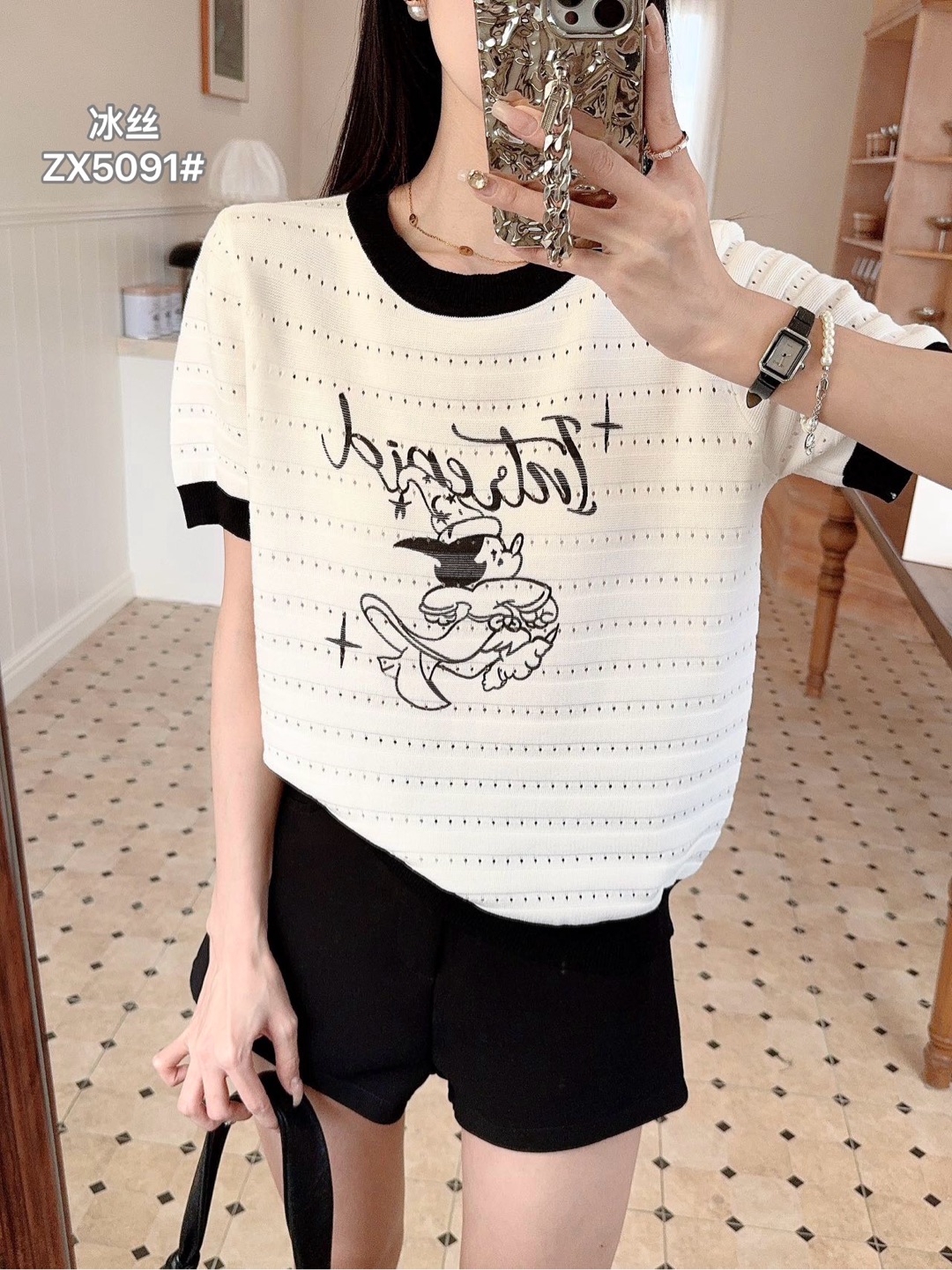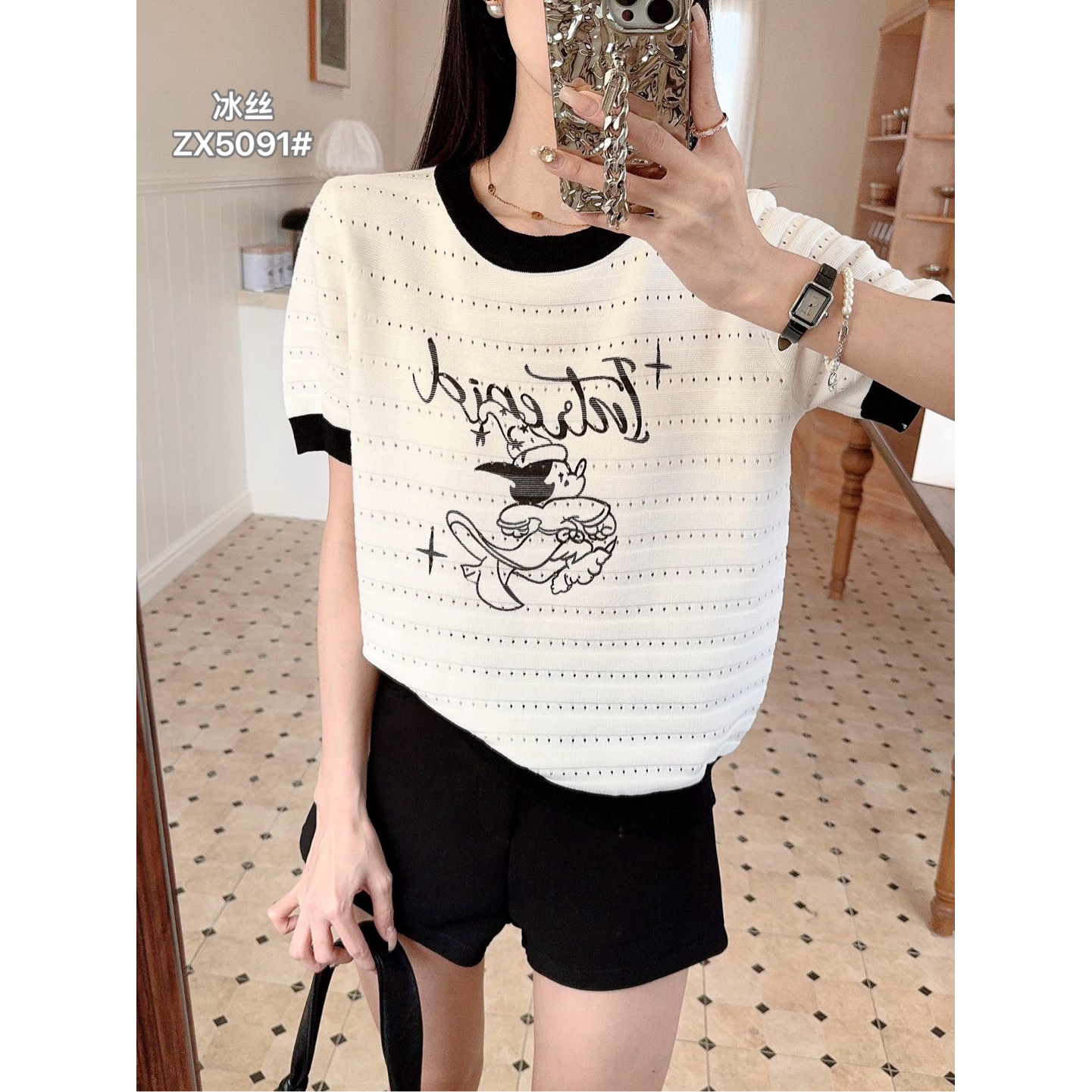 배색 반팔 니트 티셔츠 여성 여름 새로운 라운드 넥 디자인 센스 작은 대중 홀로우 아웃 몸매 가꾸기 쇼트 스타일 핫걸 맨위