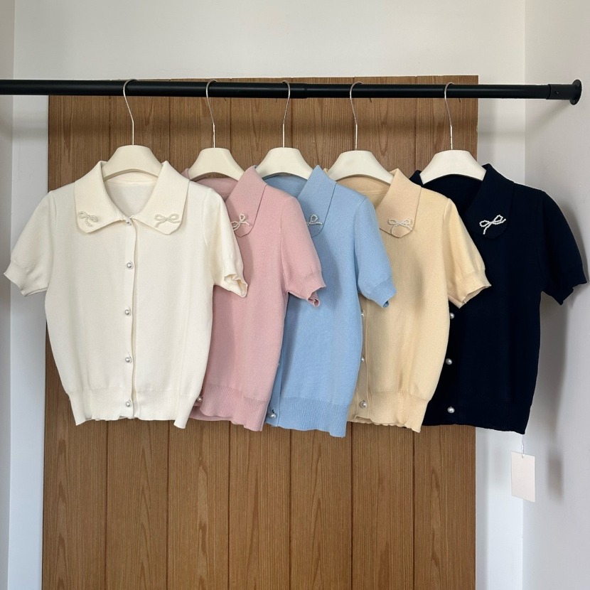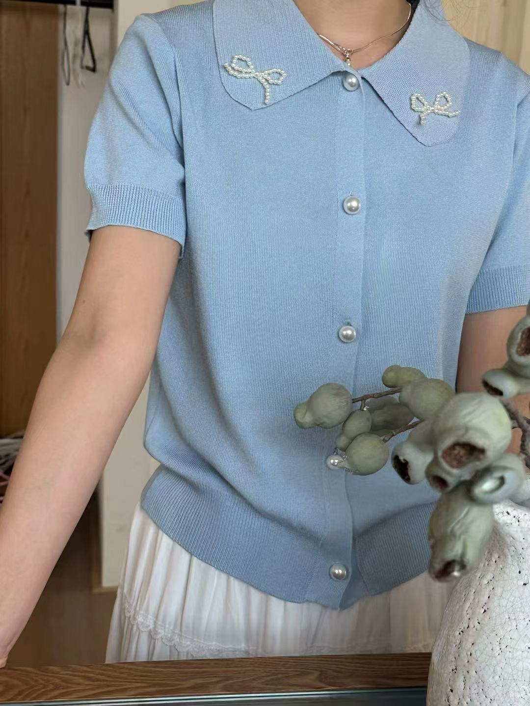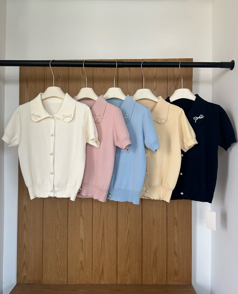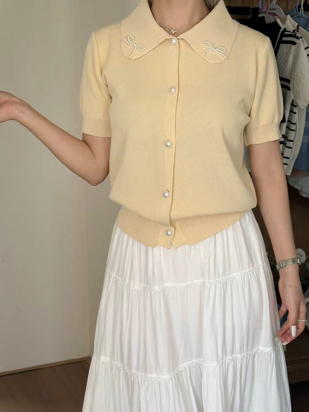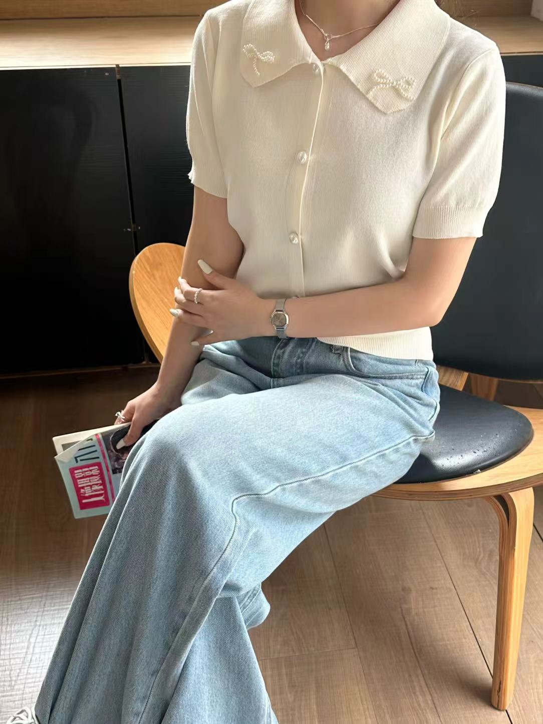 배색 POLO 칼라 니트 스웨터 티셔츠 반팔 여성 여름 새로운 한 부서 착용 가져 가라. 캐주얼 작은 키 슬림해 보이는 맨위