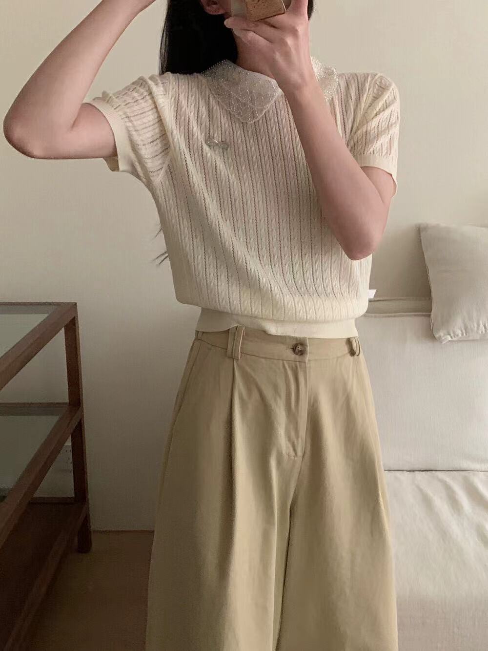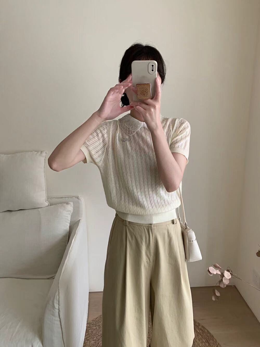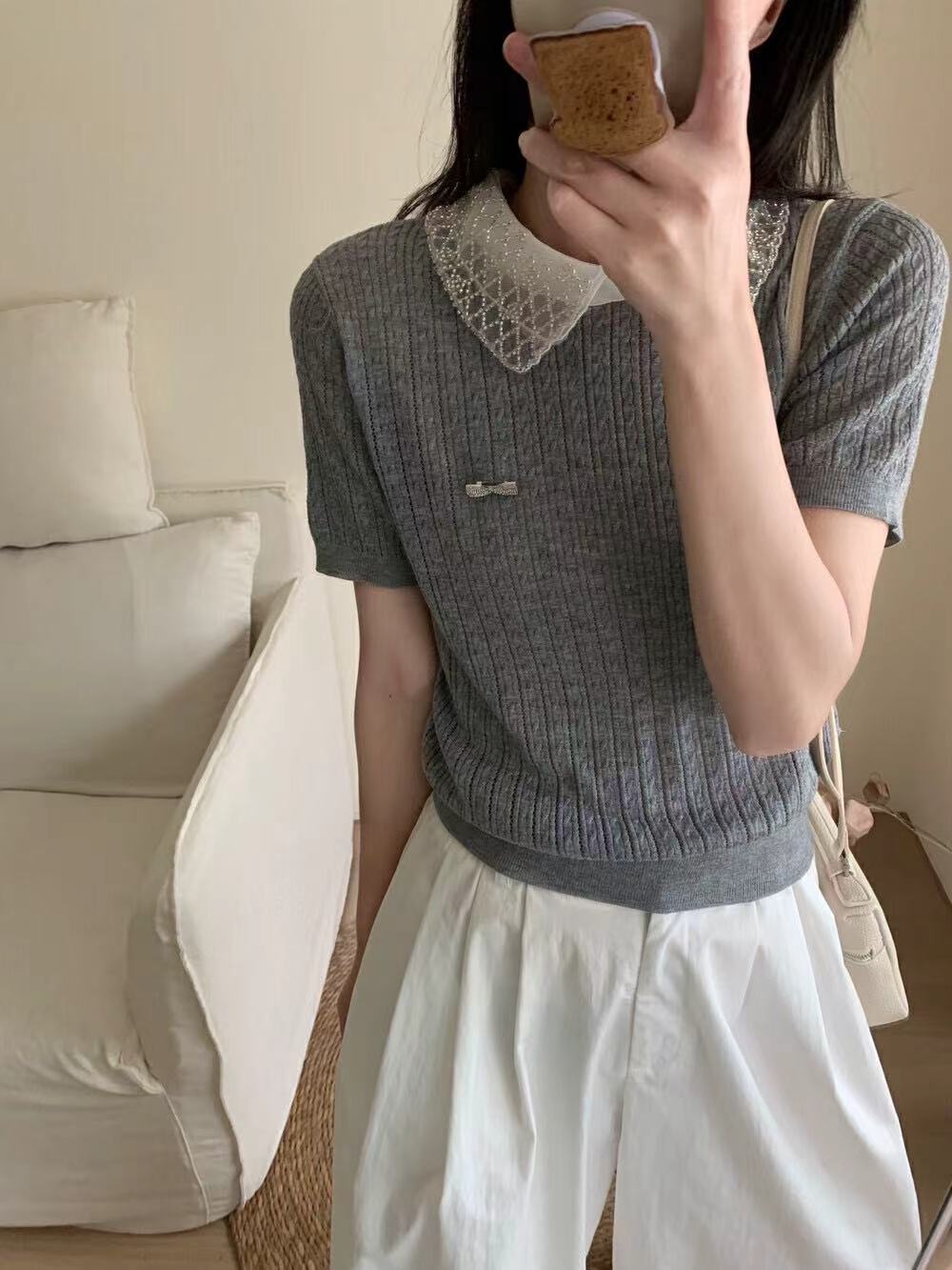 배색 POLO 칼라 니트 스웨터 티셔츠 반팔 여성 여름 새로운 한 부서 착용 가져 가라. 캐주얼 작은 키 슬림해 보이는 맨위