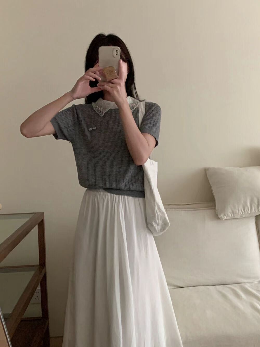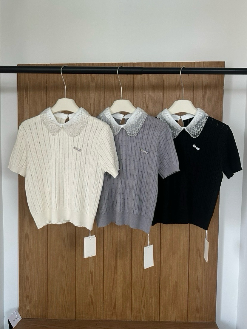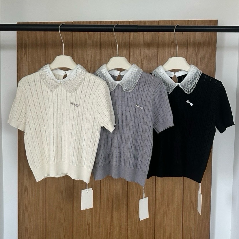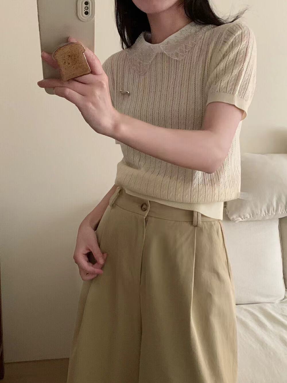 배색 POLO 칼라 니트 스웨터 티셔츠 반팔 여성 여름 새로운 한 부서 착용 가져 가라. 캐주얼 작은 키 슬림해 보이는 맨위