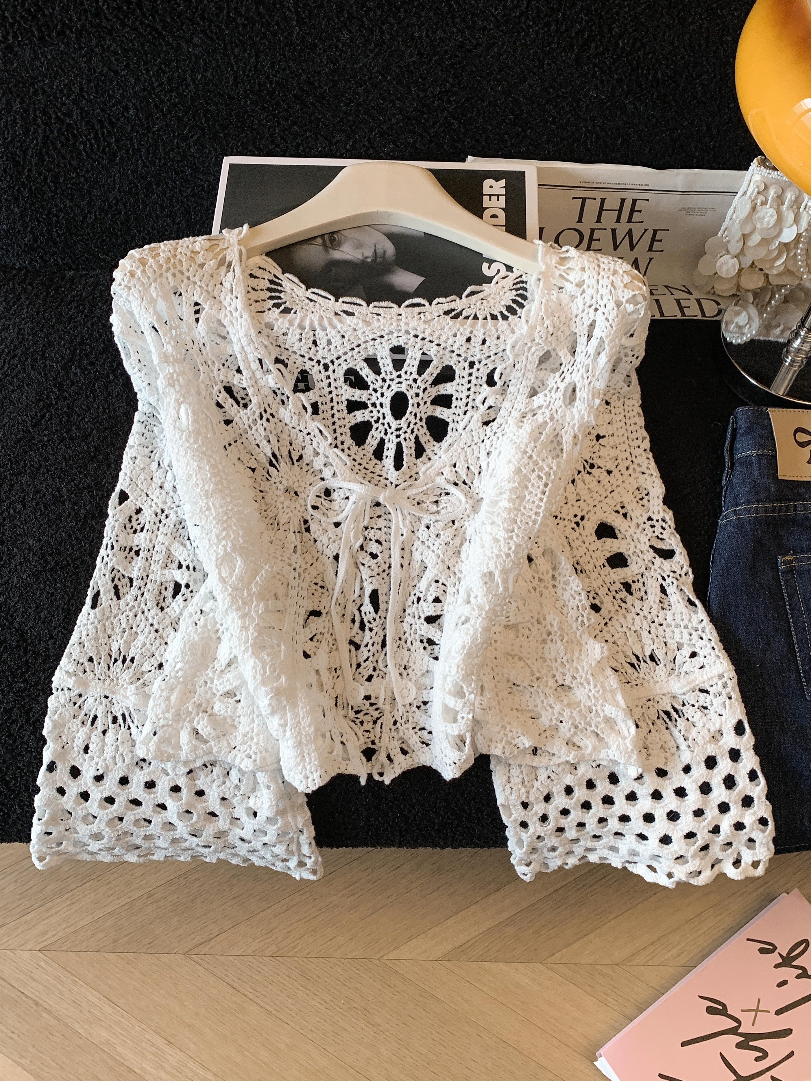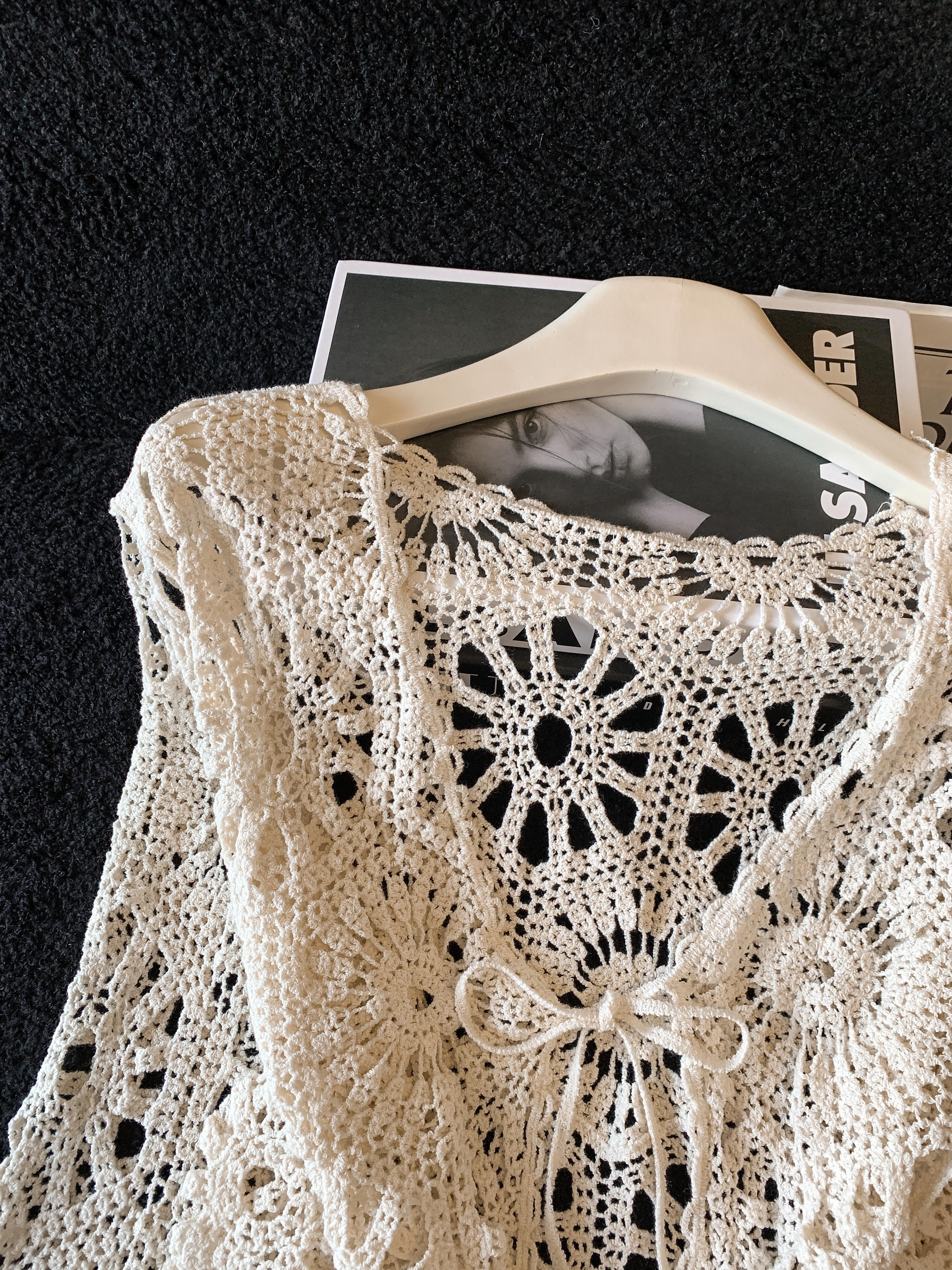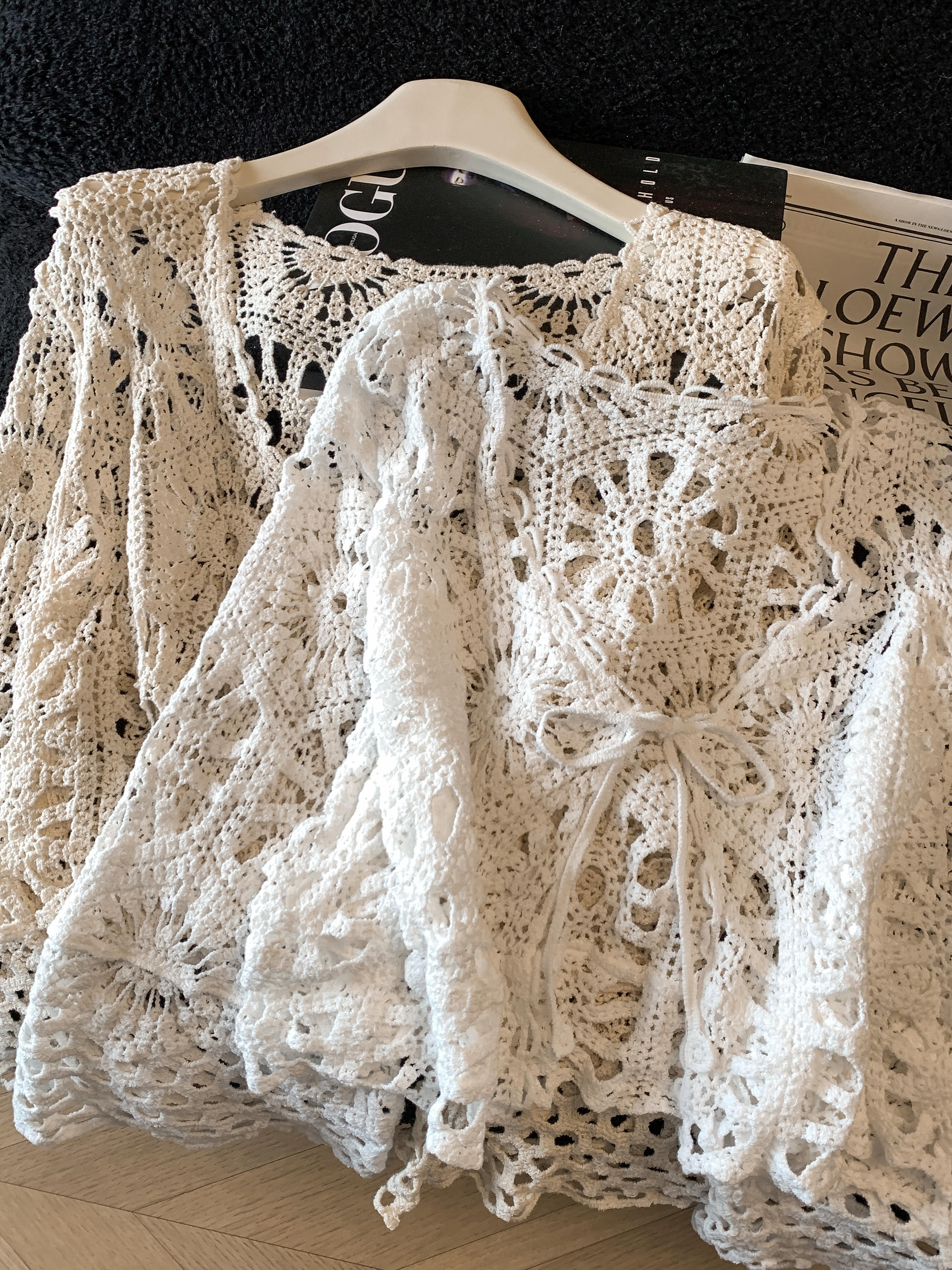 실사 2026 자수 홀로우 아웃 니트 블라우스 여름 외부 가져 가라. 해변가 휴가 바람 긴팔 맨위 오픈 가디건 태양 보호 셔츠 여성