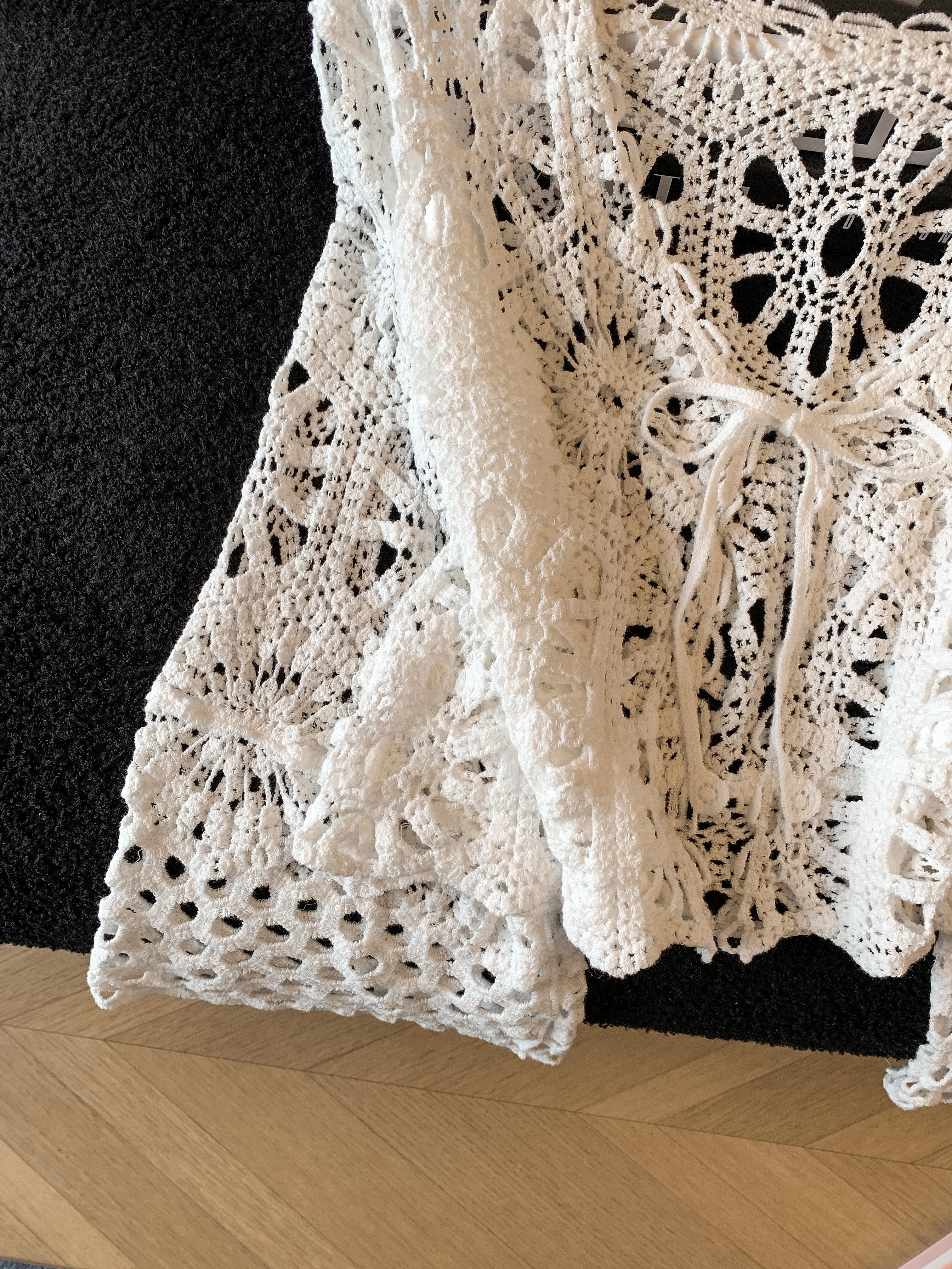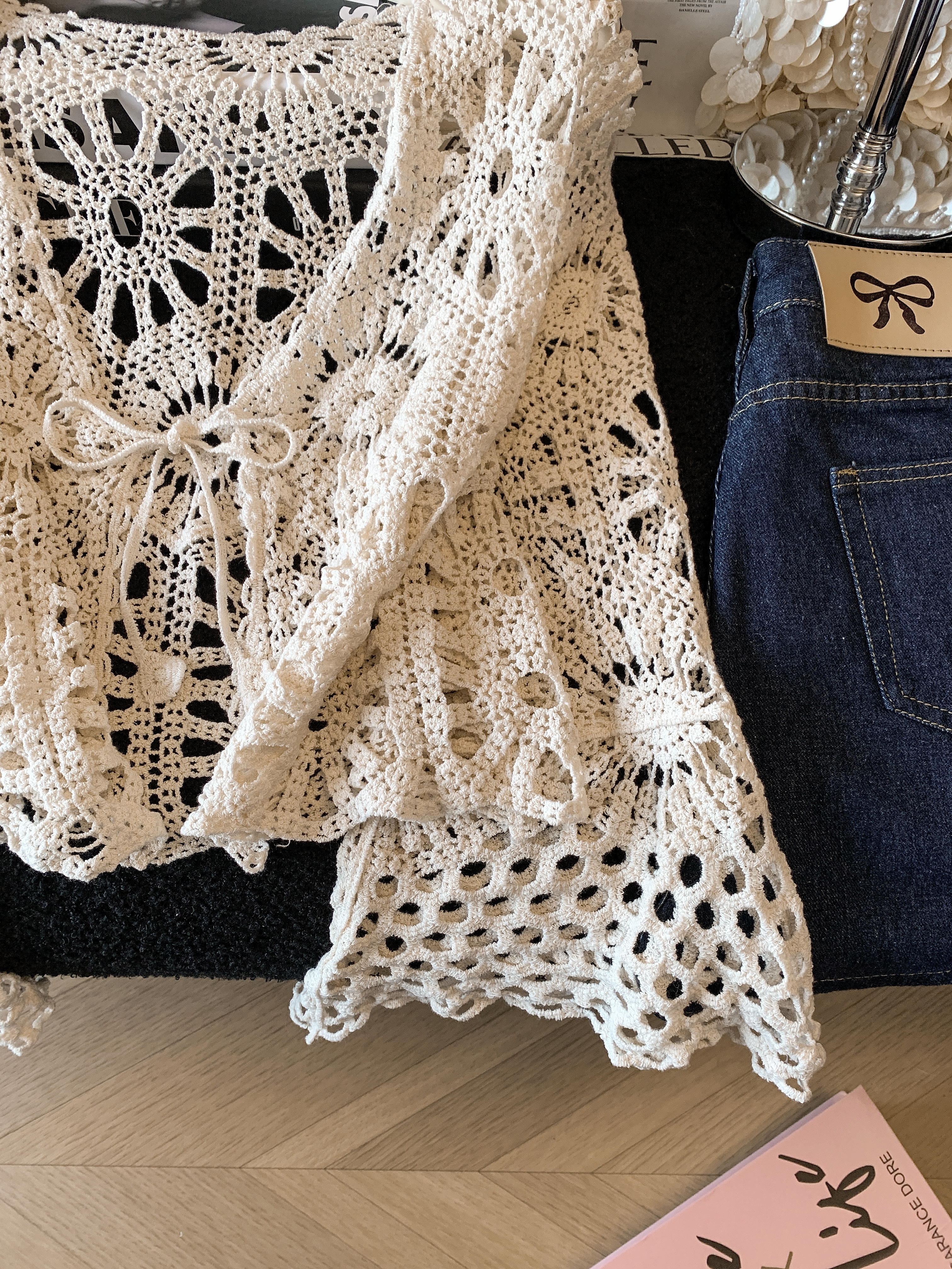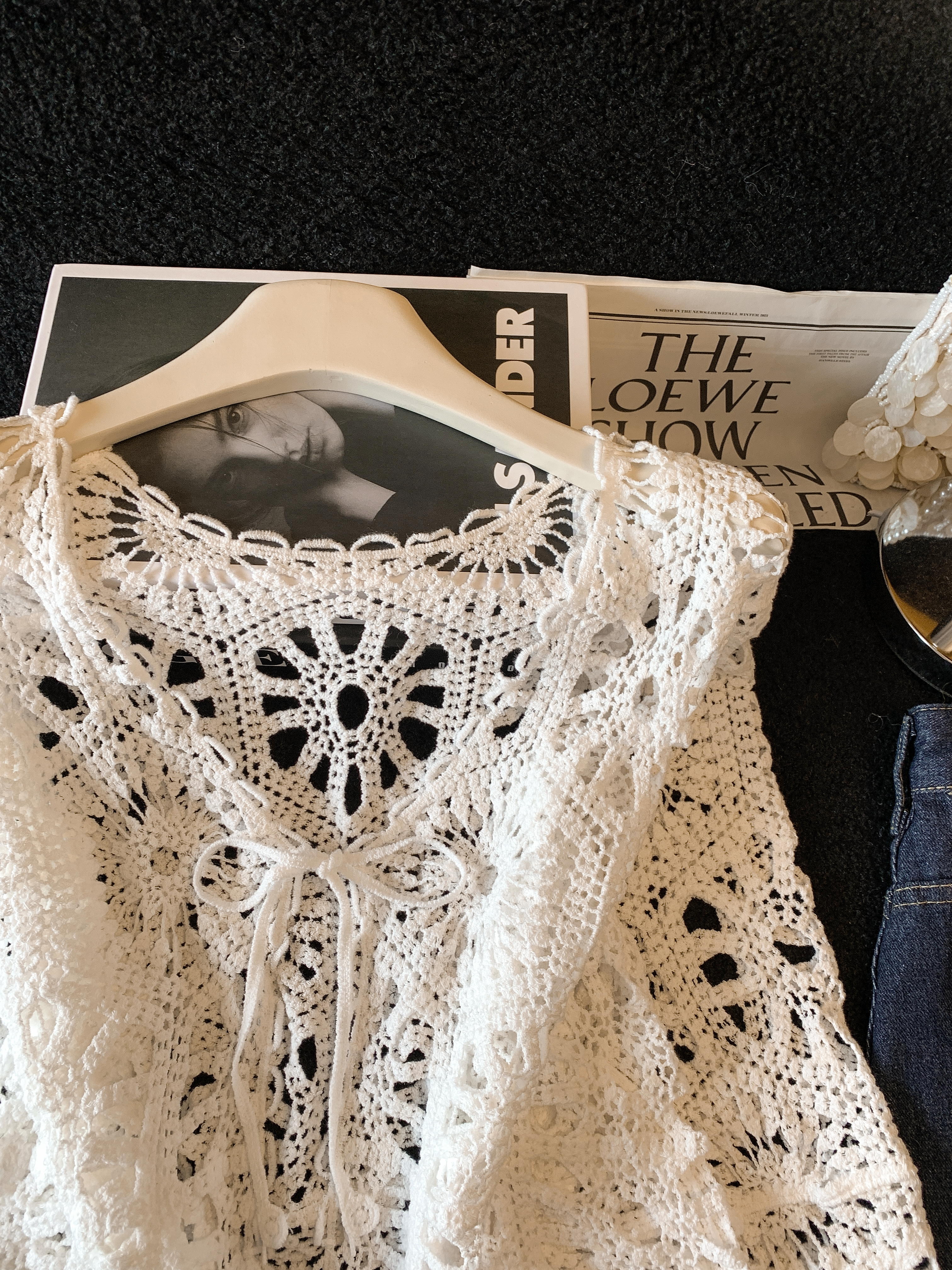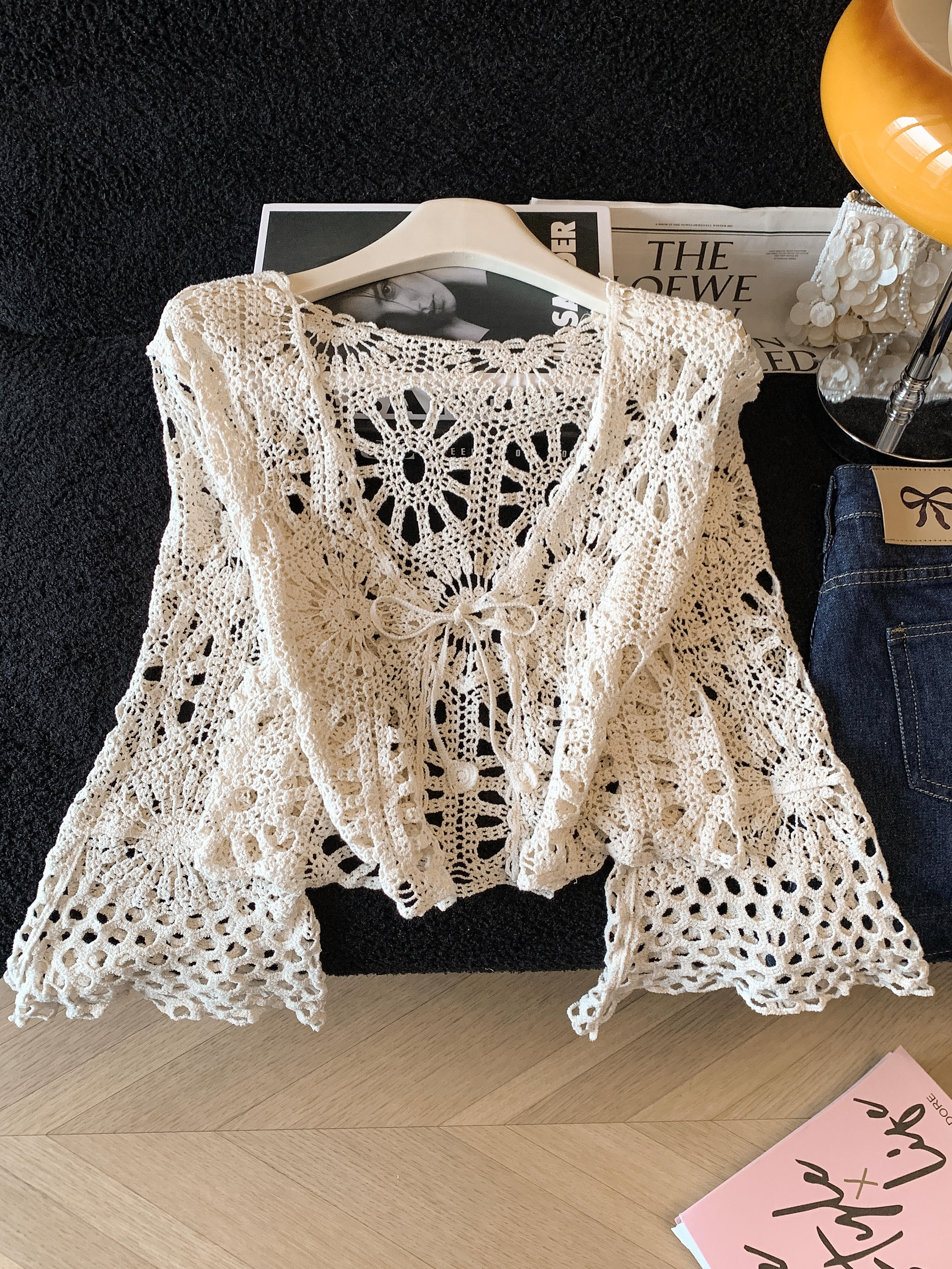 실사 2026 자수 홀로우 아웃 니트 블라우스 여름 외부 가져 가라. 해변가 휴가 바람 긴팔 맨위 오픈 가디건 태양 보호 셔츠 여성