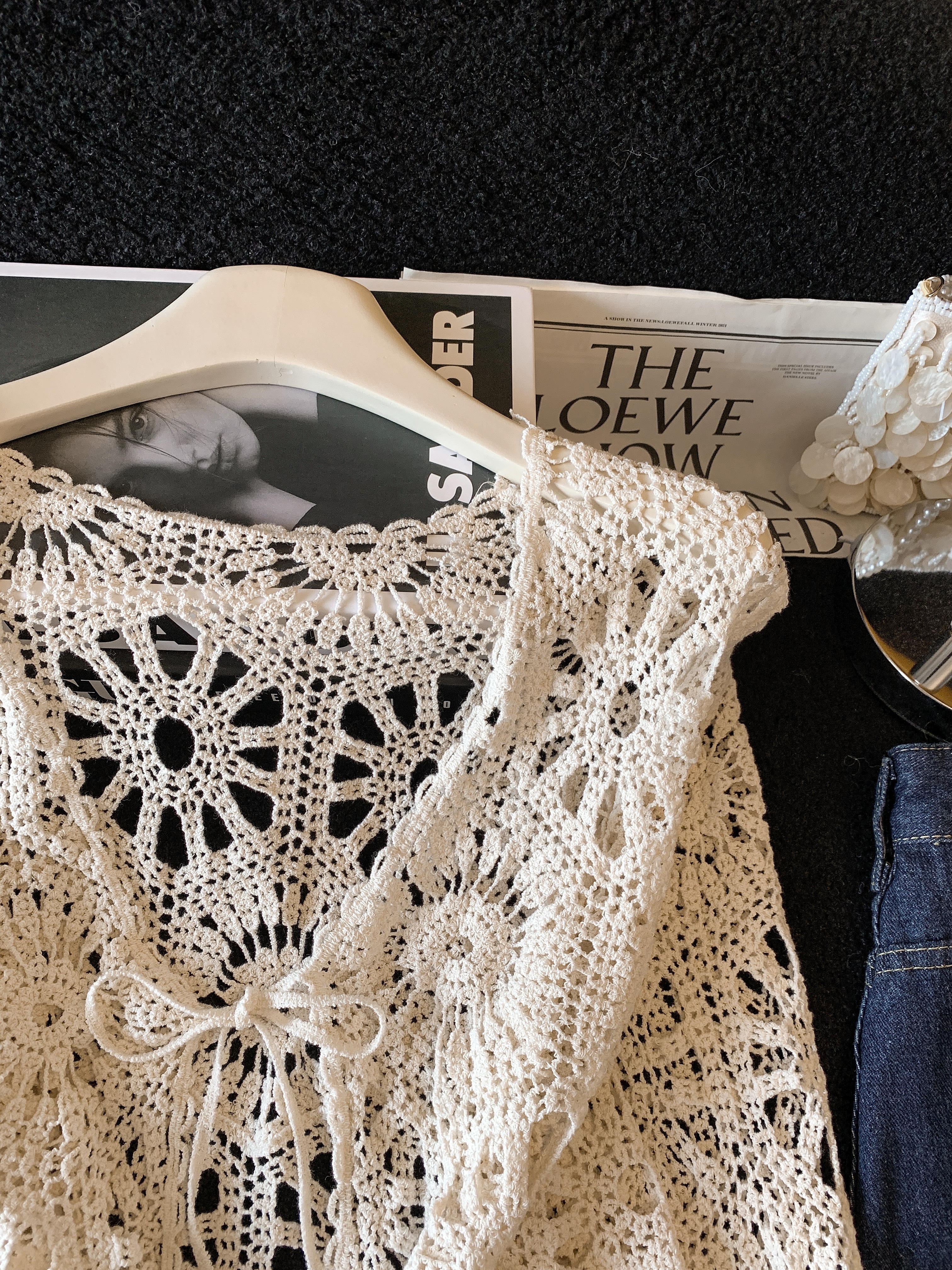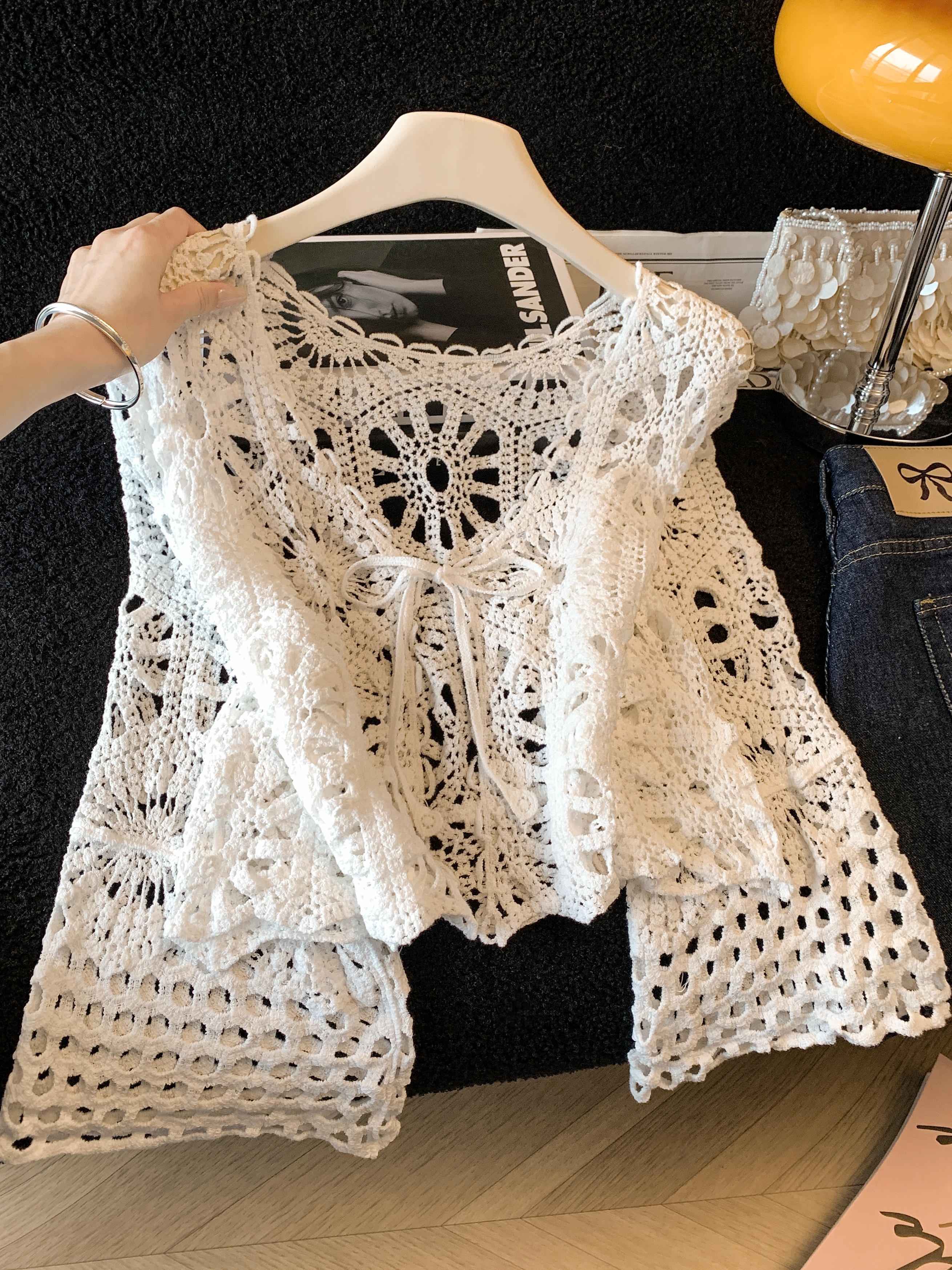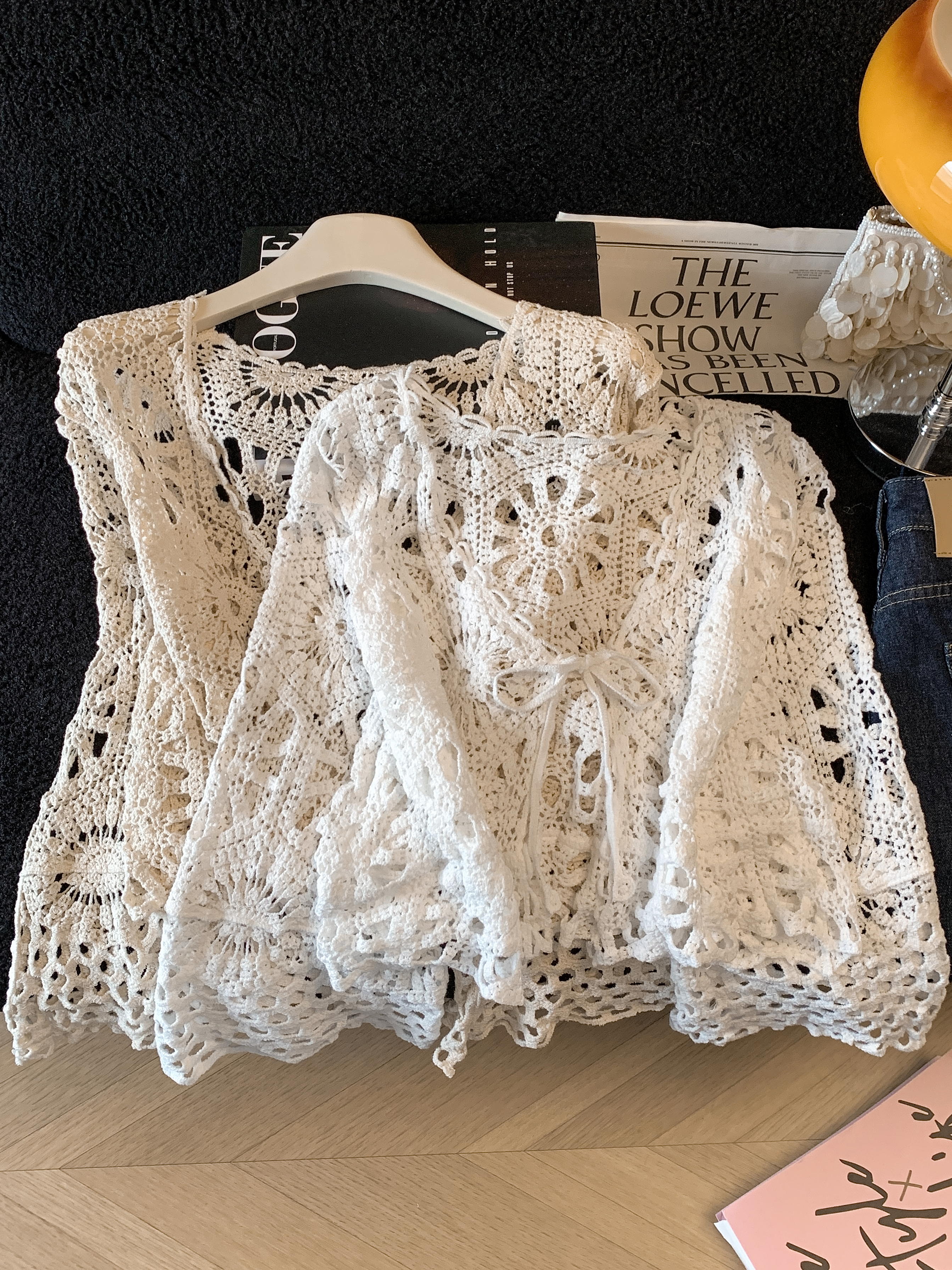2026 새로운 봄 자외선 차단 오픈 가디건 홀로우 아웃 재킷 얇은 스타일 휴가 바람 해변 레이스 셔츠 루즈핏 맨위 숄