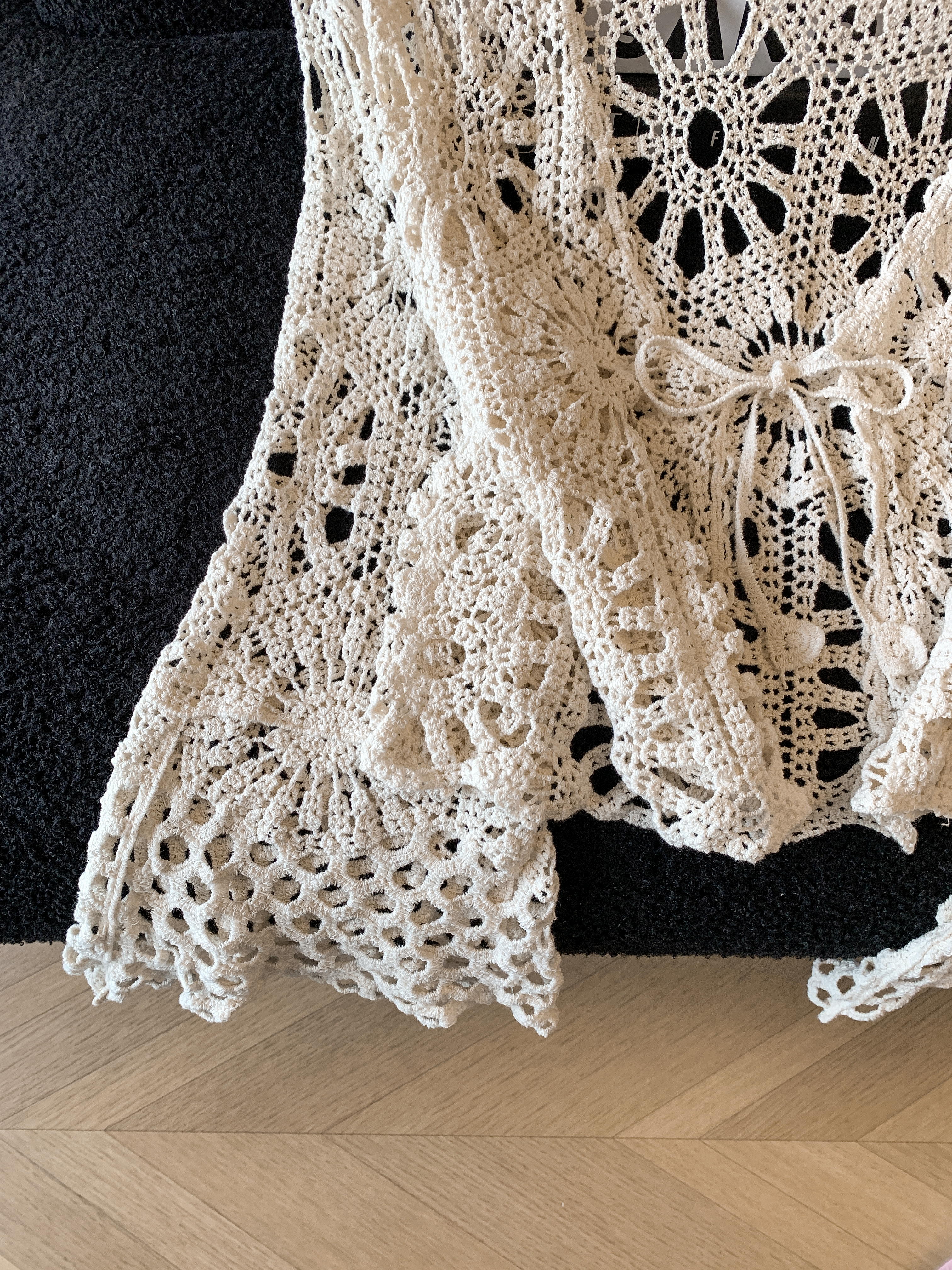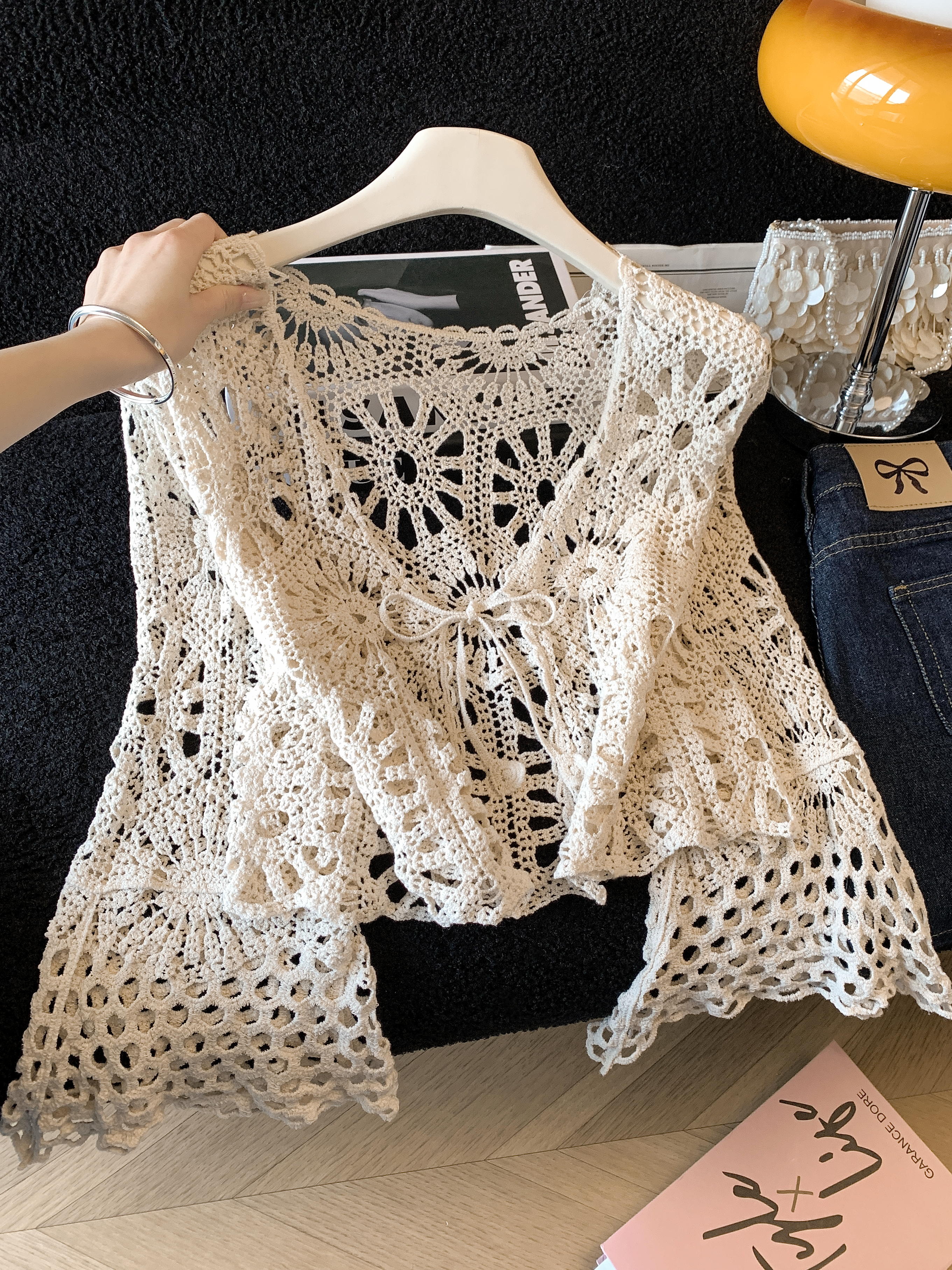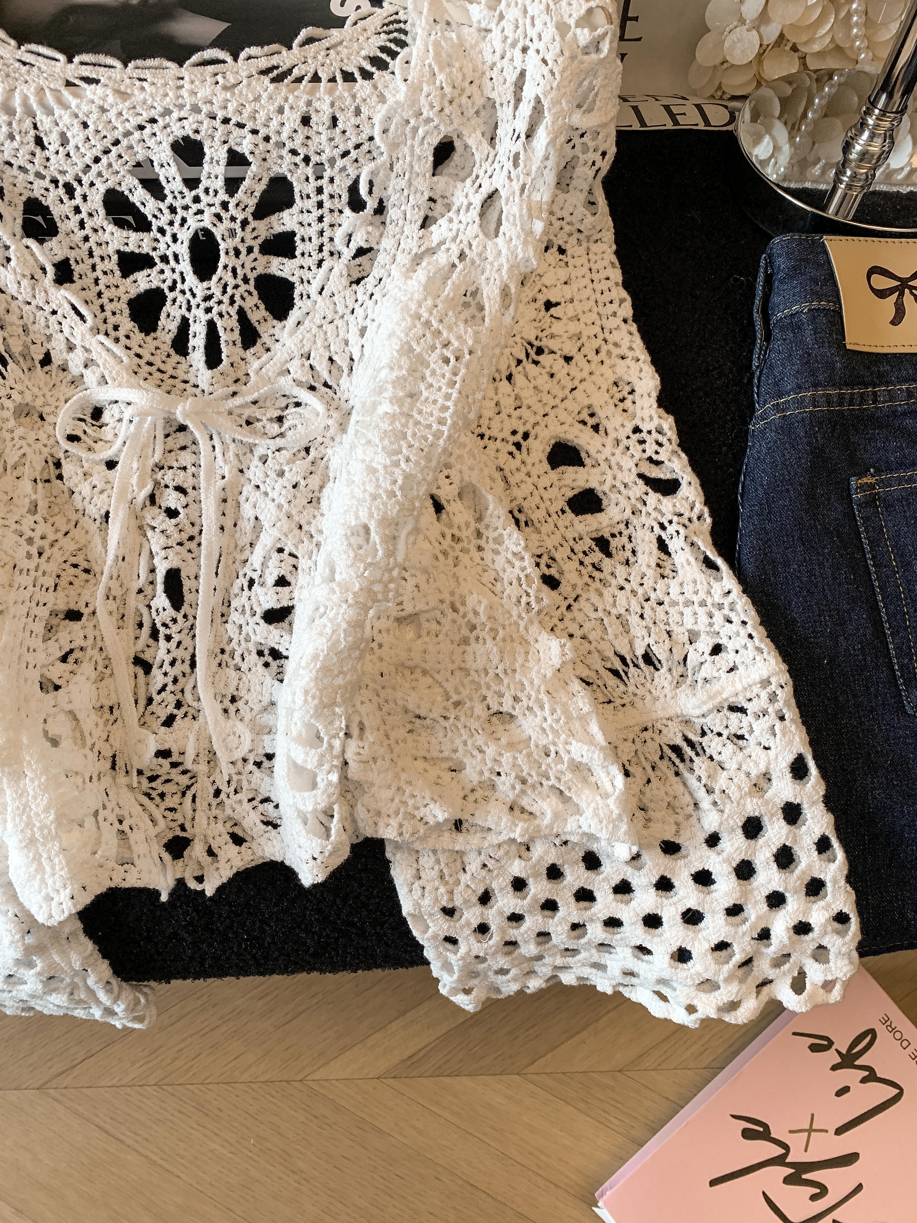 2026 새로운 봄 자외선 차단 오픈 가디건 홀로우 아웃 재킷 얇은 스타일 휴가 바람 해변 레이스 셔츠 루즈핏 맨위 숄