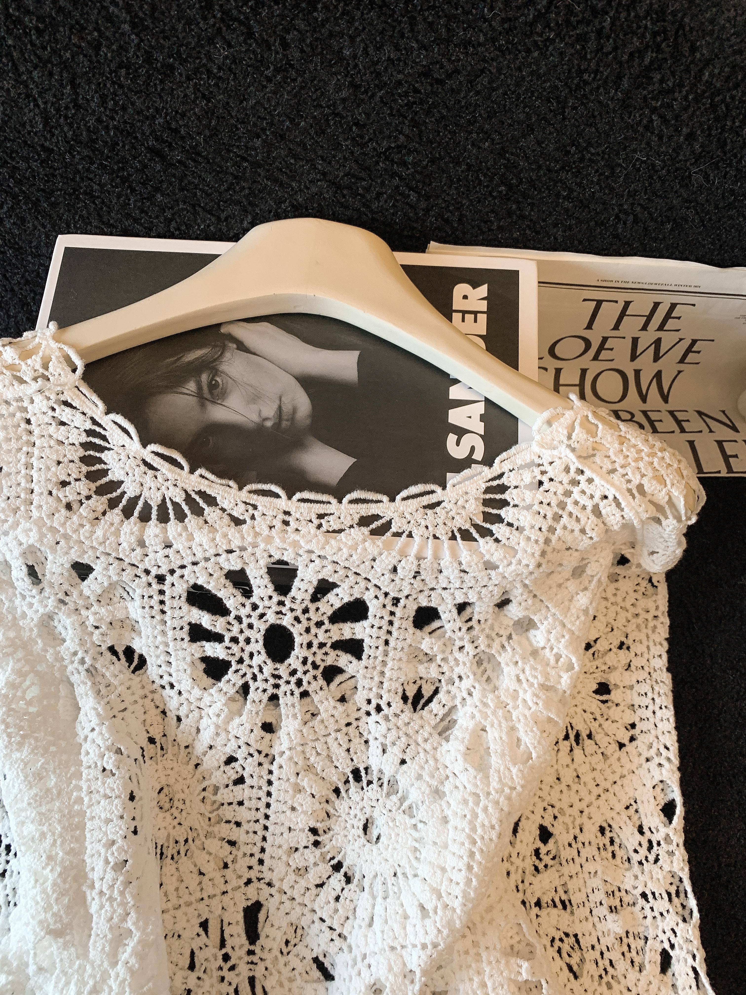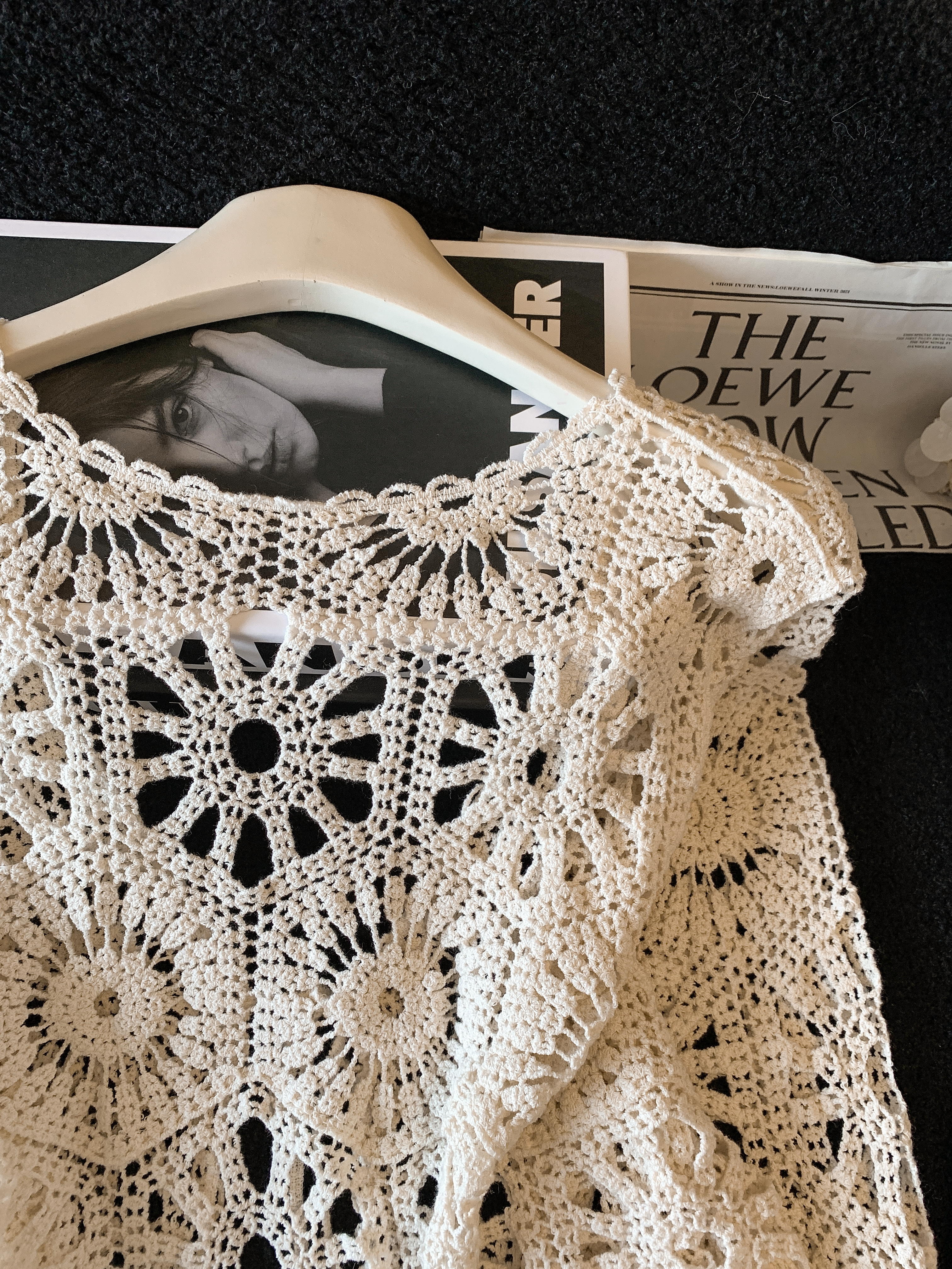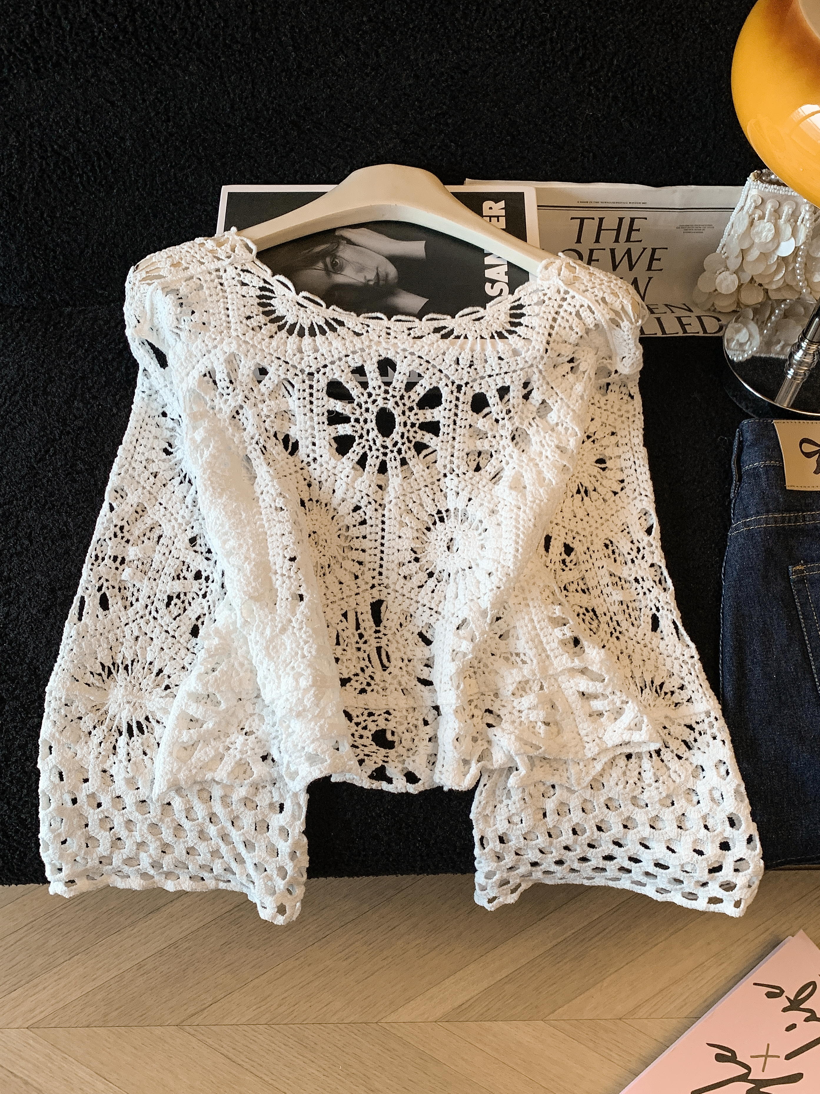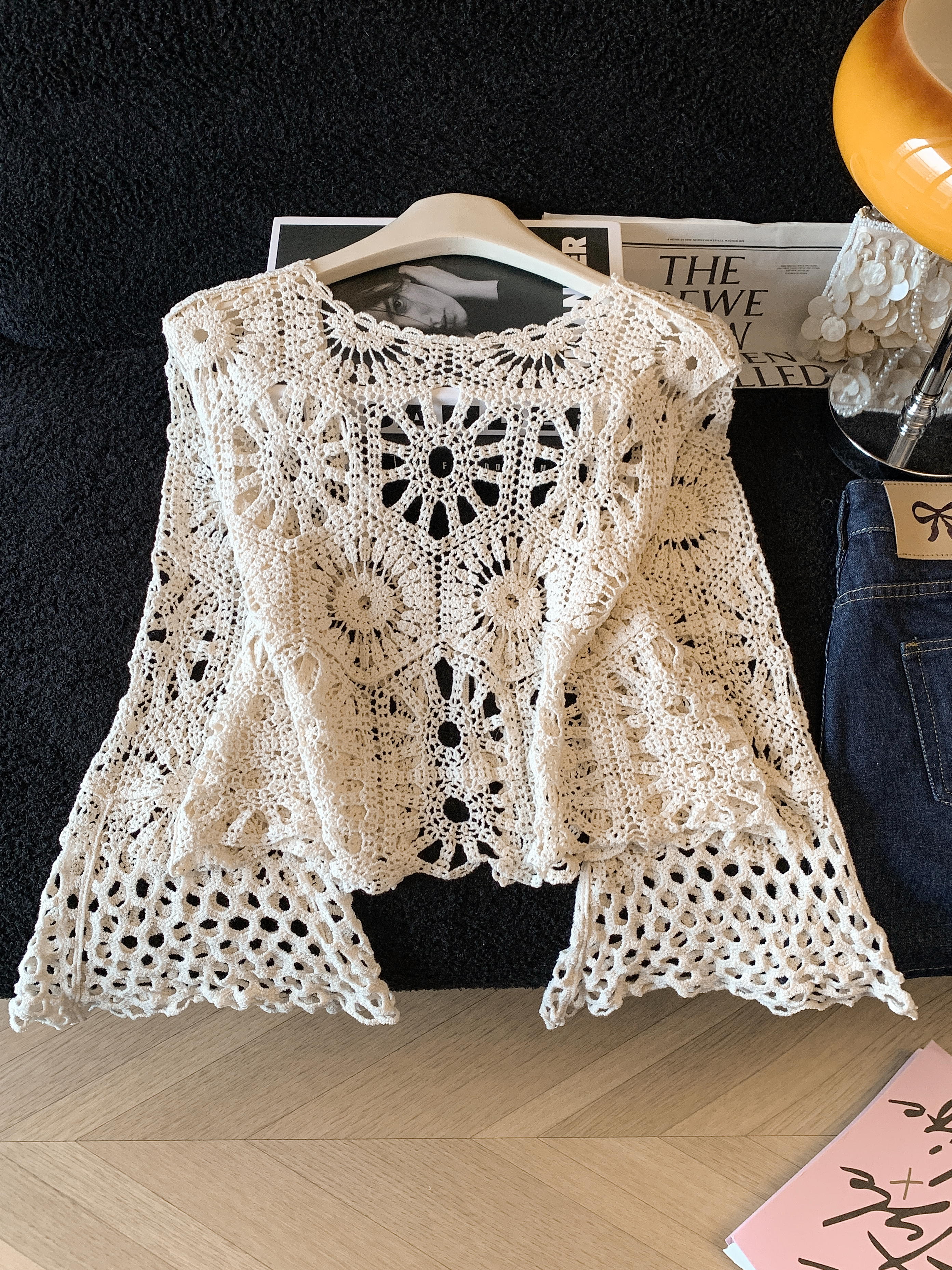 여름 새로운 홀로우 아웃 통기성 한국 스타일 니트 스웨터 여성 느긋한 바람 질감 센스 슬림해 보이는 Feifei 소매 맨위